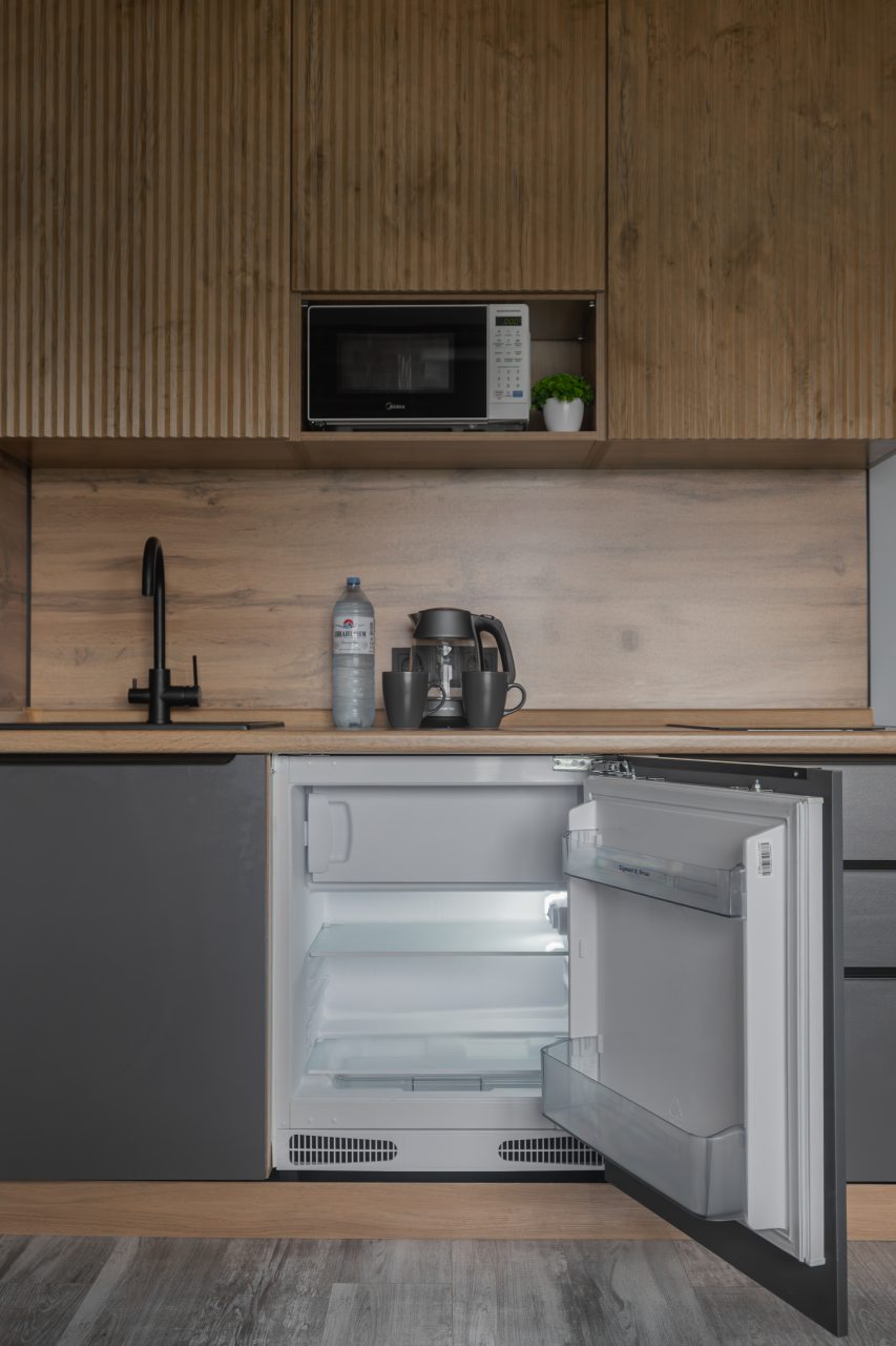 На кухне есть СВЧ-печь, электрический чайник, холодильник, духовой шкаф, все необходимые приборы. Перекусить можно в кафе «Здрасте».