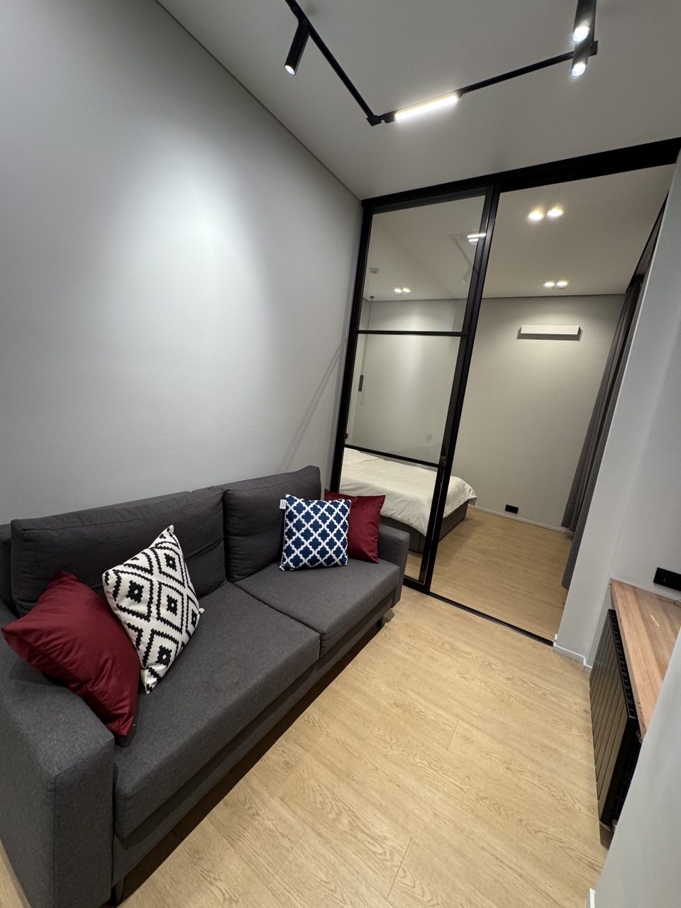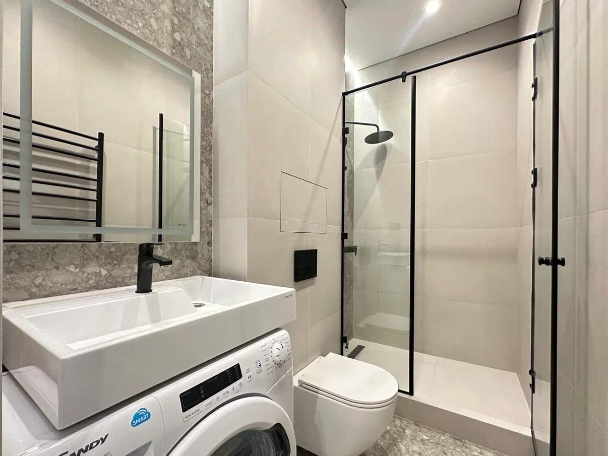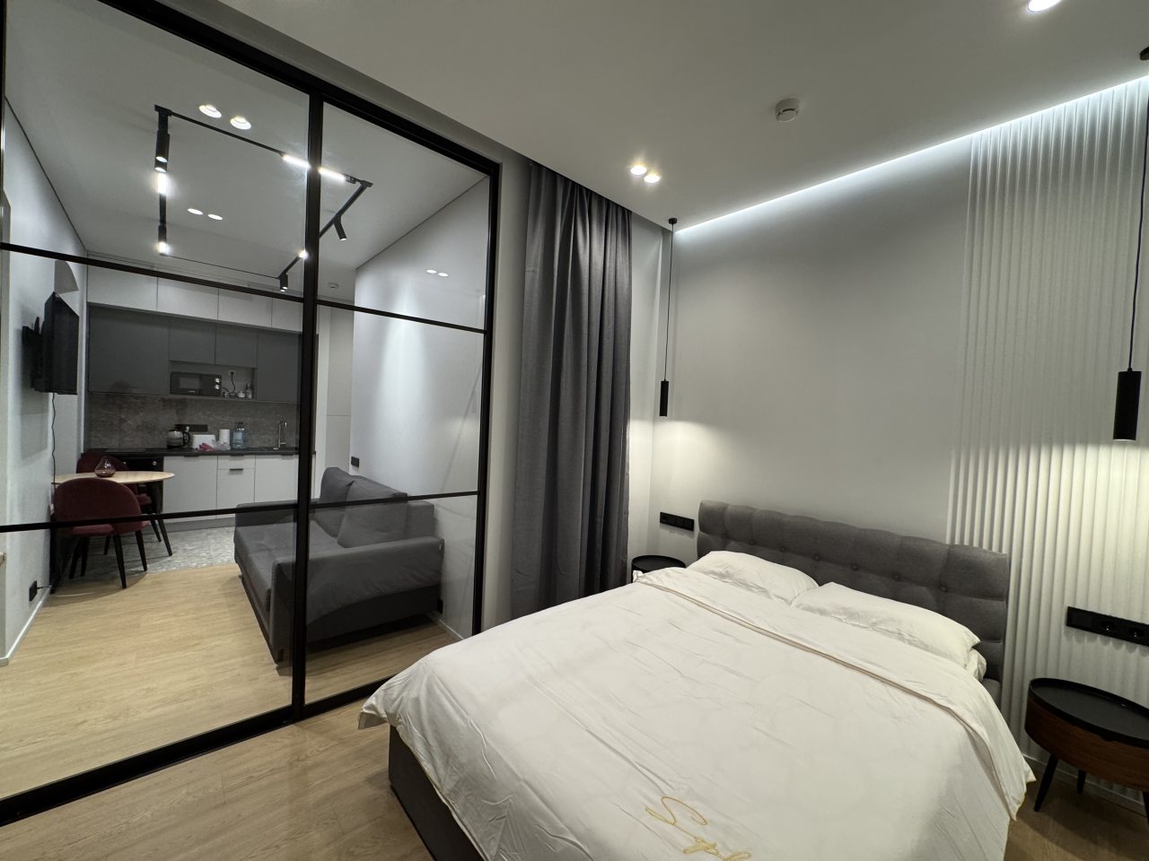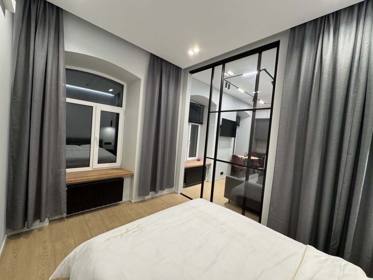 Внутри вас ожидает стильный интерьер, двуспальная кровать с качественным матрасом, различные сценарии освещения, мягкий диван, ЖК-телевизор, вместительный шкаф, санузел с душевой и стиральной машиной.
