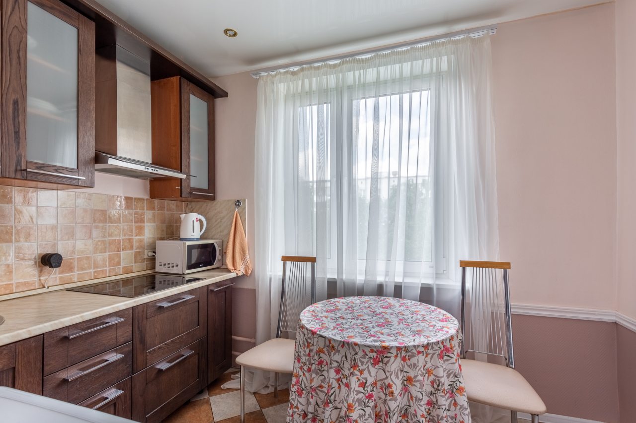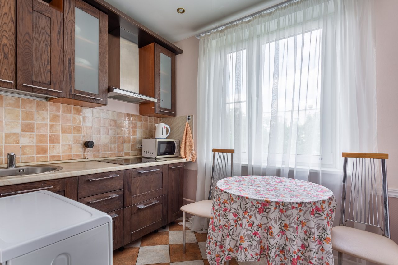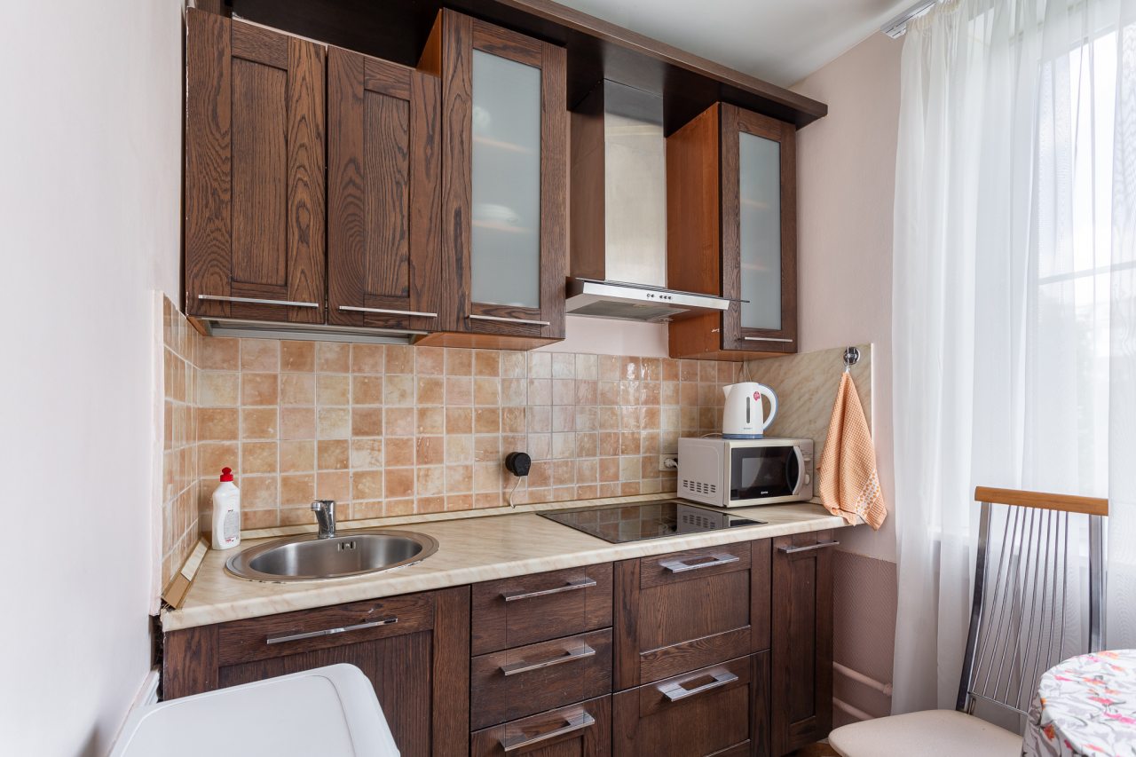 Интерьер уютной кухни выполнен в теплых цветах, а также она оснащена необходимой бытовой техникой: микроволновая печь и чайник, варочная панель, холодильник. В этом же доме находится супермаркет, где можно закупить продуктов для приготовления блюд.