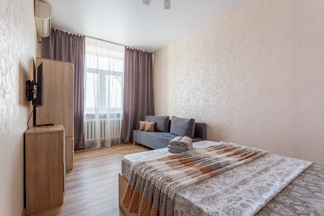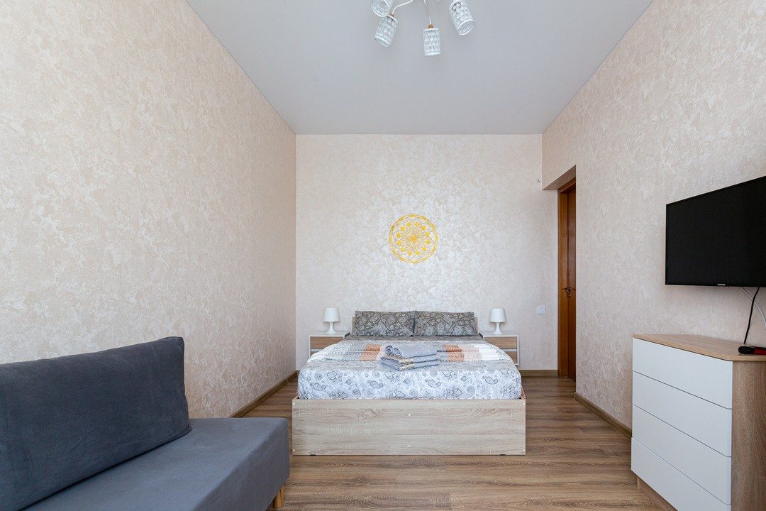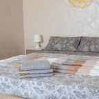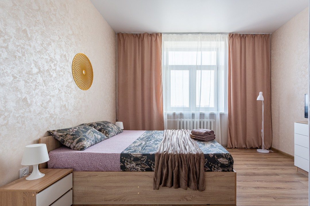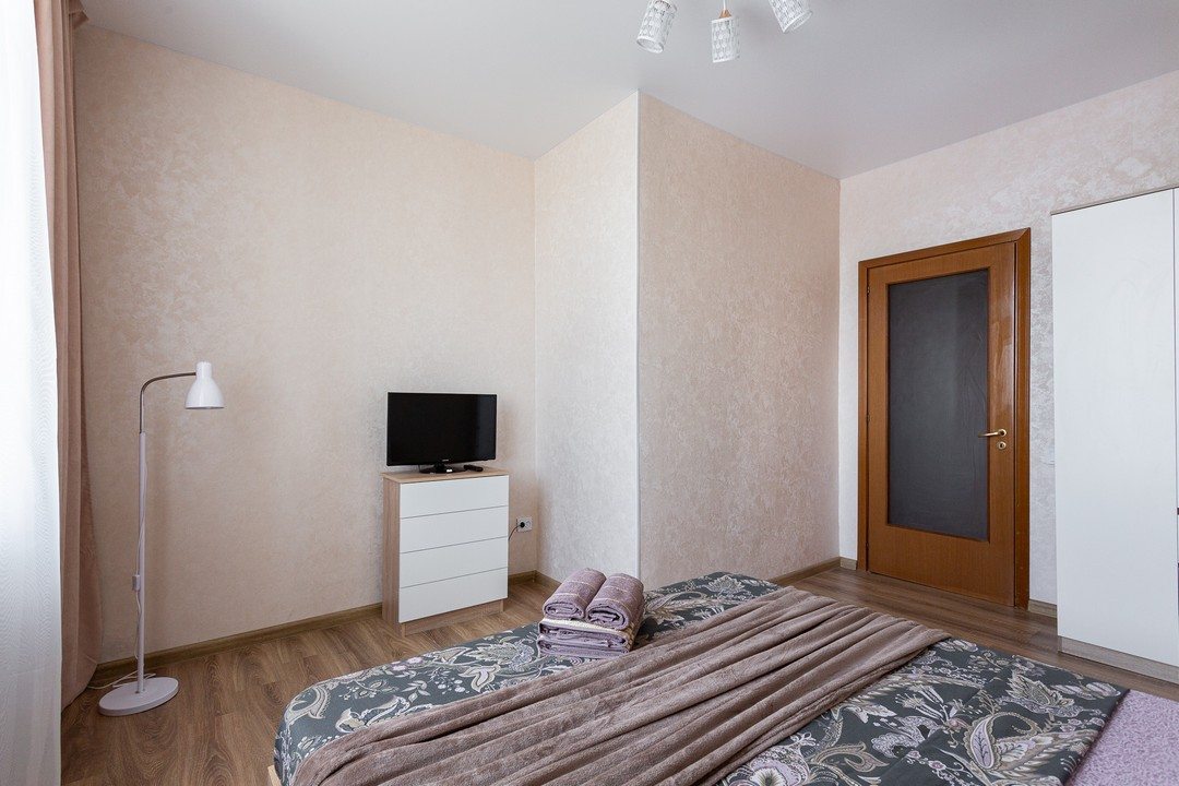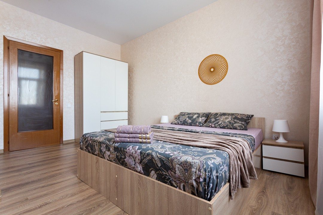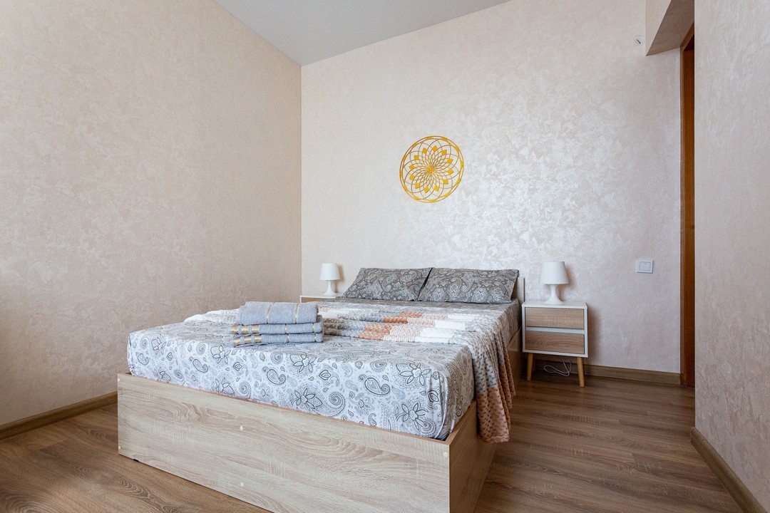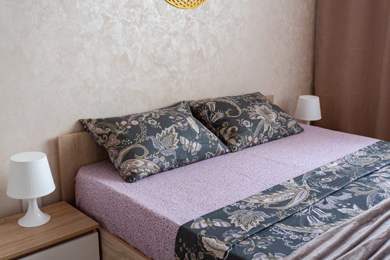 Внутри вас ожидает удобная двуспальная кровать, вместительный шкаф, мягкий диван, прикроватные тумбы и лампы, затемненные шторы, телевизор, стиральная машина, санузел с душевой и другой необходимой сантехникой.