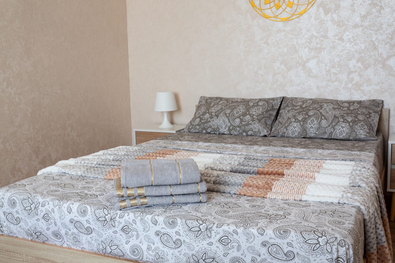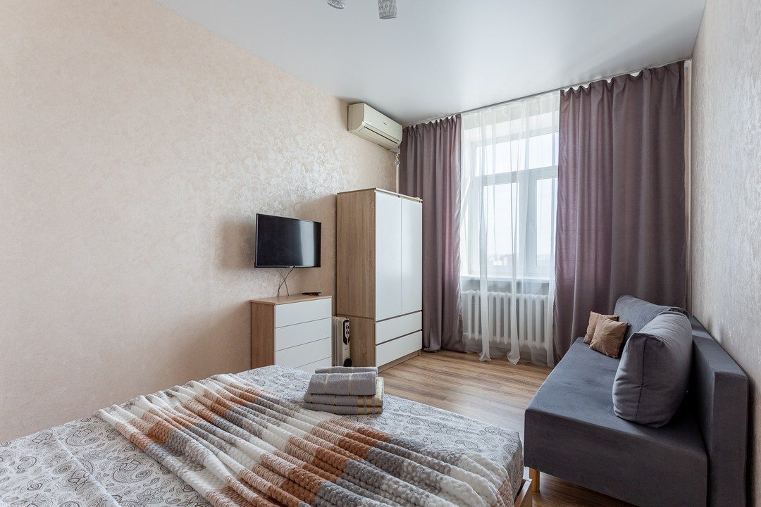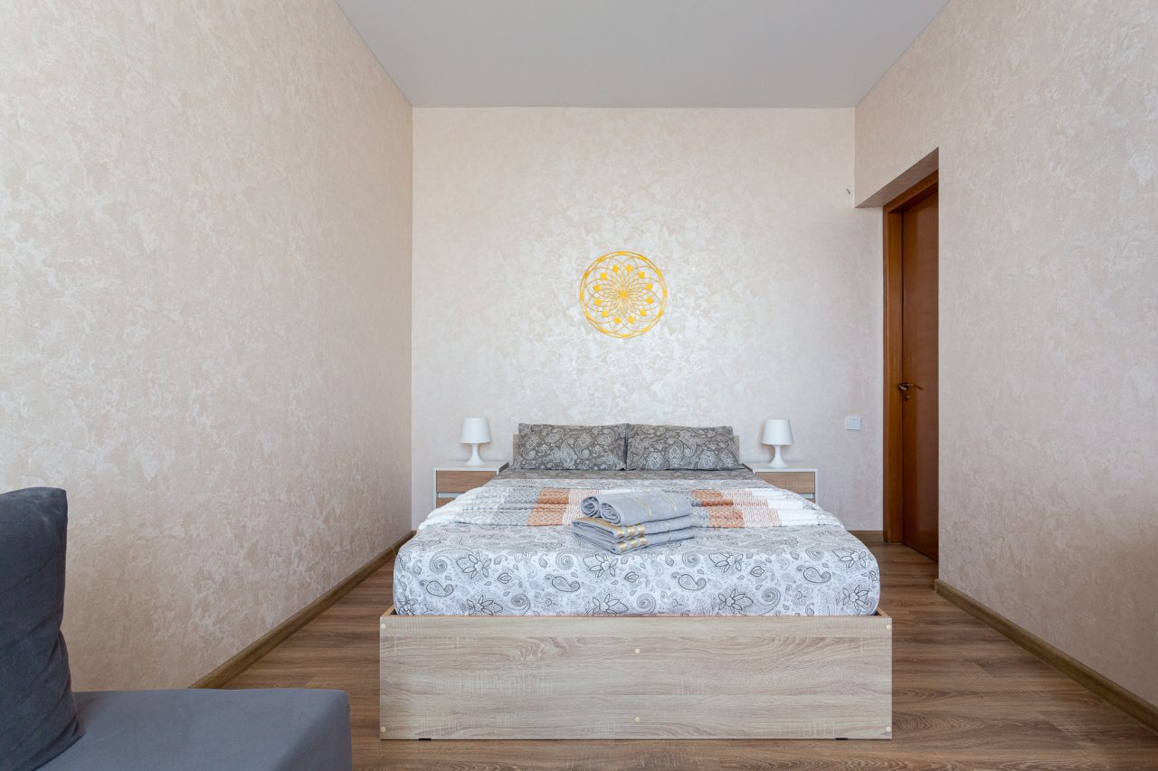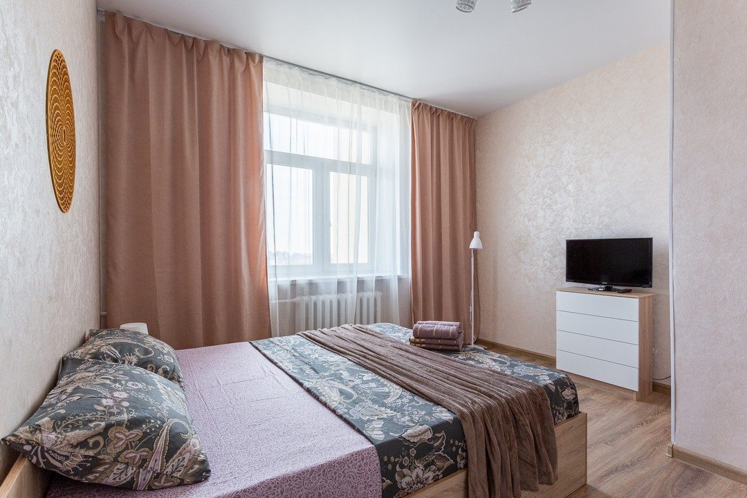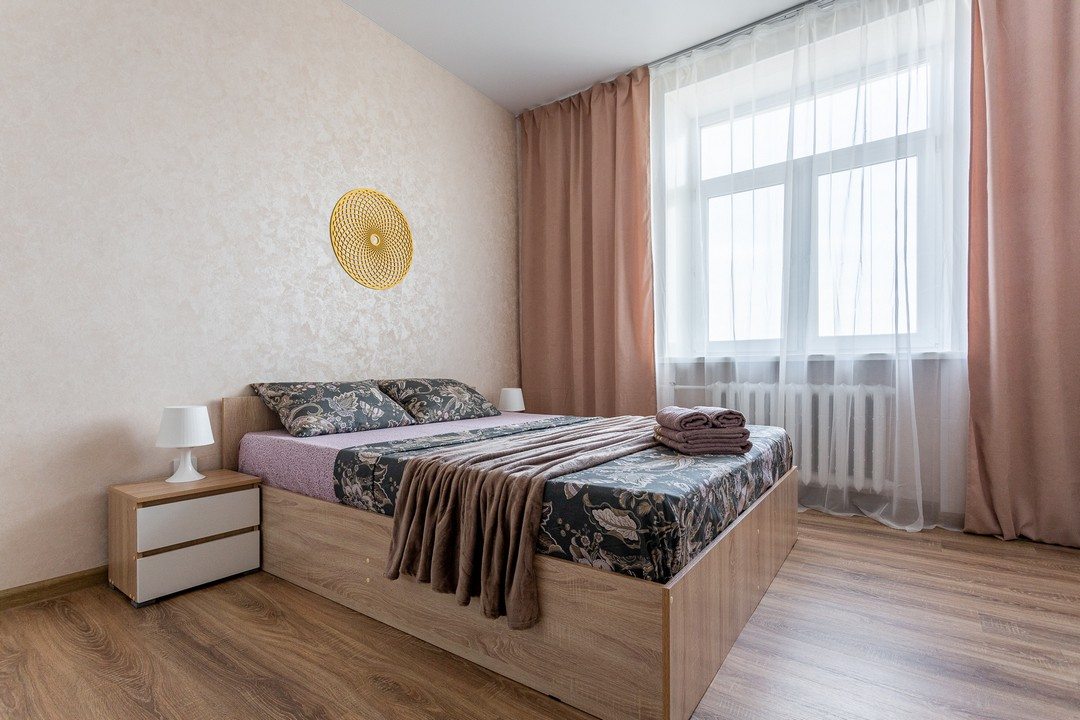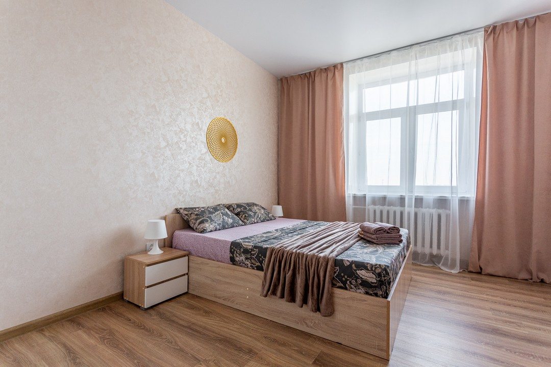 Внутри вас ожидает удобная двуспальная кровать, вместительный шкаф, мягкий диван, прикроватные тумбы и лампы, затемненные шторы, телевизор, стиральная машина, санузел с душевой и другой необходимой сантехникой.