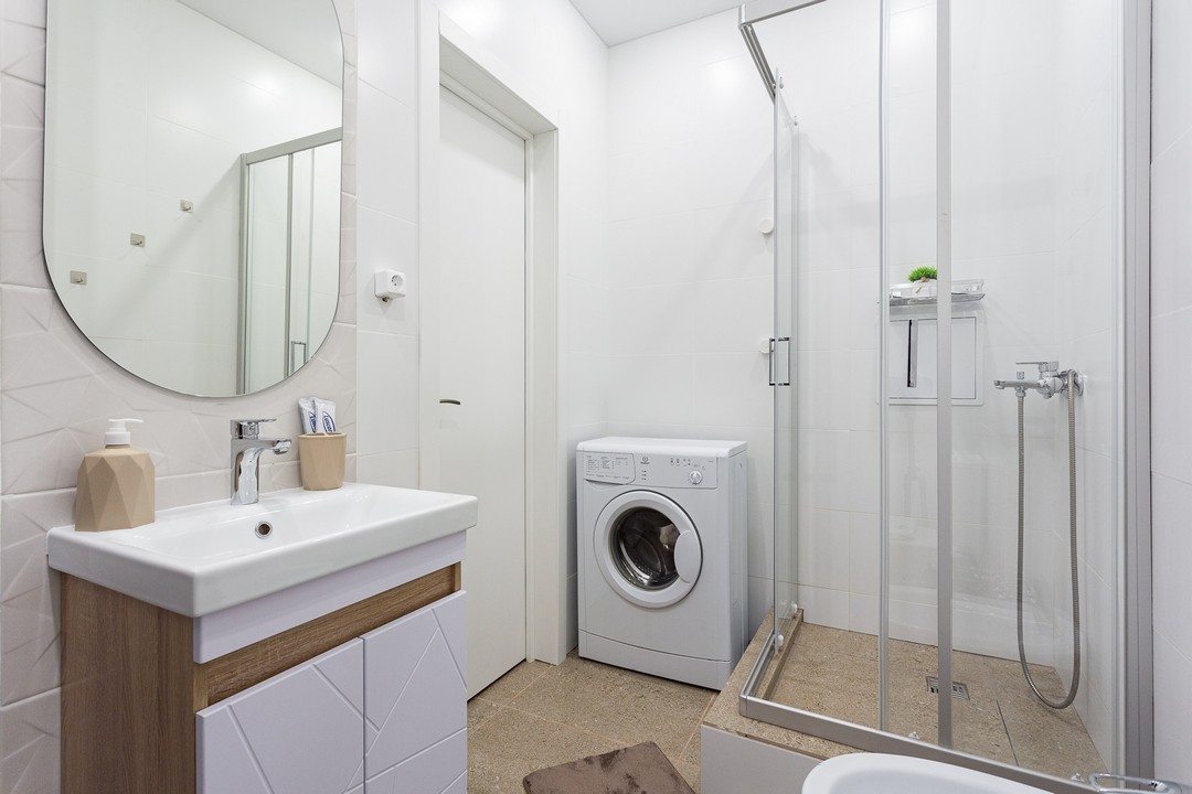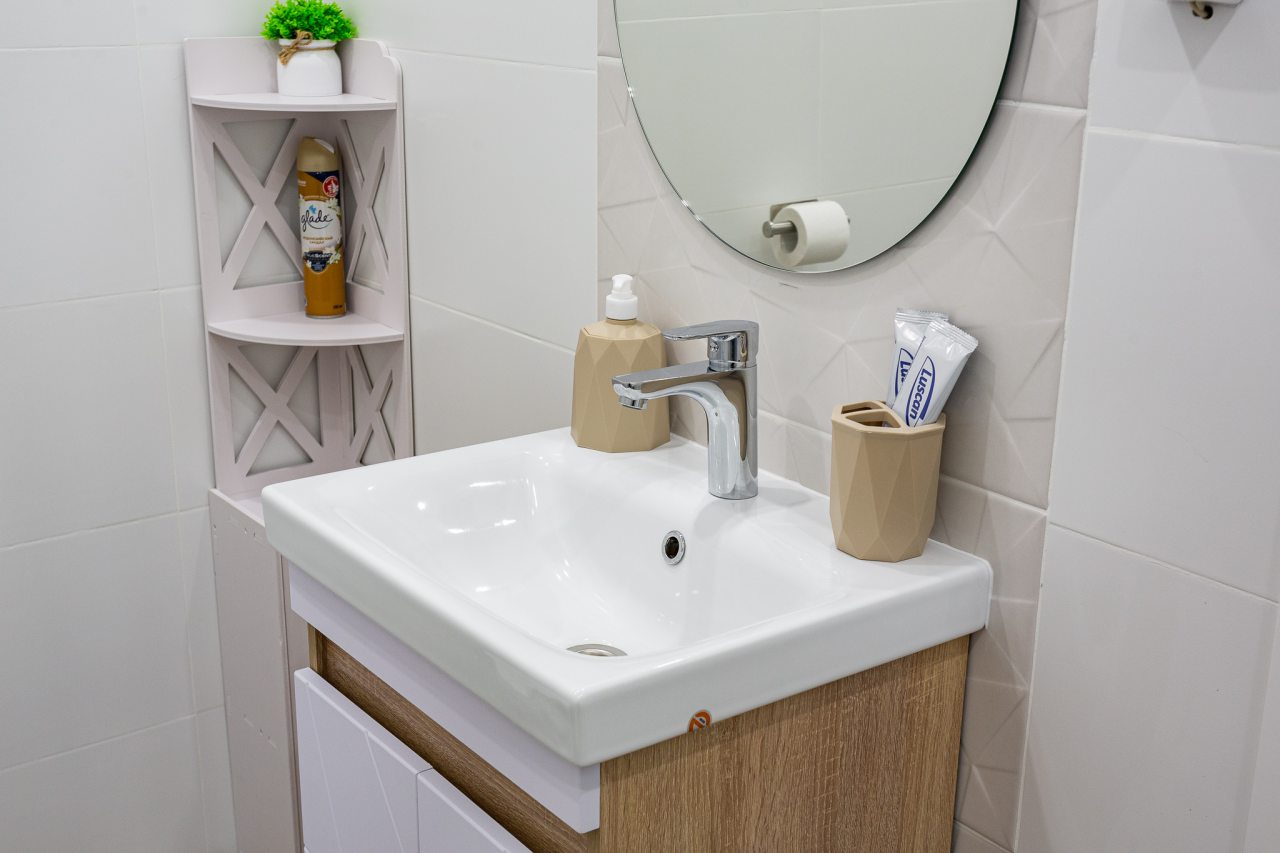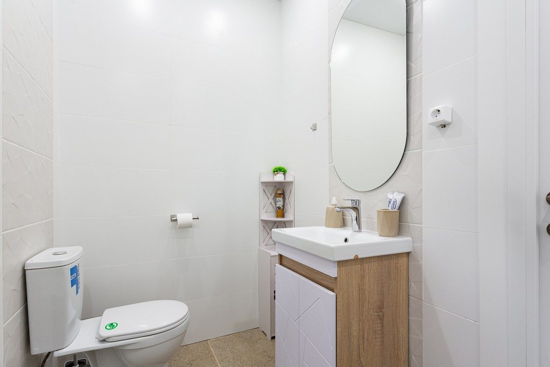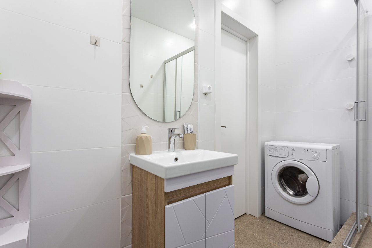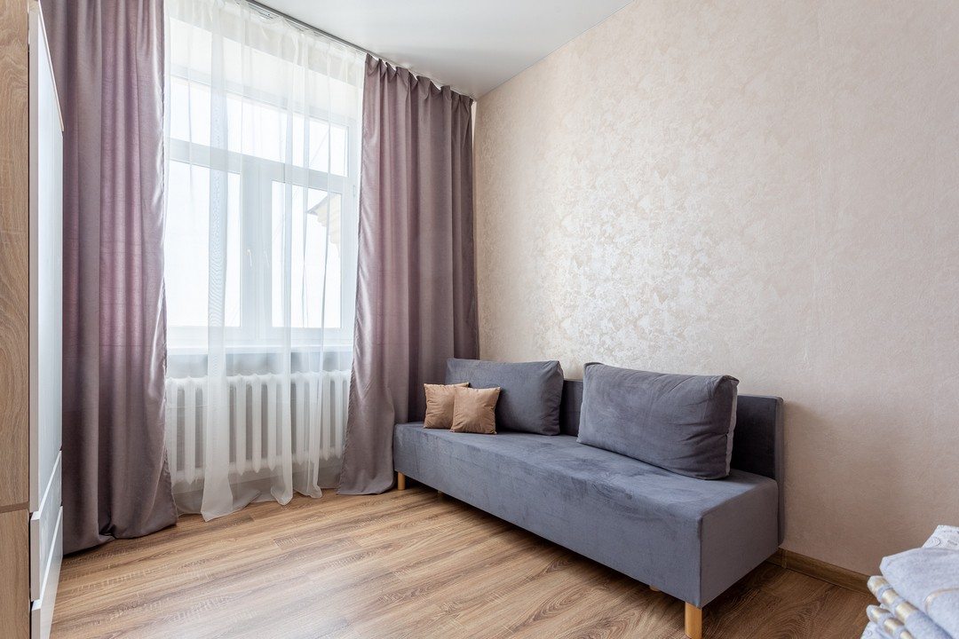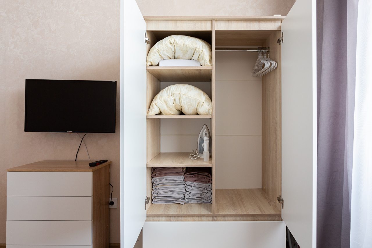 Внутри вас ожидает удобная двуспальная кровать, вместительный шкаф, мягкий диван, прикроватные тумбы и лампы, затемненные шторы, телевизор, стиральная машина, санузел с душевой и другой необходимой сантехникой.