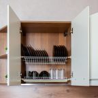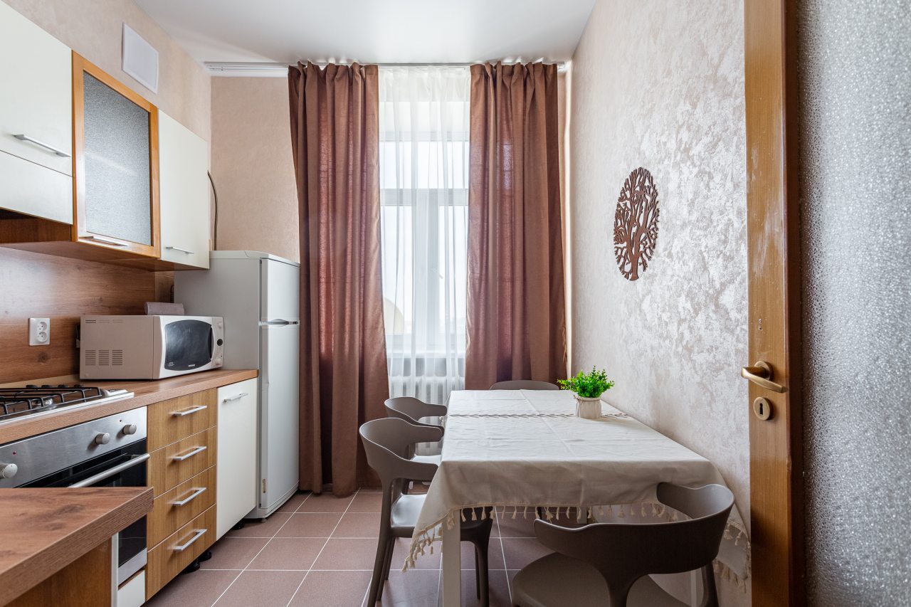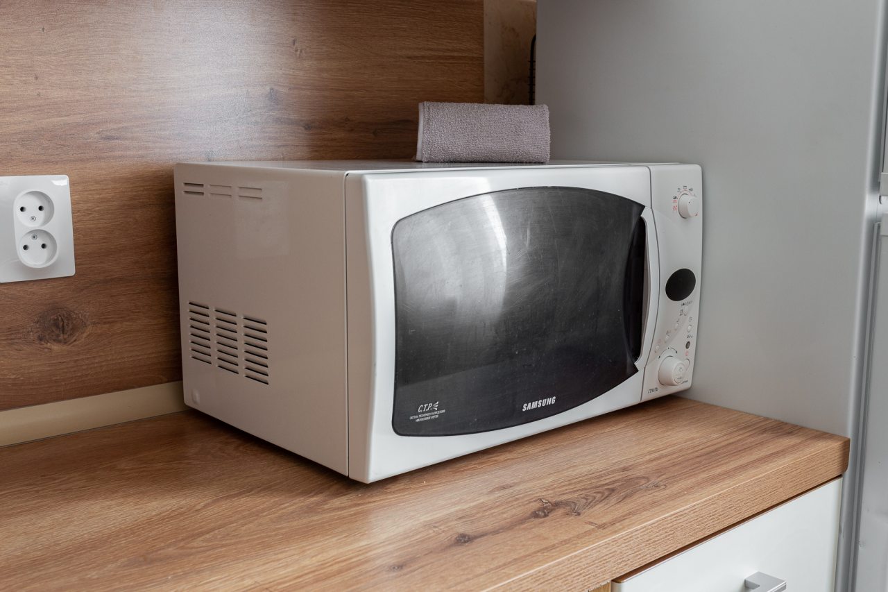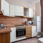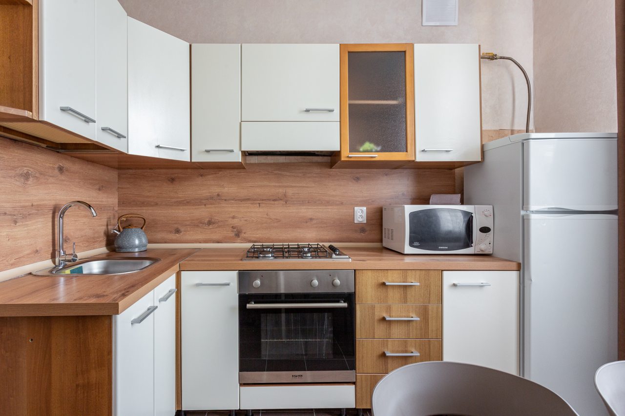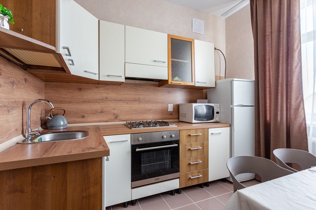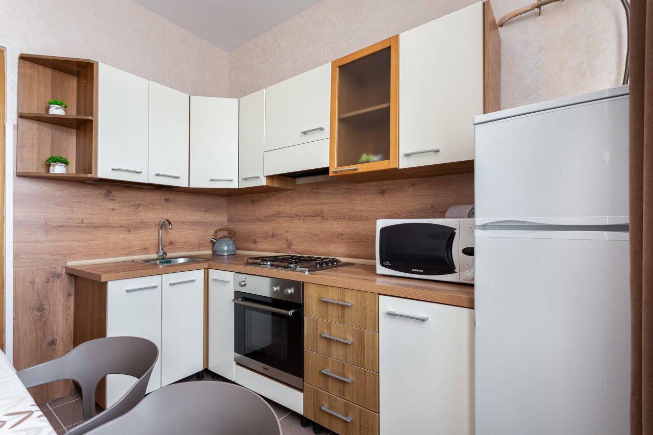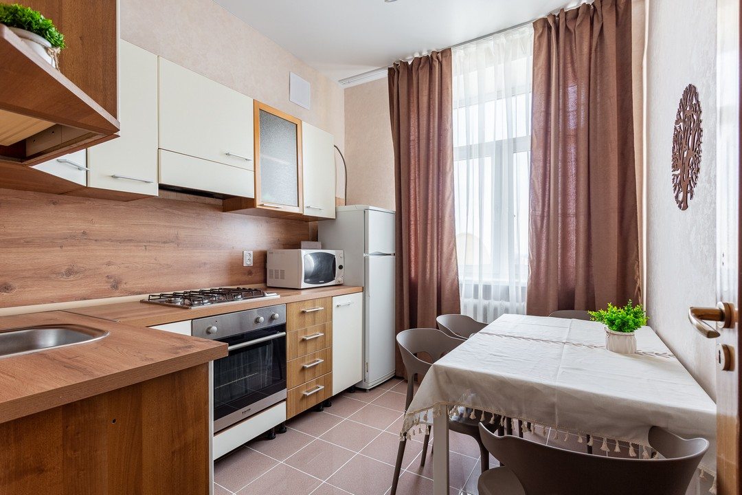 На кухне есть плита, холодильник, чайник, СВЧ-печь, духовой шкаф, обеденная зона, чтобы вы могли радовать себя любимой едой в любое время.