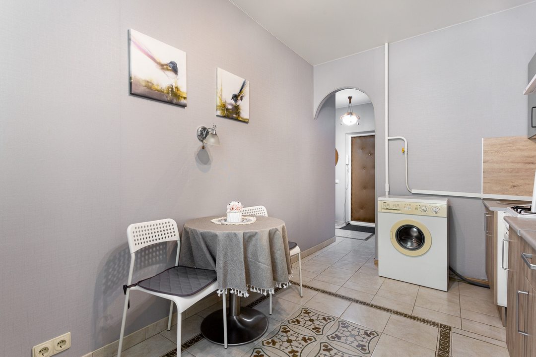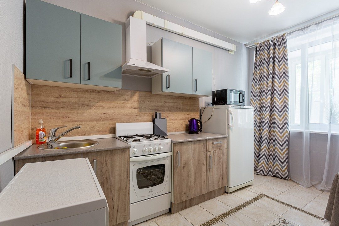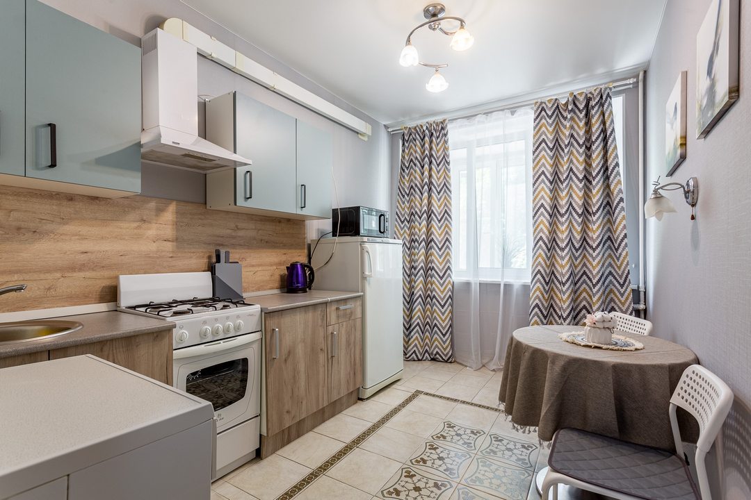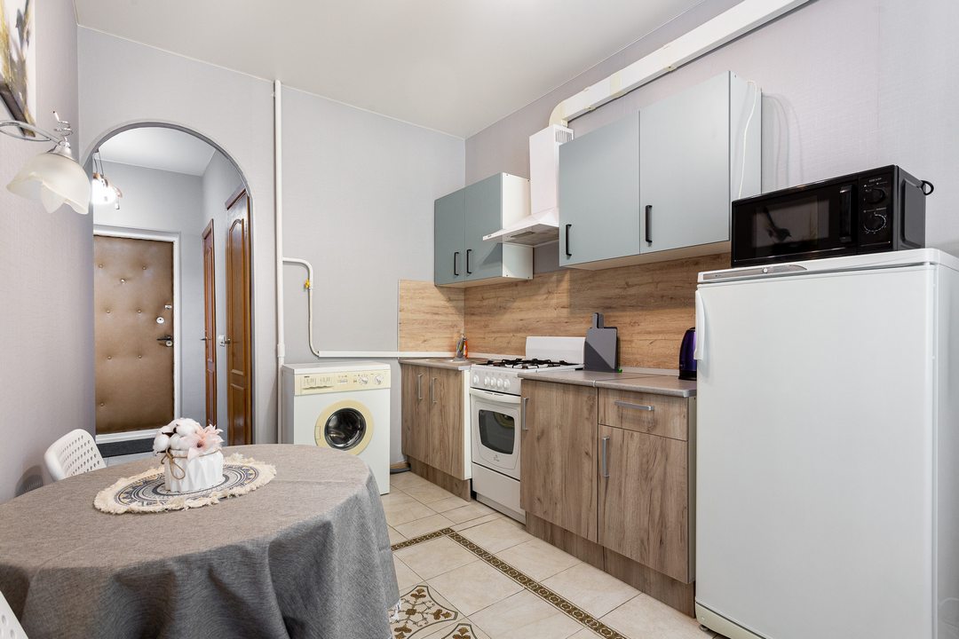 Кухня позволит осуществить любую кулинарную задумку, поскольку укомплектована плитой, духовым шкафом, СВЧ-печью, чайником, обеденной зоной.
