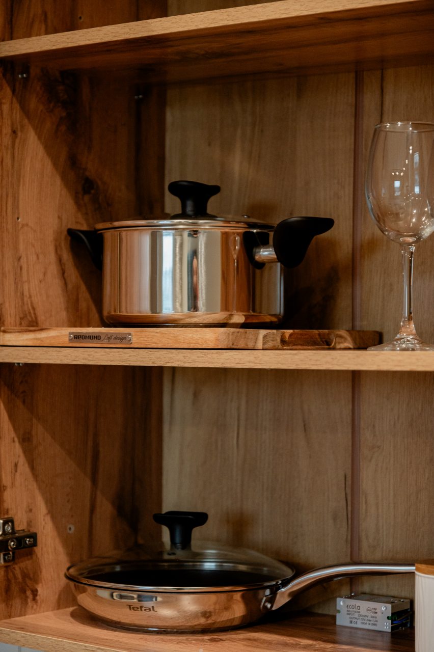 На кухне имеется необходимый инвентарь и принадлежности для готовки. Рядом расположены магазины продуктов.
