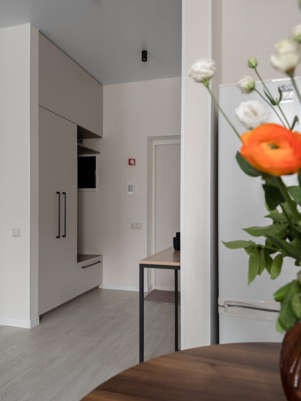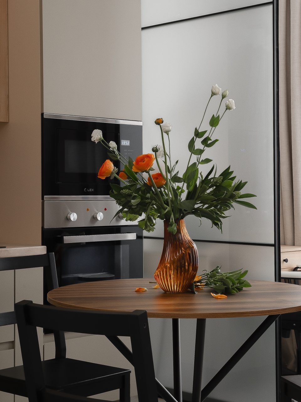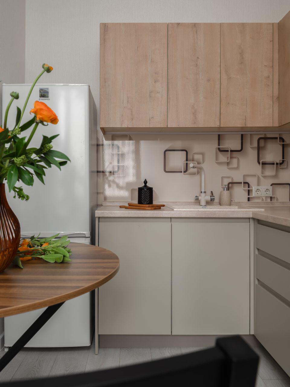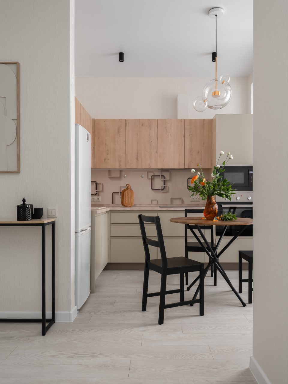 Кухня в пастельных цветах отлично подойдет для самостоятельной организации питания. В доступе гостей обеденный стол на несколько персон, техника и посуда. Имеется холодильник, духовой шкаф и микроволновая печь.
