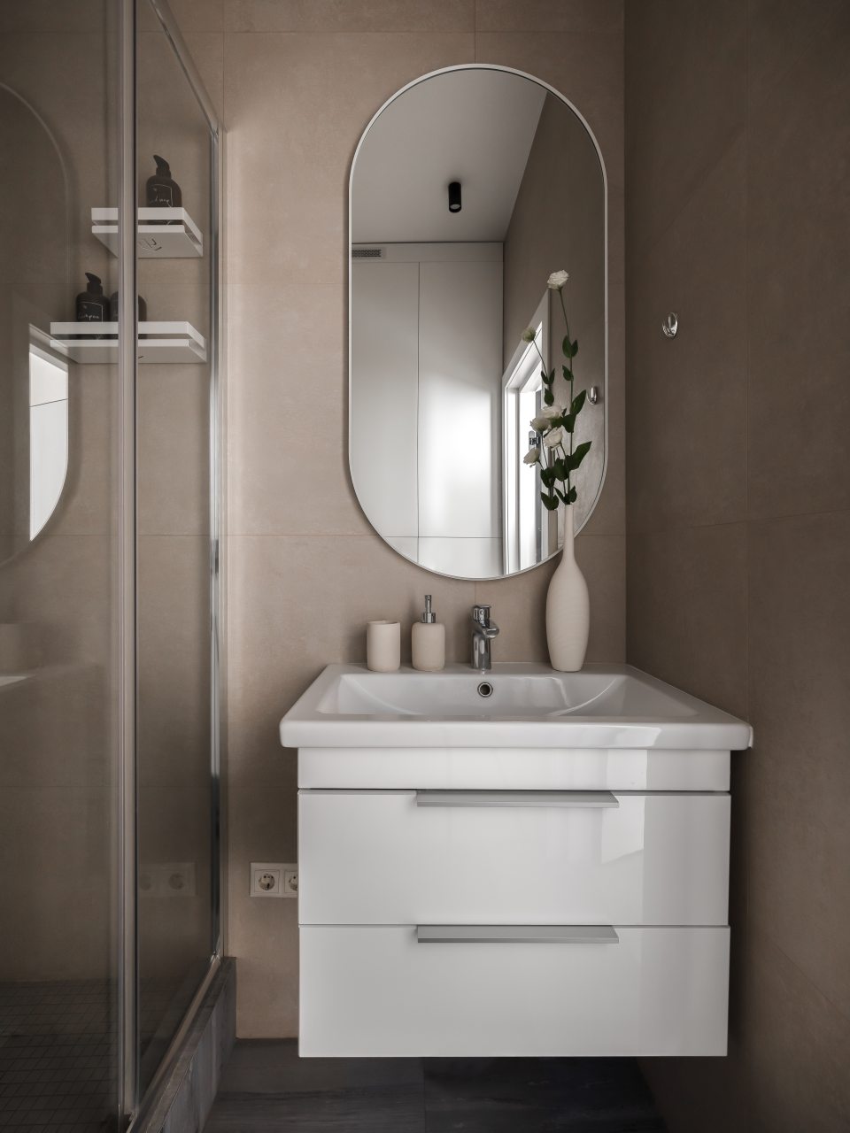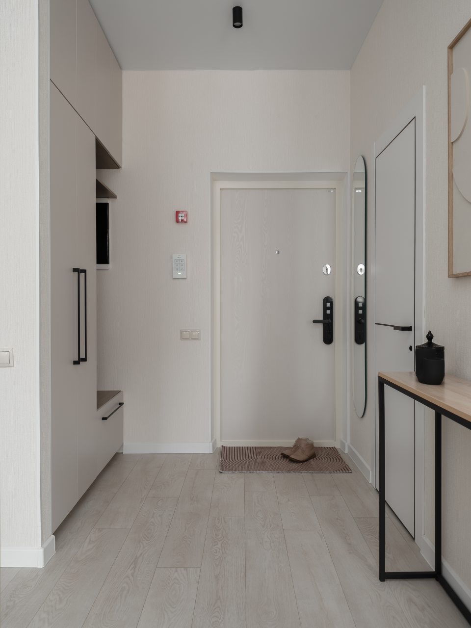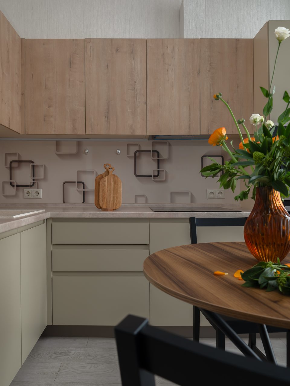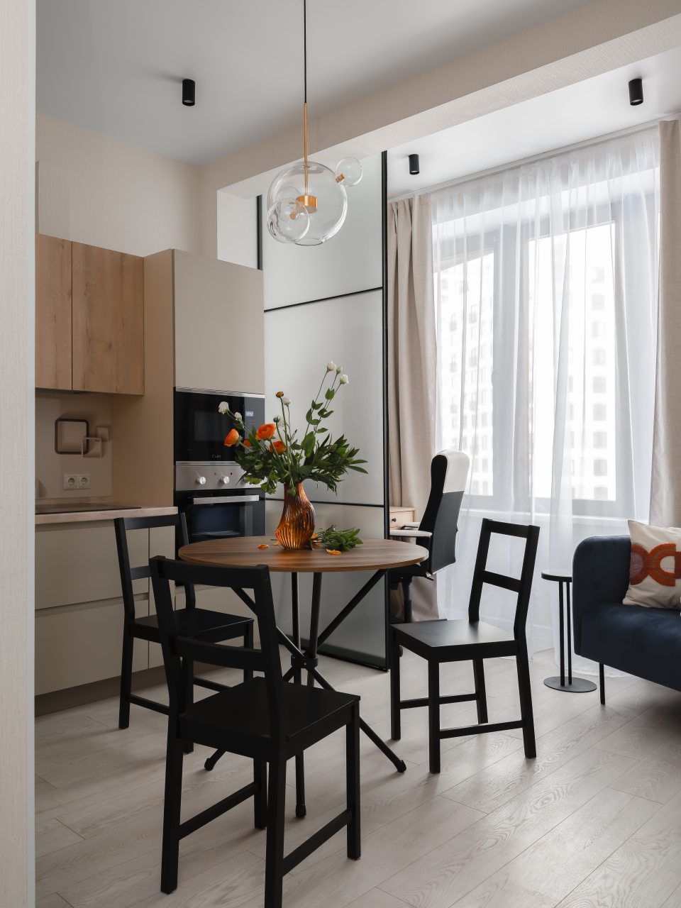 Кухня в пастельных цветах отлично подойдет для самостоятельной организации питания. В доступе гостей обеденный стол на несколько персон, техника и посуда. Имеется холодильник, духовой шкаф и микроволновая печь.