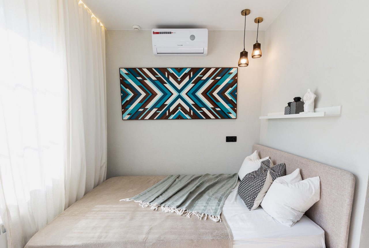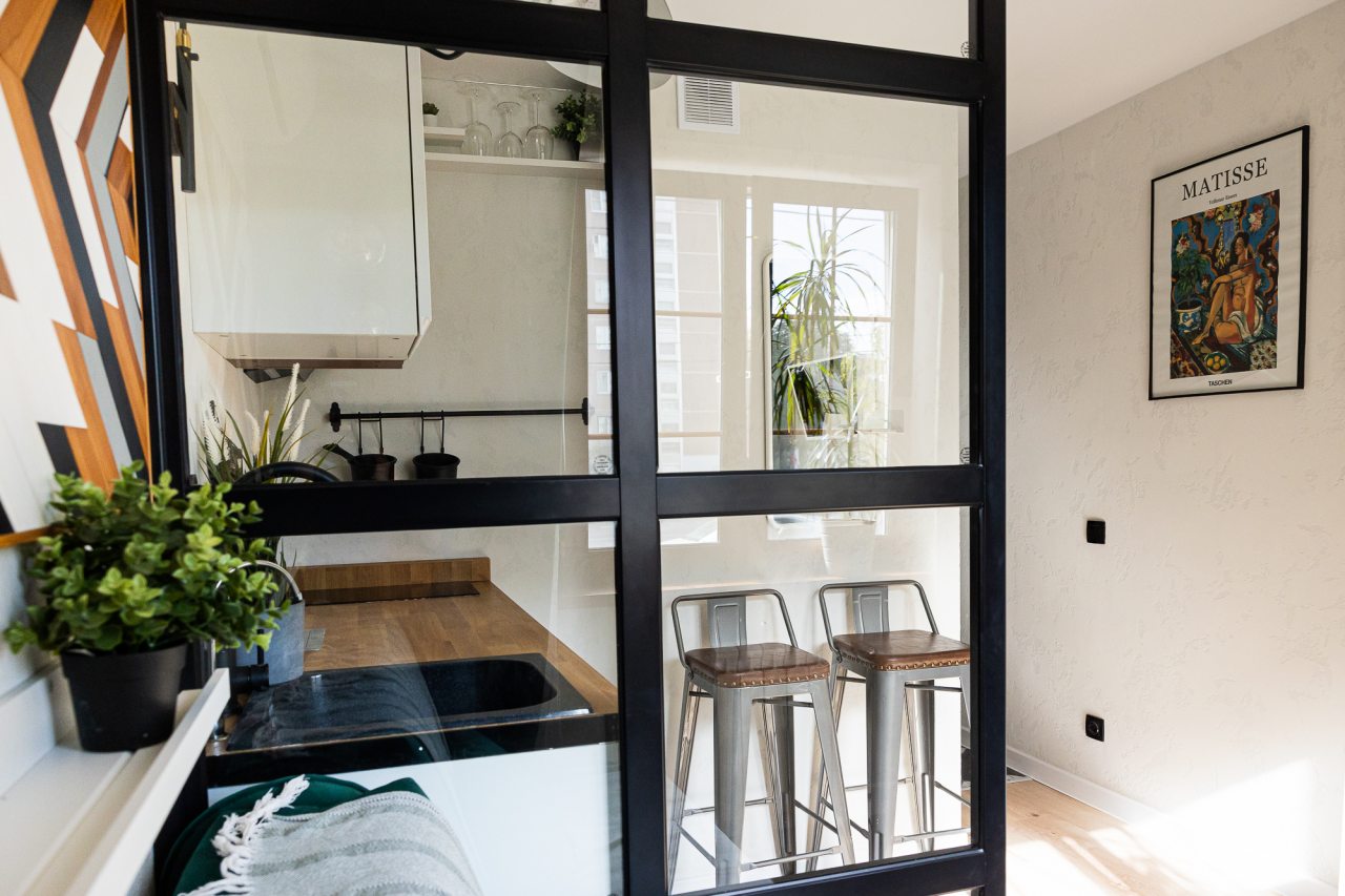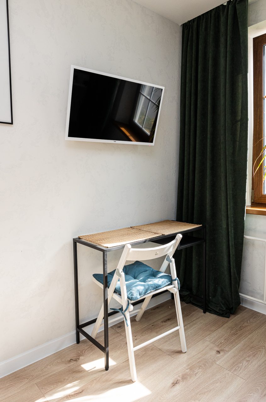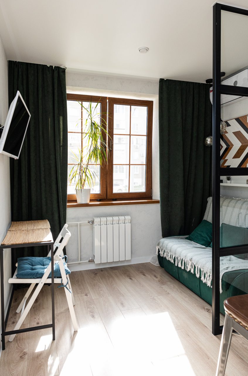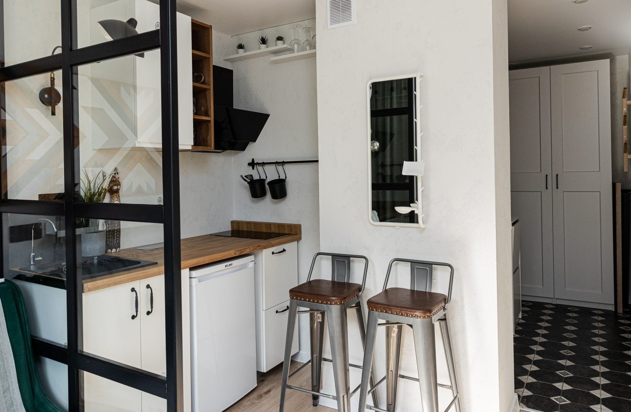 Компактная зона кухни укомплектована индукционной плитой с вытяжкой, холодильником, обеденным столом и стульями. Таким образом, вы всегда сможете порадовать себя домашней едой.