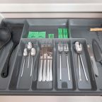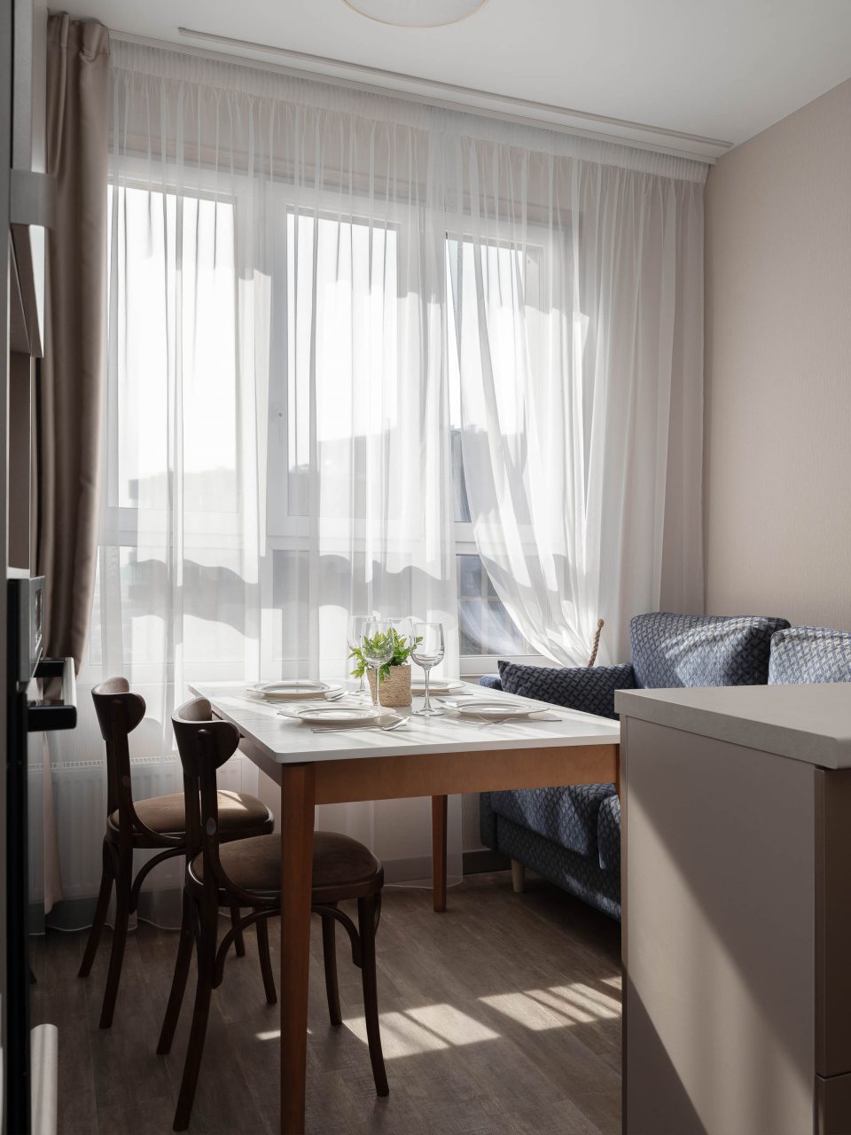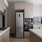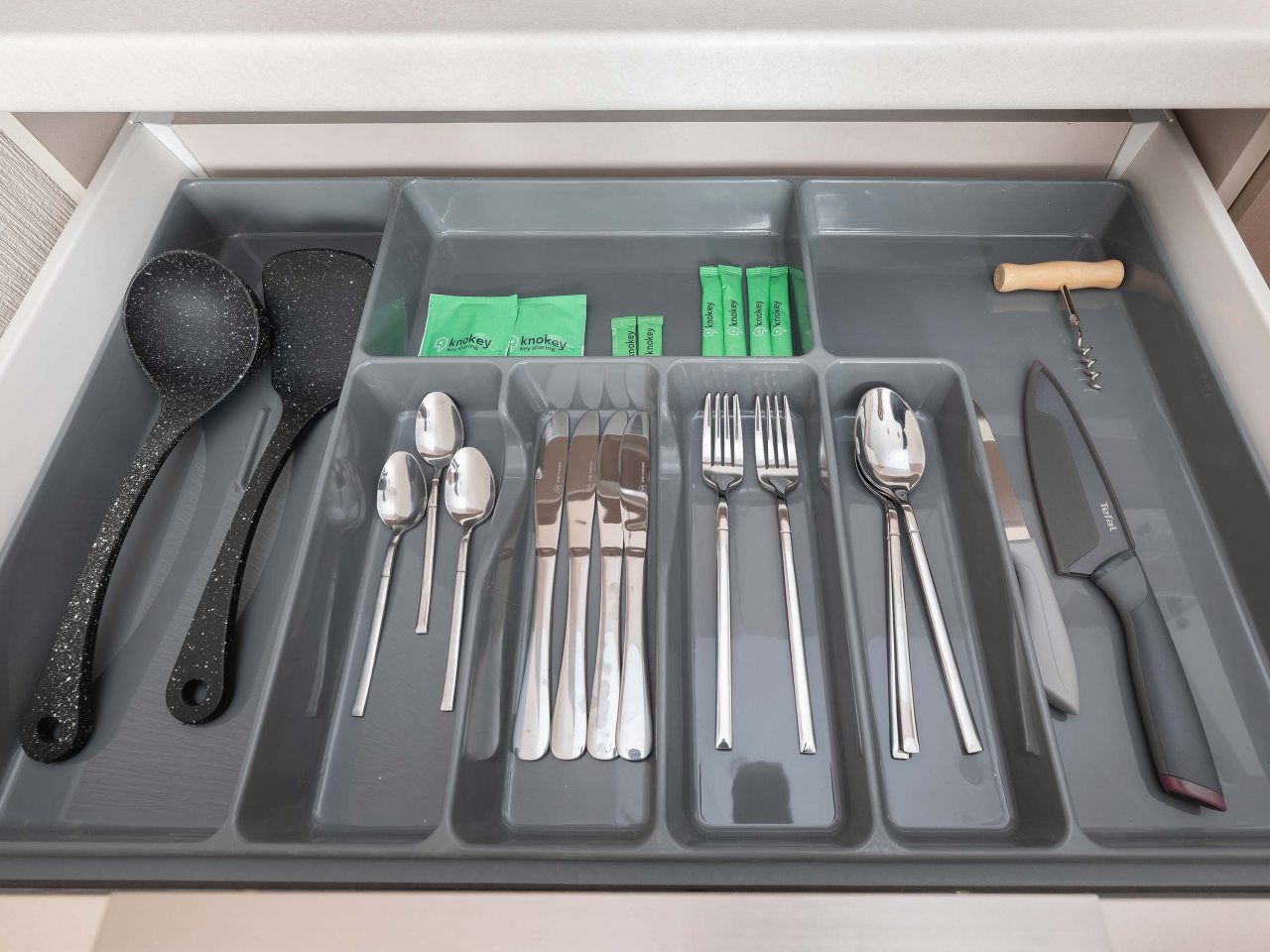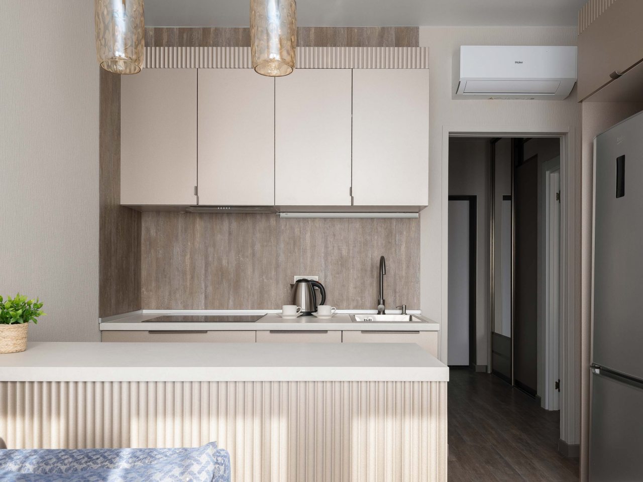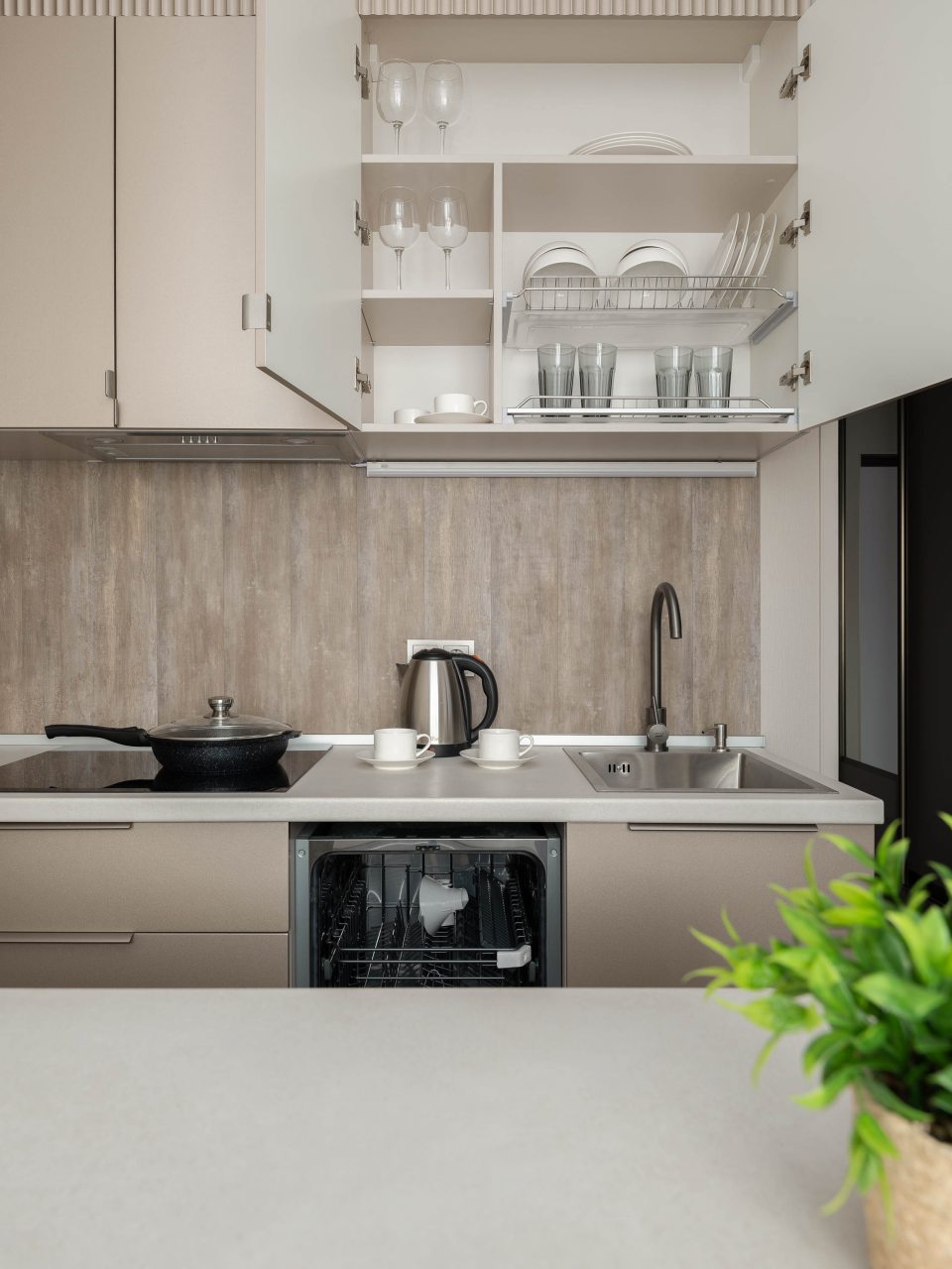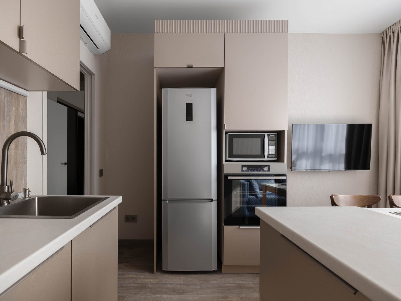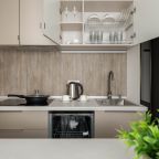 Для приготовления любимых блюд есть компактная кухня, оборудованная плитой, чайником, посудомоечной машиной, холодильником, обеденной зоной, различной посудой и столовыми приборами.