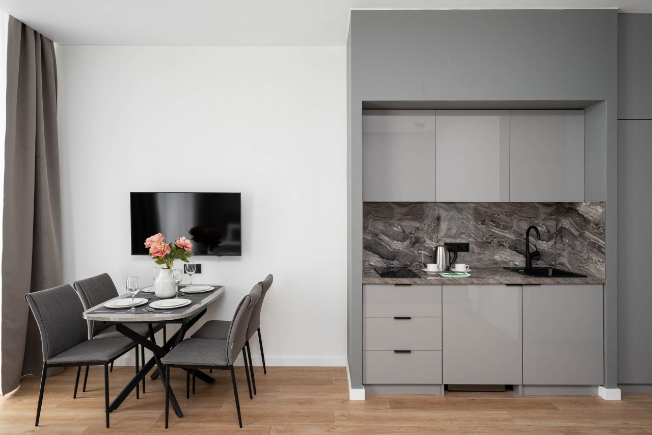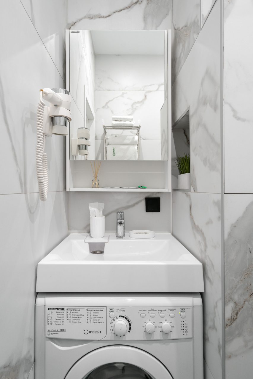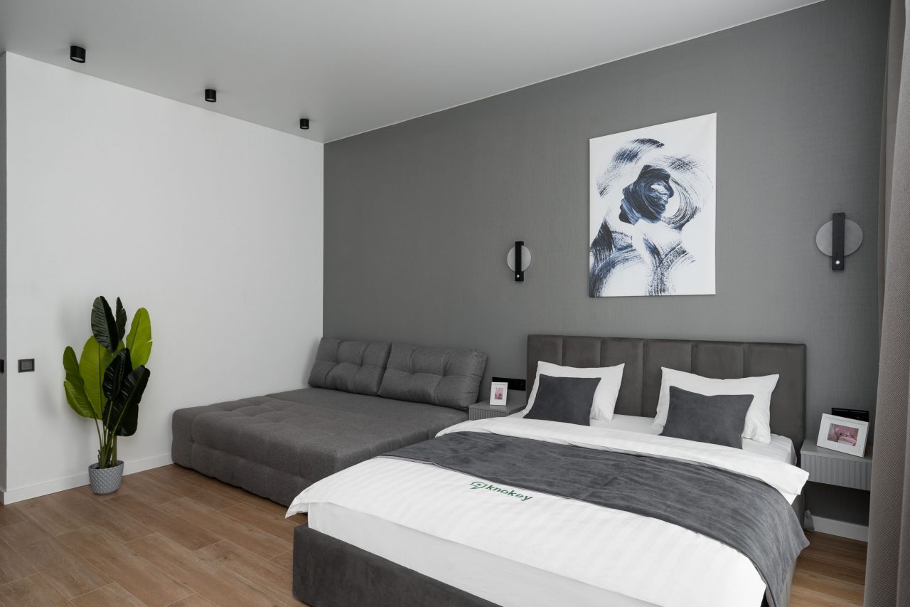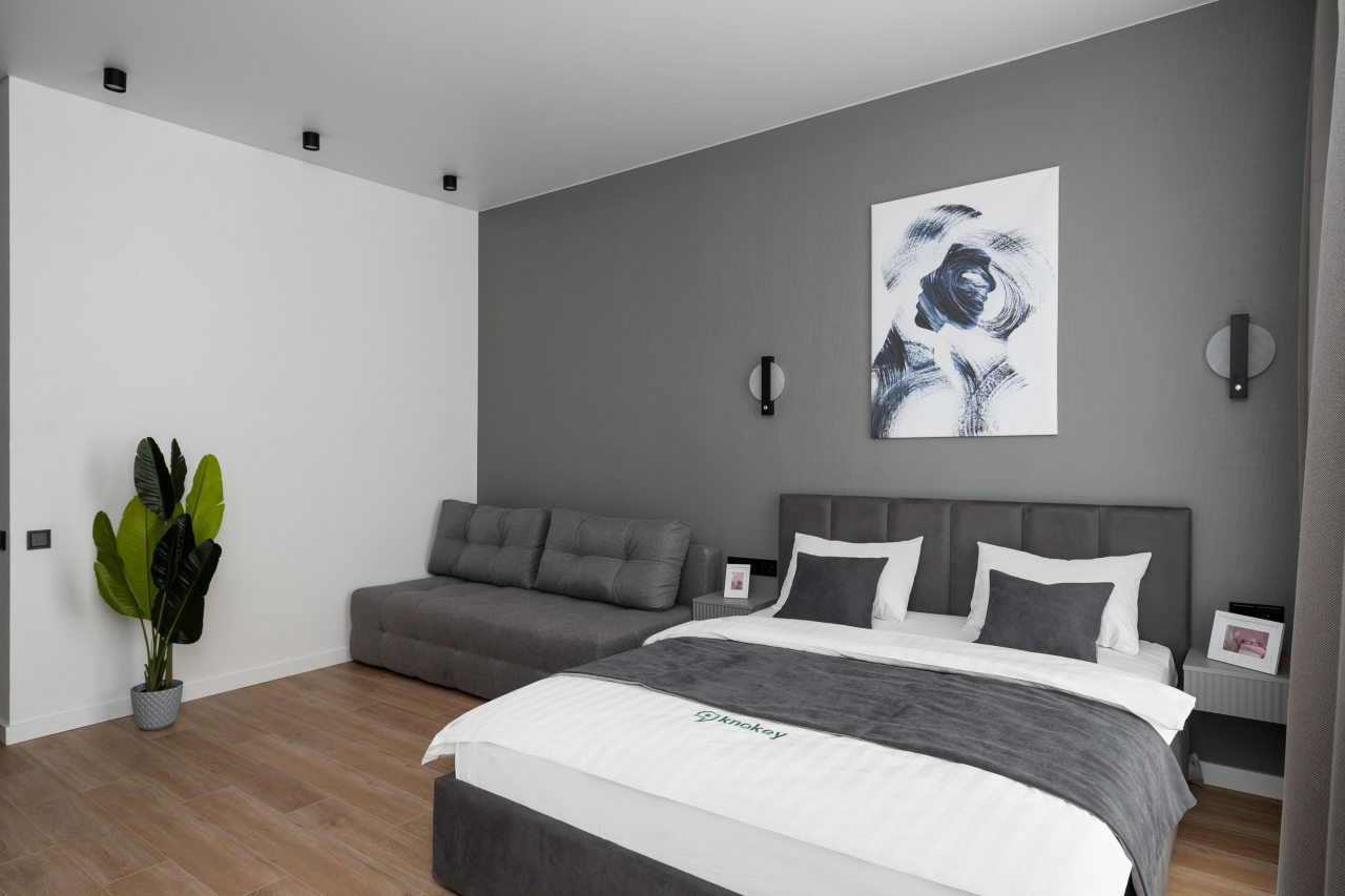 К размещению представлены современные апартаменты, оформленные в приятных оттенках цветовой гаммы. Они укомплектованы мебелью и техникой для отдыха: двуспальная кровать, мягкий диван, телевизор с плоским экраном. В санузле установлен душ и стиральная машинка, есть фен, полотенца и средства гигиены.