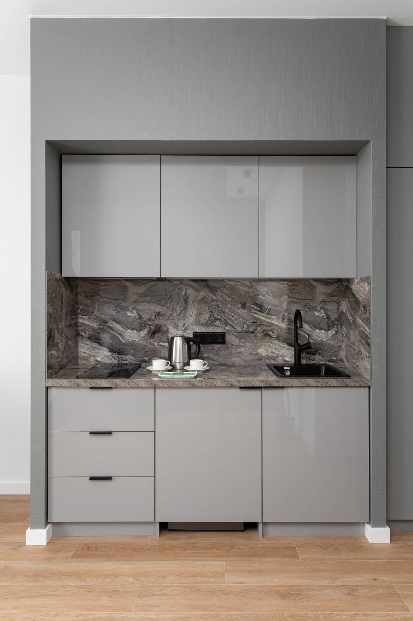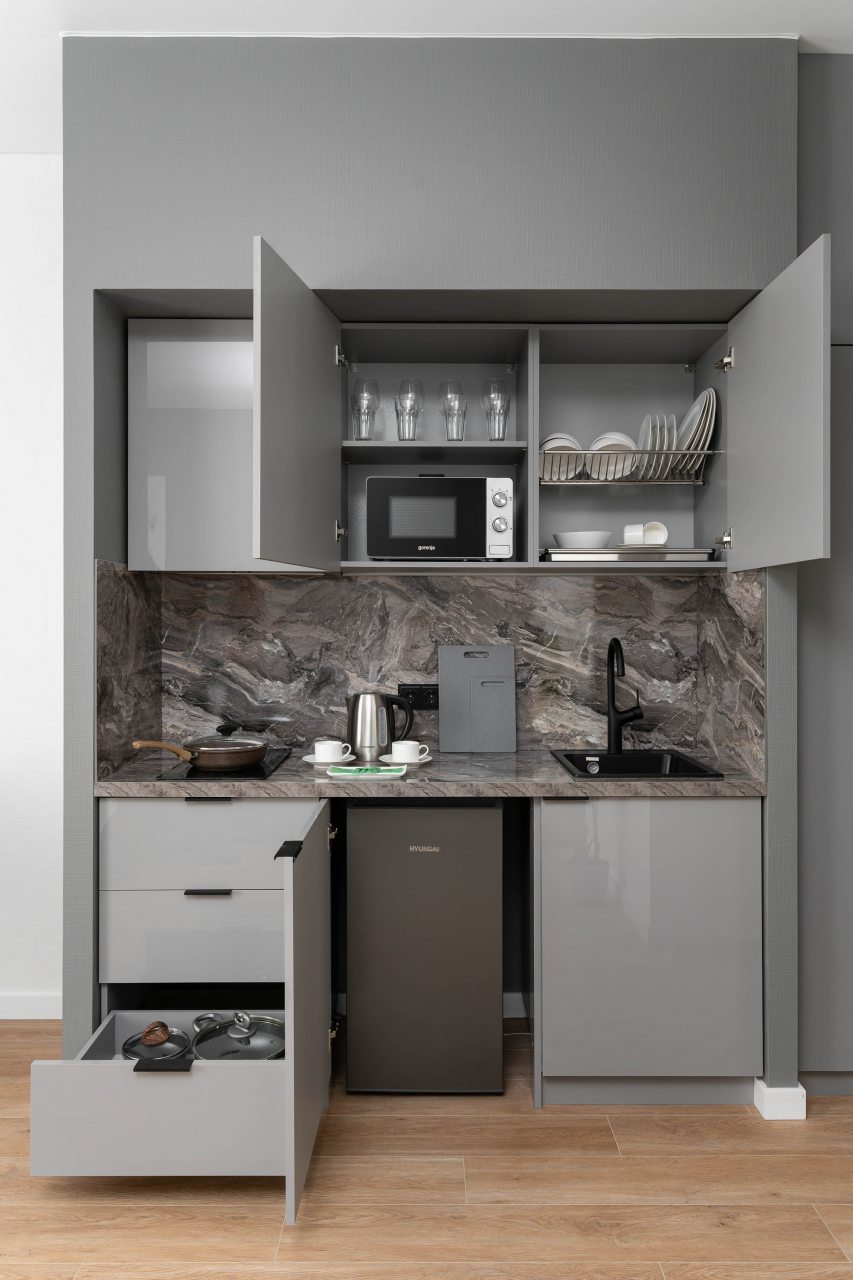 Кухонная зона оснащена необходимой посудой и бытовыми приборами для самостоятельной организации питания: холодильник, варочная панель, микроволновая печь, электрический чайник.