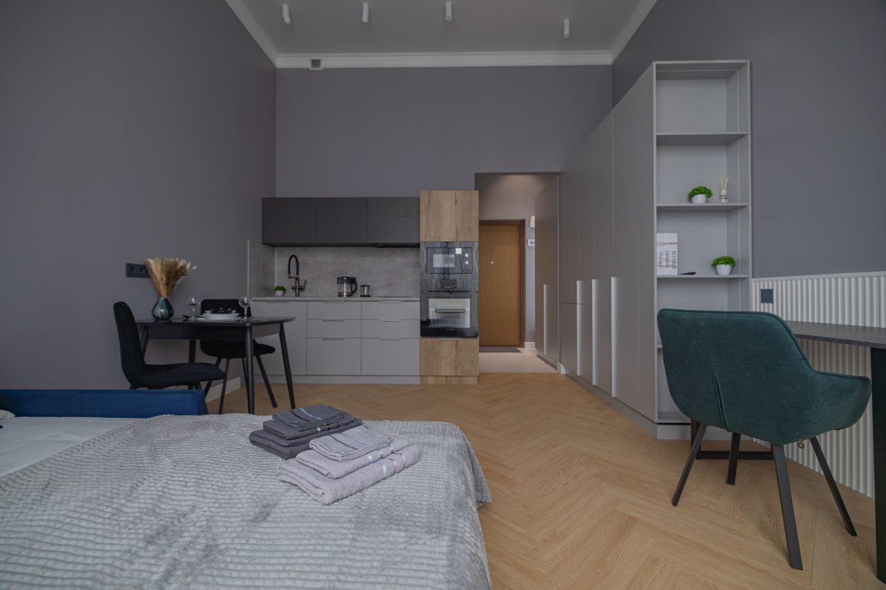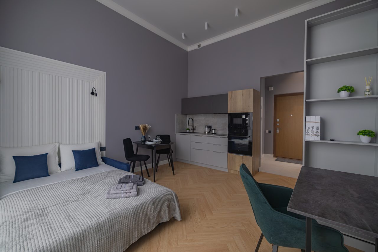 К размещению предлагаются комфортабельные студии с кухней санузлом, а также всеми условиями для комфортного проживания. Среди удобств имеются сплит-система, стиральная машина, телевидение и беспроводной интернет, душевая кабина. Гостям предоставляются чистые полотенца.