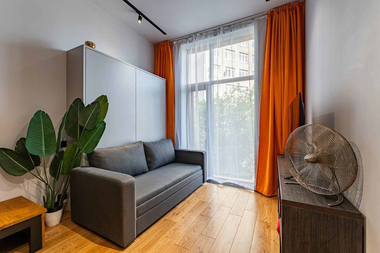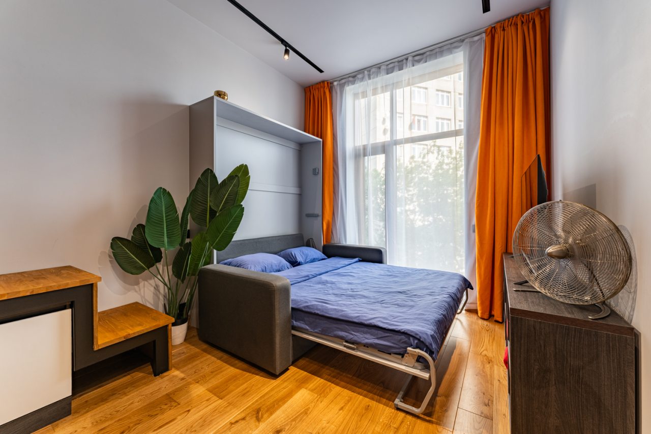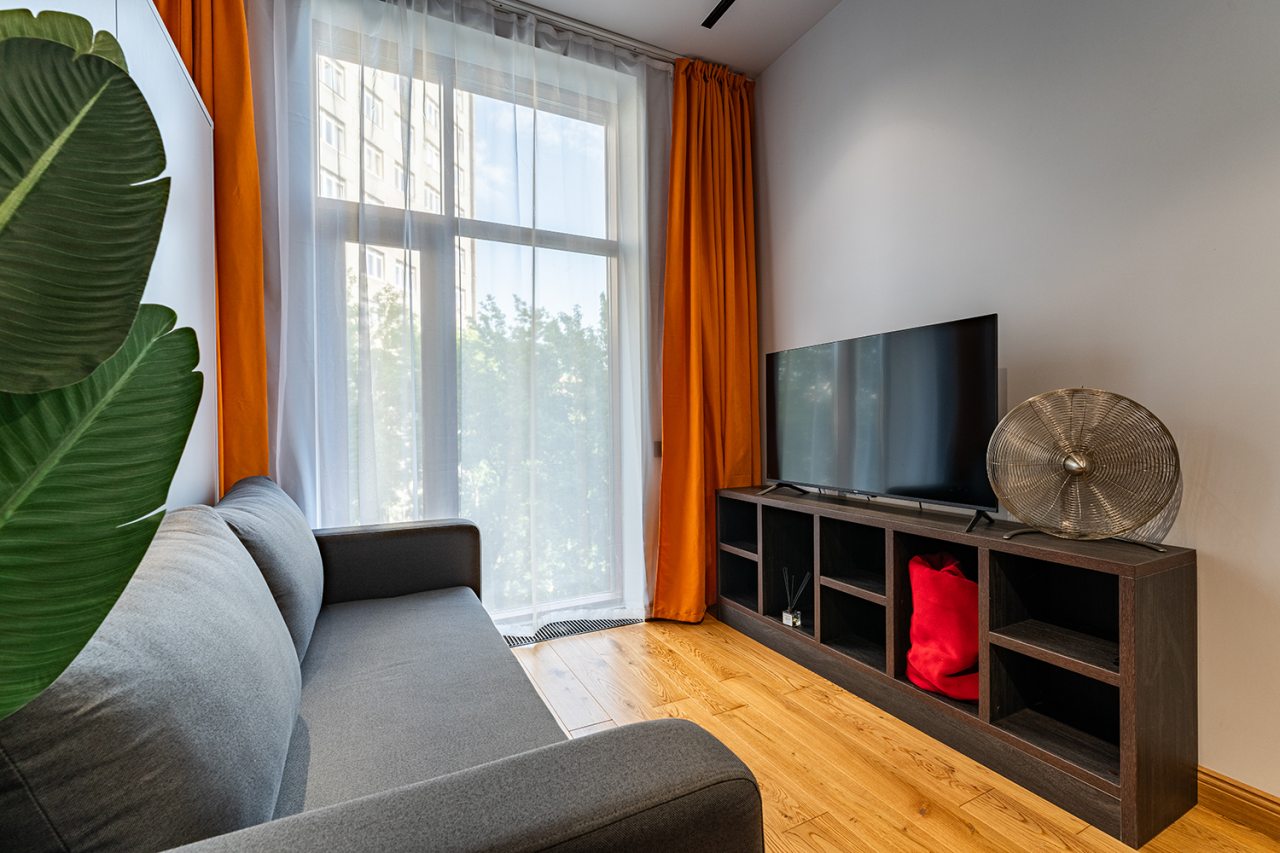 Для размещения предлагается светлая квартира с французским окном, оснащённая всем необходимым: двуспальной кроватью со свежим бельём и декоративными подушками, шкафом для хранения вещей, кондиционером, телевизором, тумбочкой. Быть на связи с родными поможет бесплатный Wi-Fi. Чтобы ваши вещи всегда были в отличном состоянии имеется стиральная машина и гладильные принадлежности. Санузел оборудован всей необходимой сантехникой, зеркалом, феном, тапочками, чистящими и косметическими средствами.
