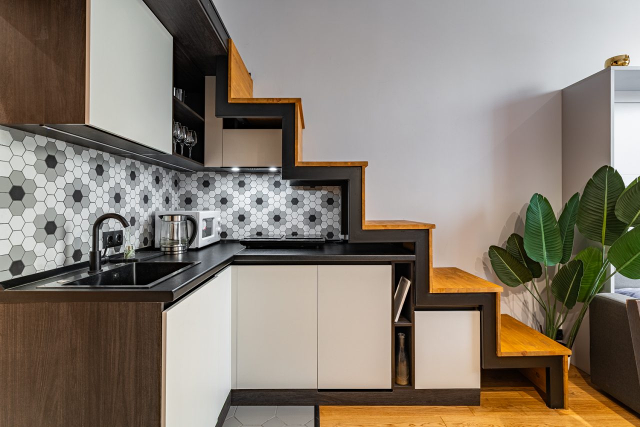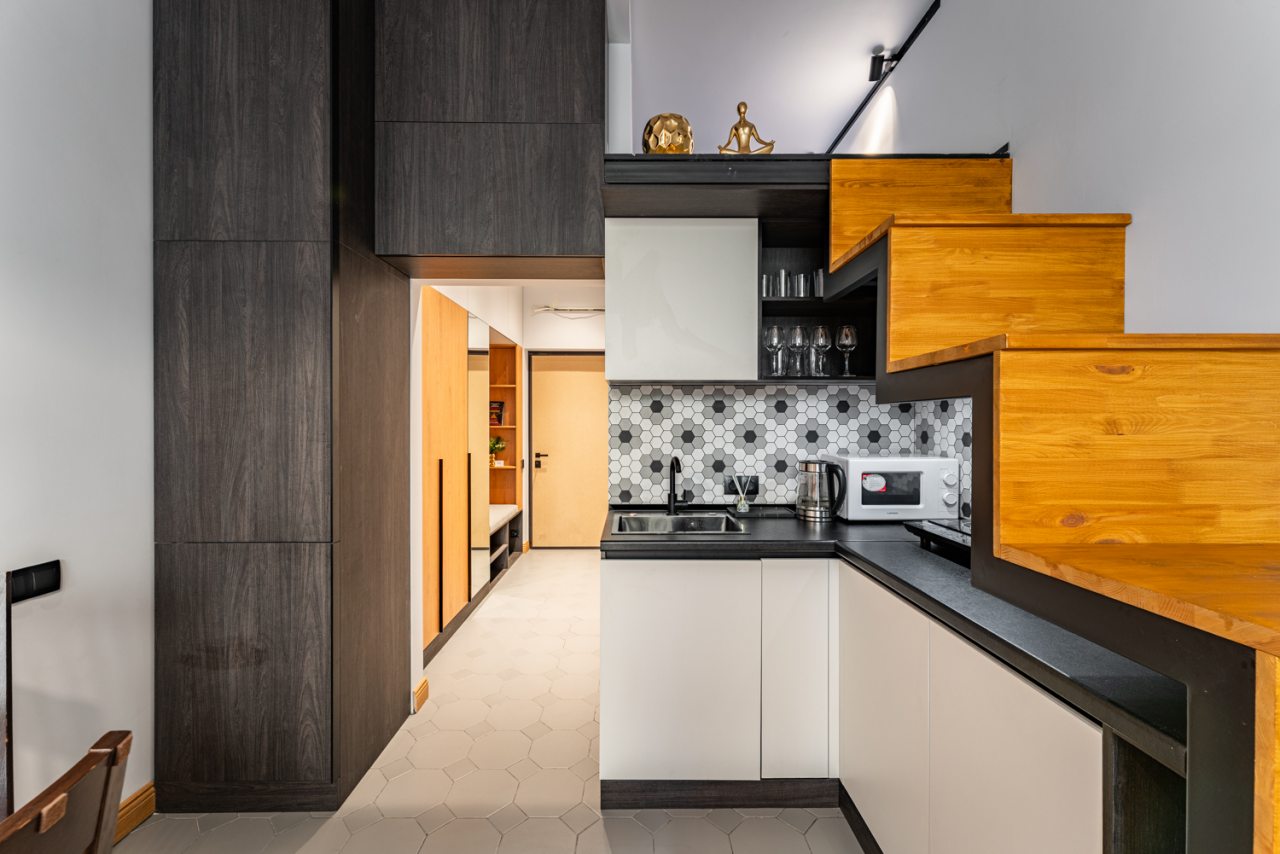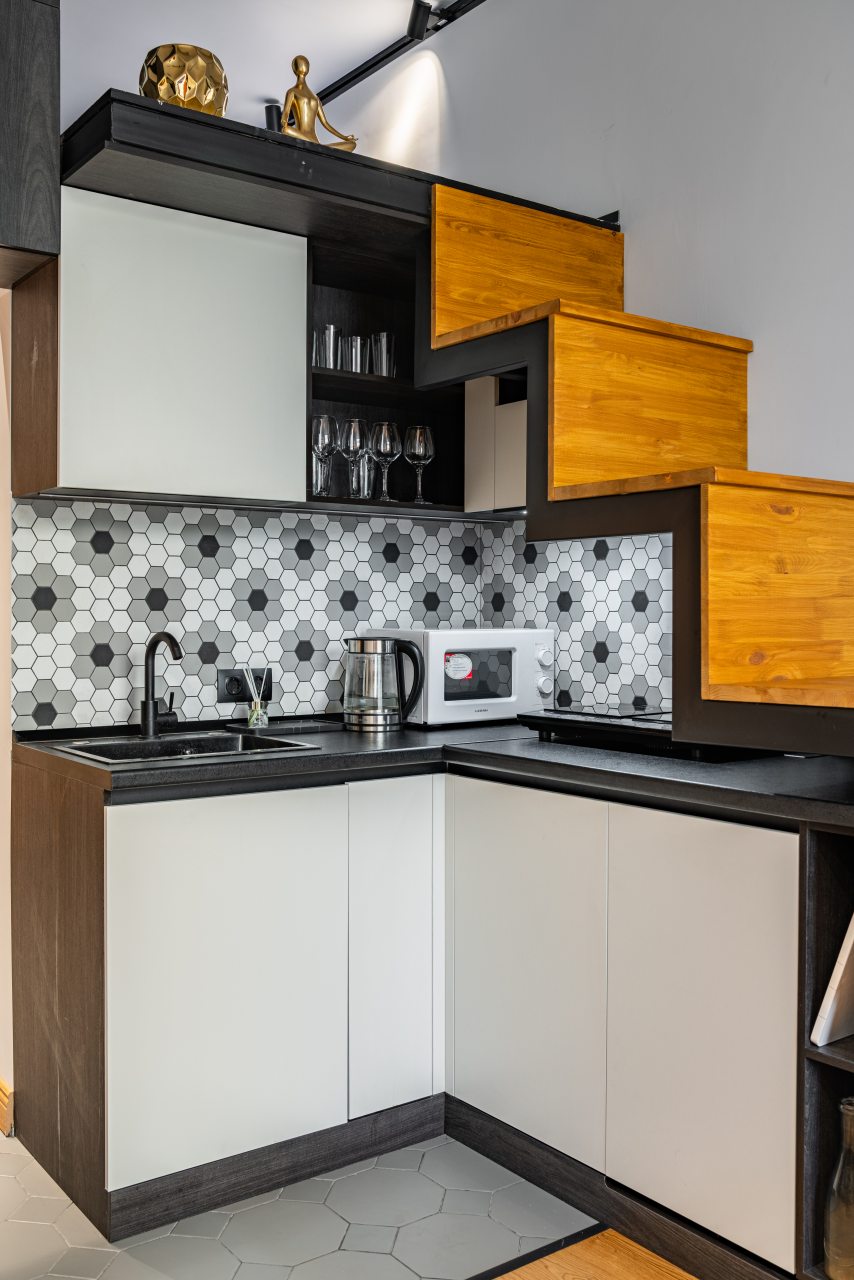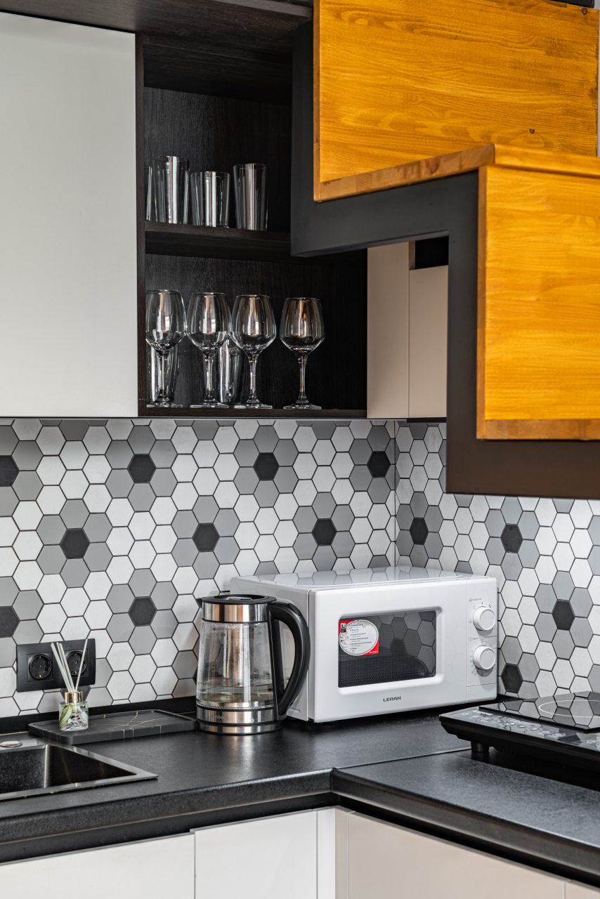 Кухня оборудована всем необходимым, чтобы можно было приготовить разнообразные блюда. Вмещает в себя холодильный шкаф, СВЧ-печь, электрическую конфорку, чайник. Пообедать предлагается в кафе «Ланч Джой».