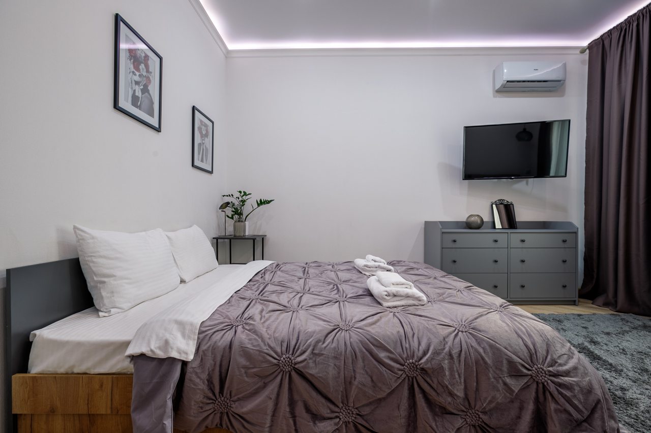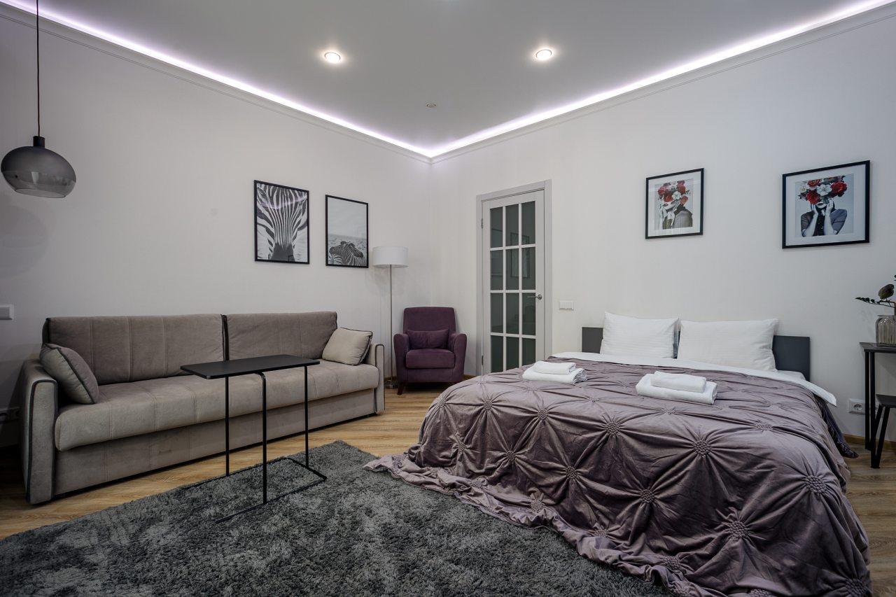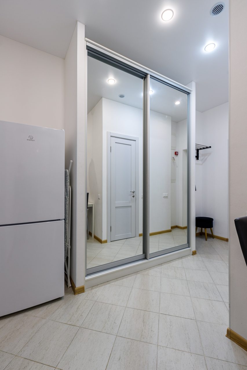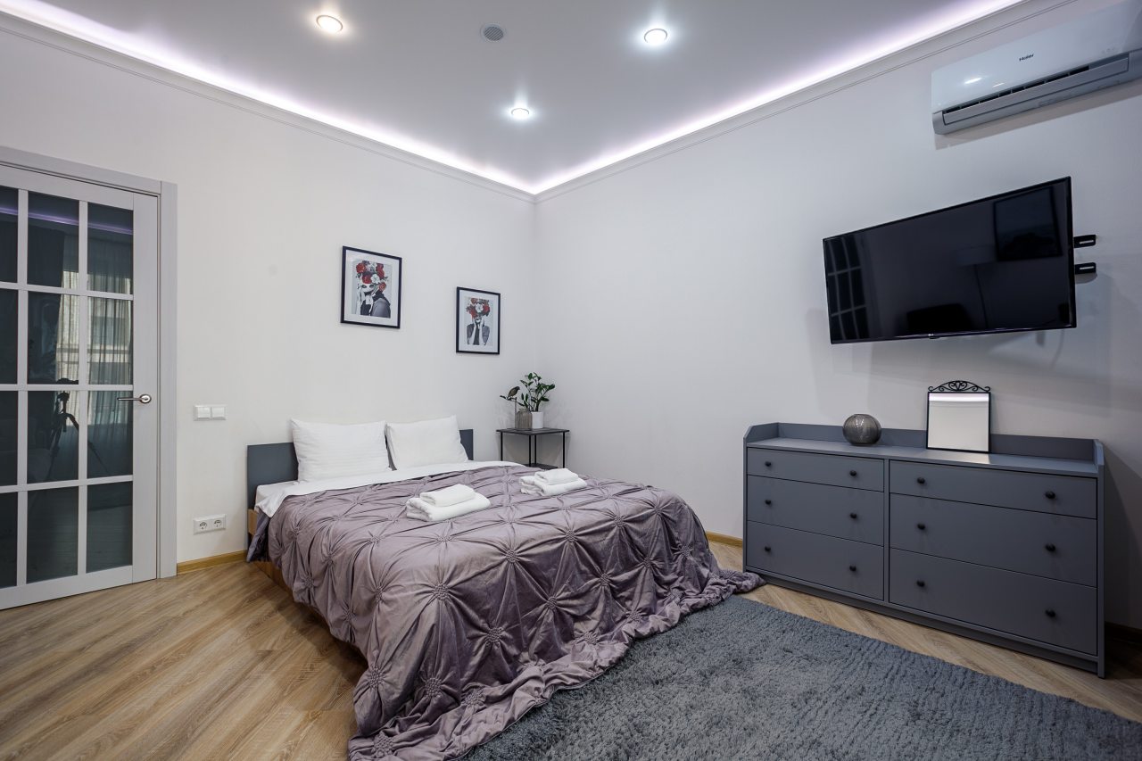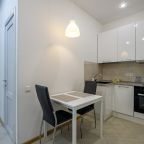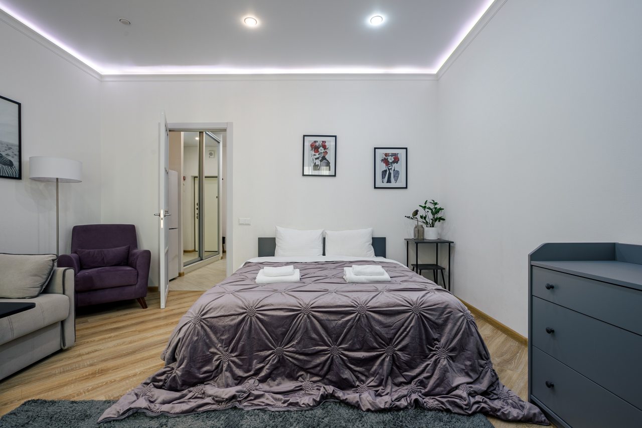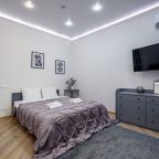 В Москве жили в данных апартаментах и нам очень понравилось. Квартира небольшая, но пространство оформлено в духе современности. Потолок в несколько уровней с подсветкой и интересными декорами смотрится конечно шикарно. Шкаф вместительный большой до самого потолка, вещи здесь разместить не проблема. Кухня своя есть, как и санузел. Очень здорово!