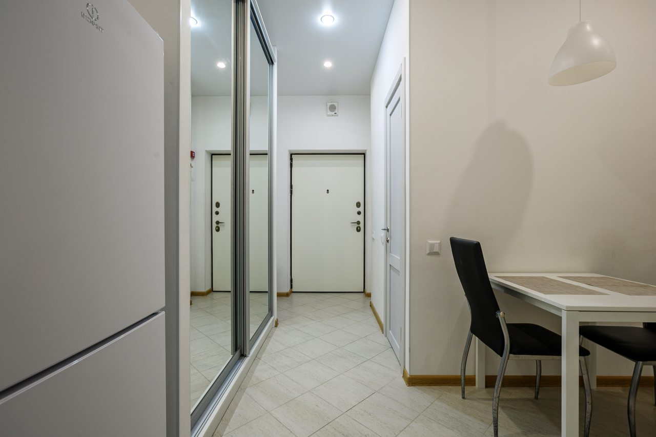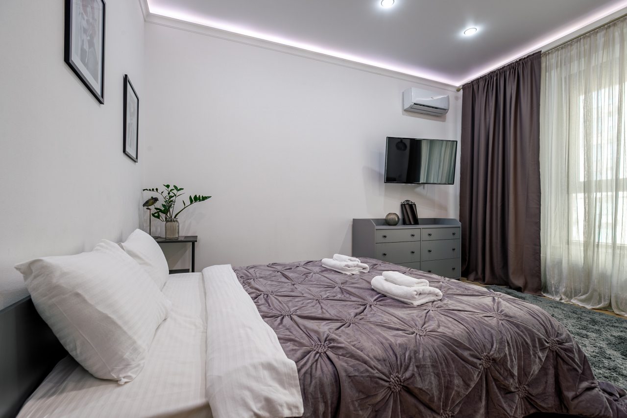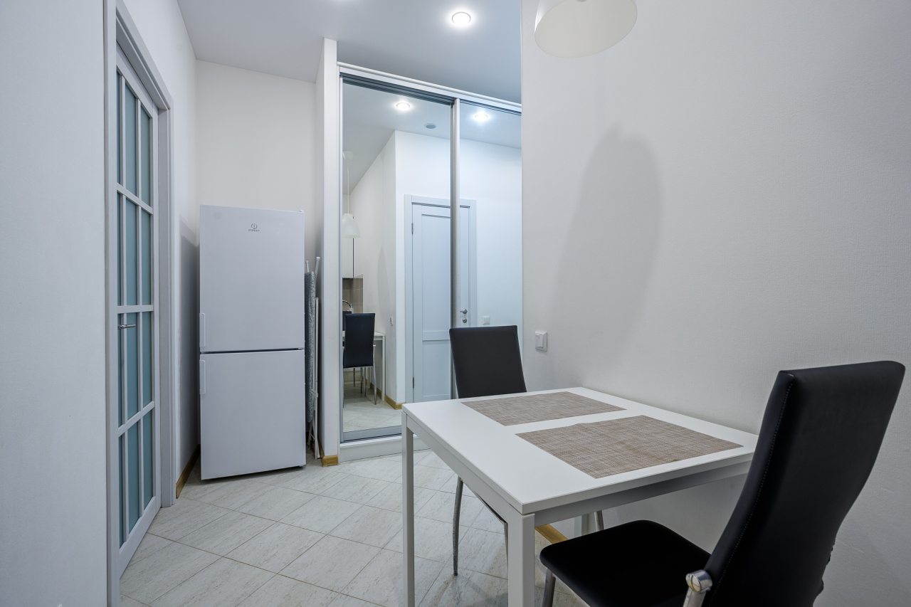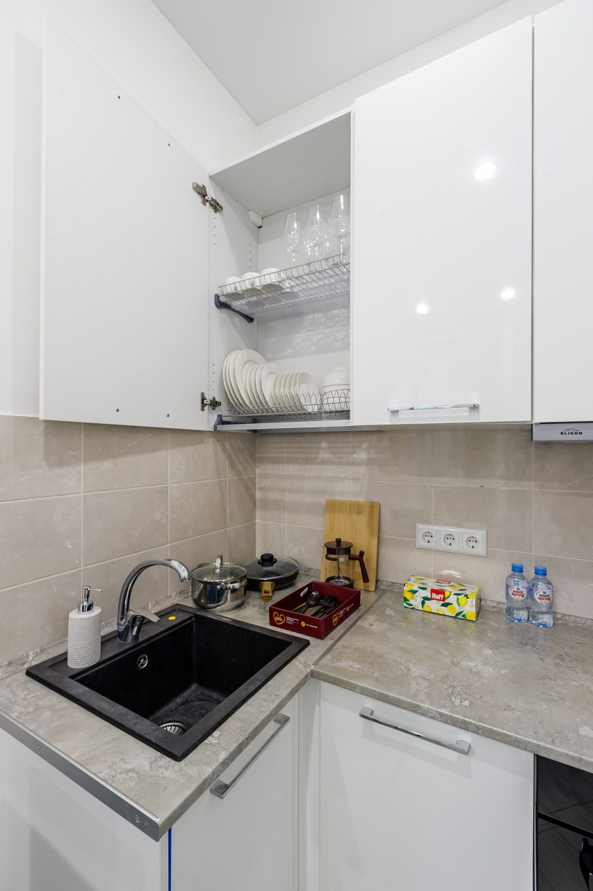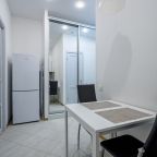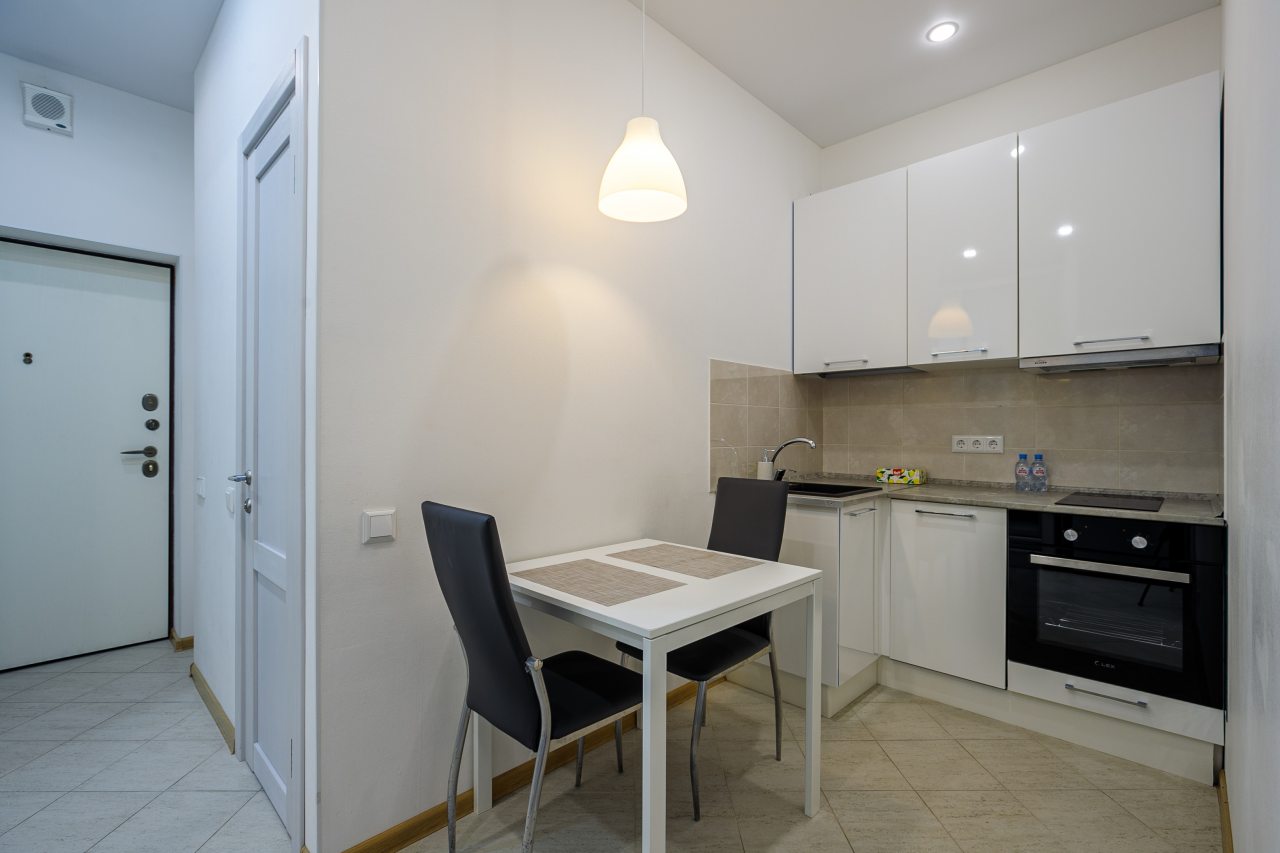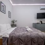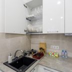 В Москве жили в данных апартаментах и нам очень понравилось. Квартира небольшая, но пространство оформлено в духе современности. Потолок в несколько уровней с подсветкой и интересными декорами смотрится конечно шикарно. Шкаф вместительный большой до самого потолка, вещи здесь разместить не проблема. Кухня своя есть, как и санузел. Очень здорово!