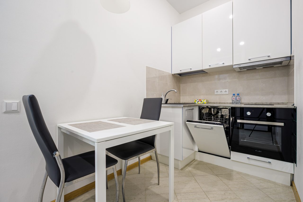 Кухня совмещена с гостиной и имеет все нужное оснащение для готовки, а именно: кухонный гарнитур, варочную панель, микроволновую печь, холодильник, посудомоечную машину. Также выделена обеденная зона.