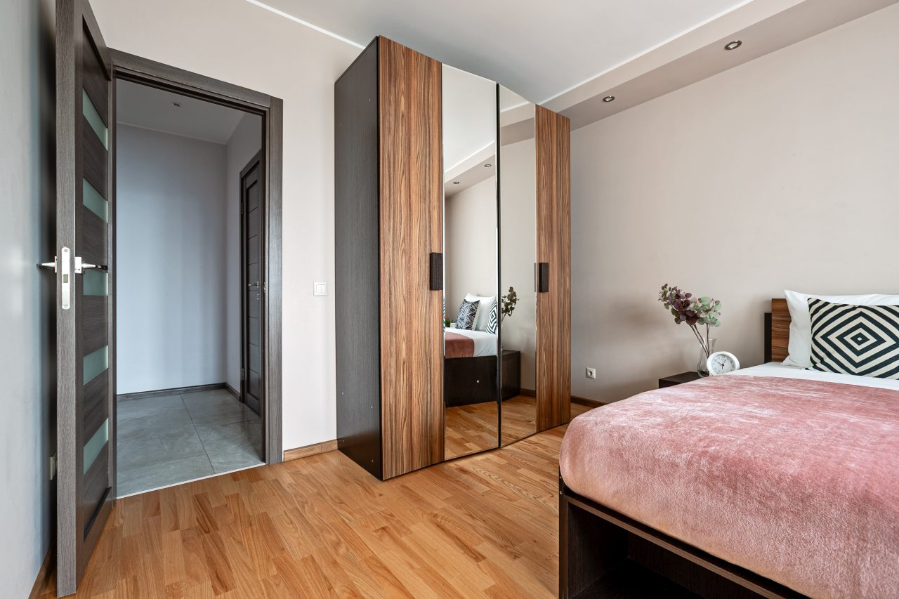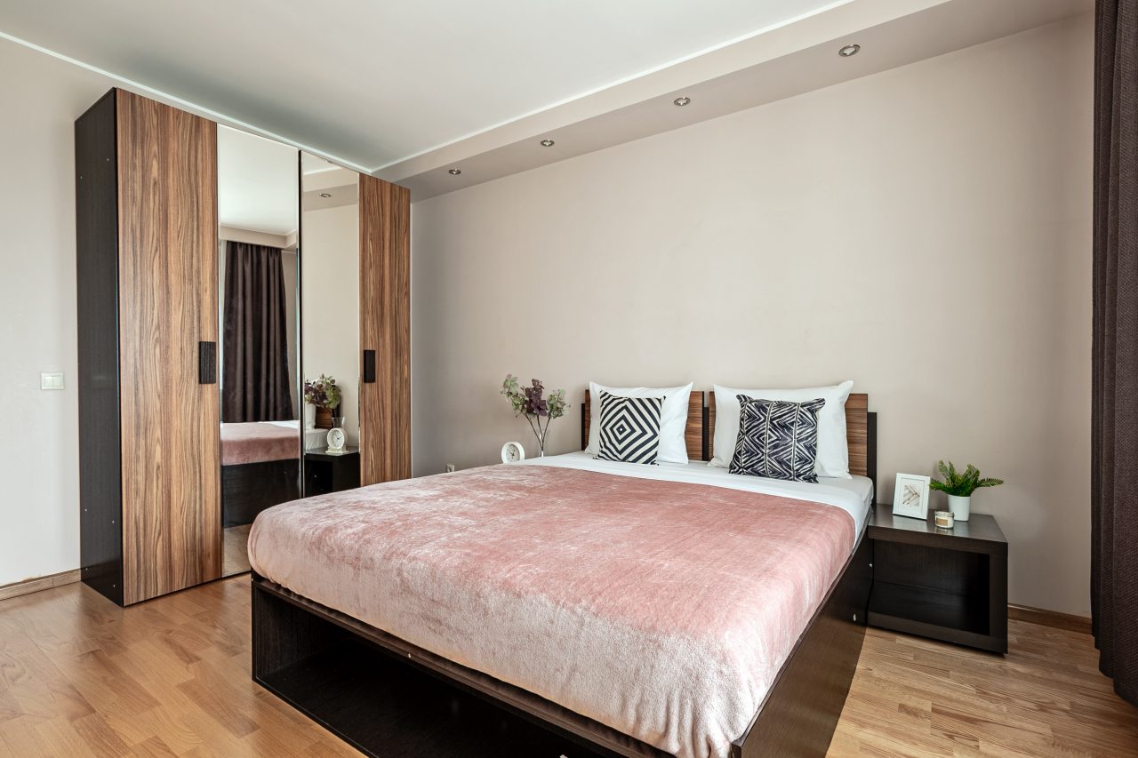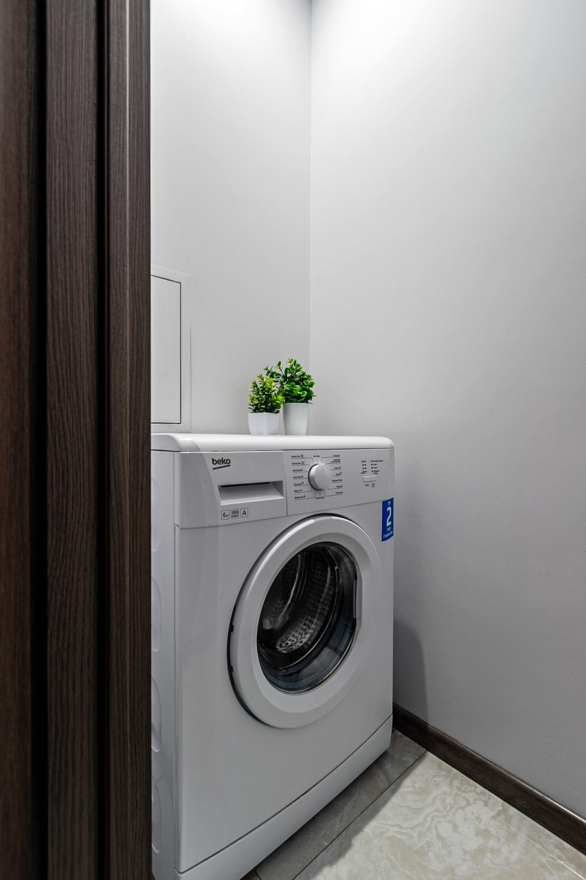 Апартаменты оснащены двуспальной кроватью, шкафом, телевизором, прикроватной мебелью. Есть доступ к бесплатному Wi-Fi. Санузел оборудован ванной, стиральной машиной. Для гостей выдаются: набор полотенец, постельного белья, фен.