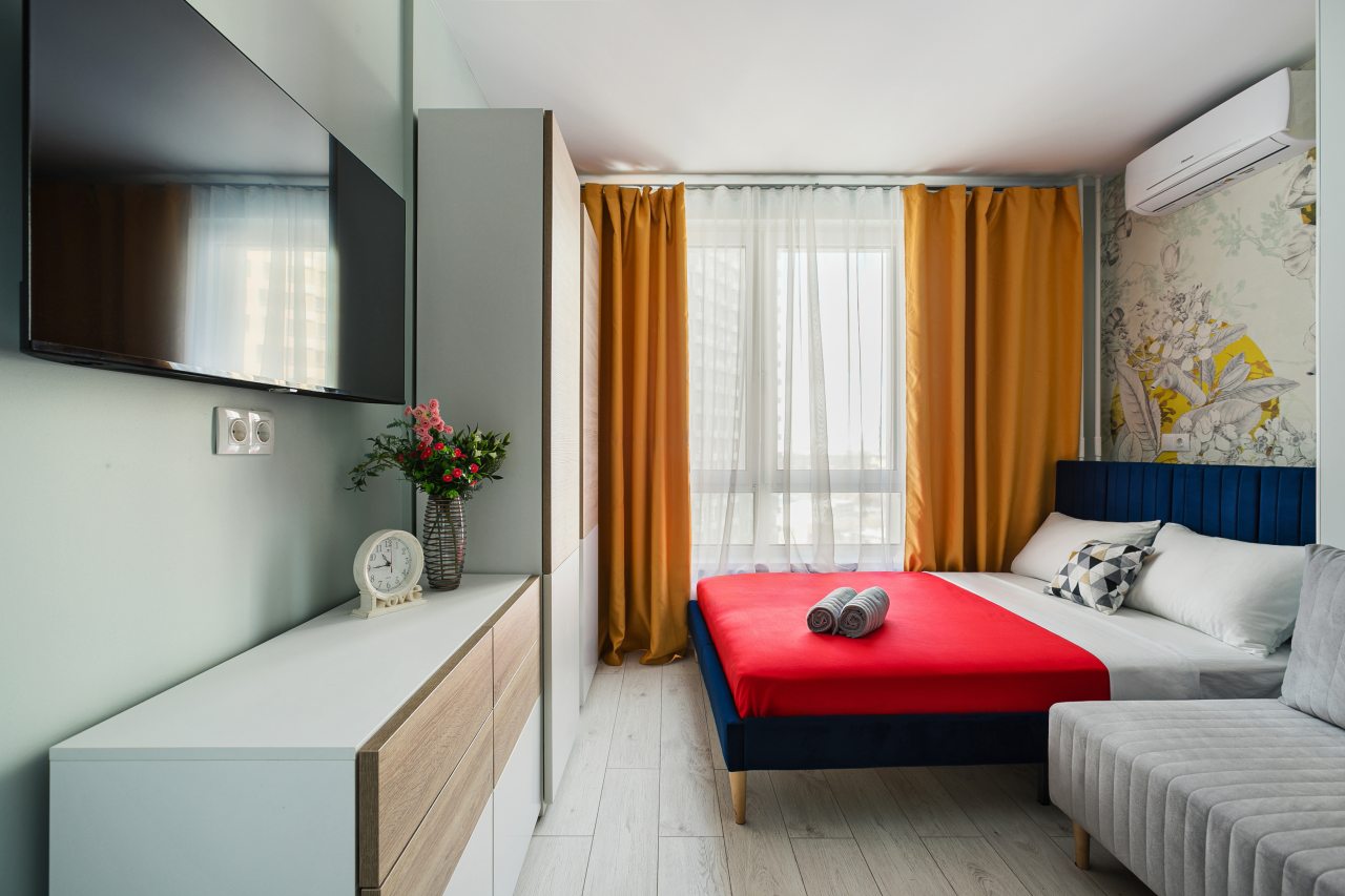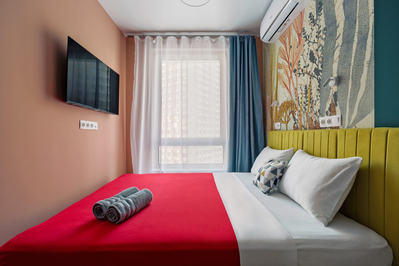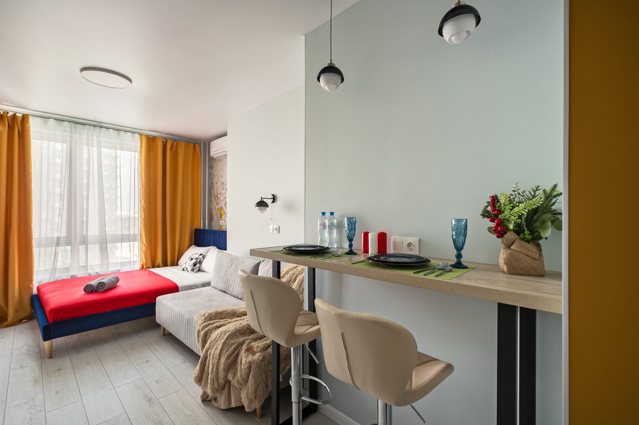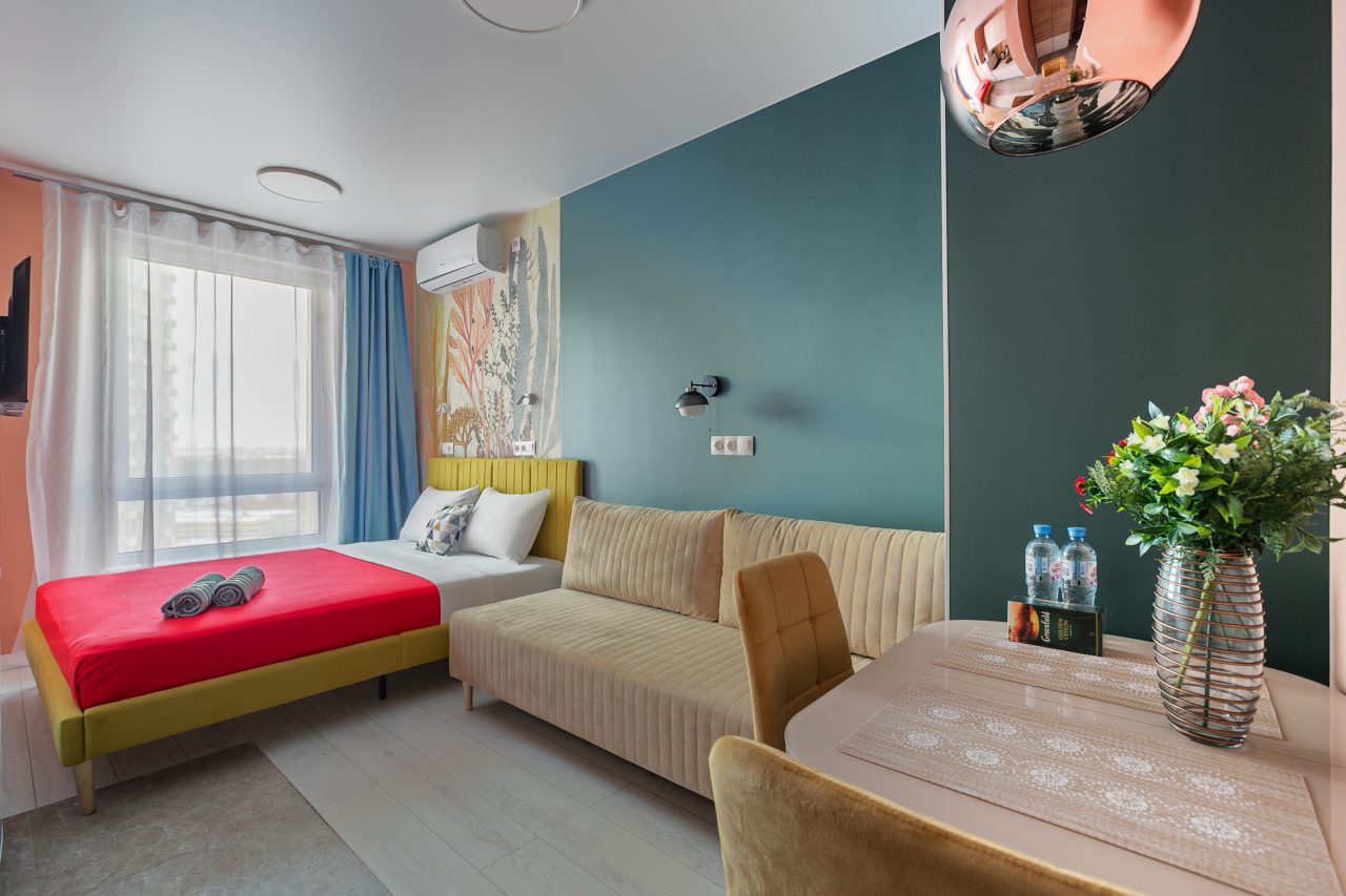 Апартаменты с современным ремонтом в ярких цветах. Здесь гости смогут разместиться со всеми удобствами в комфортных условия. Квартира меблирована и оснащена техникой.
