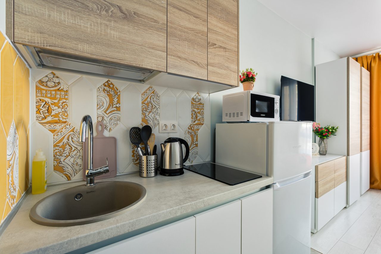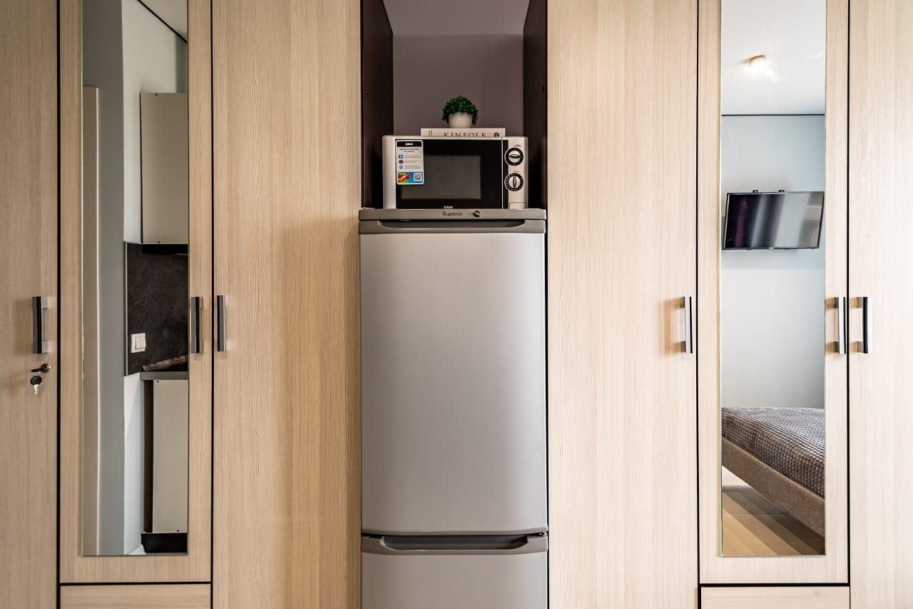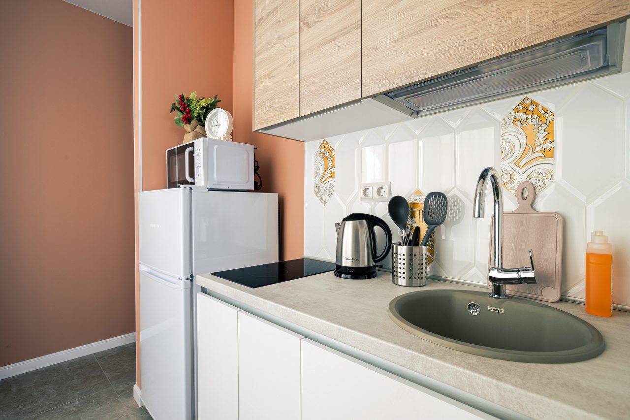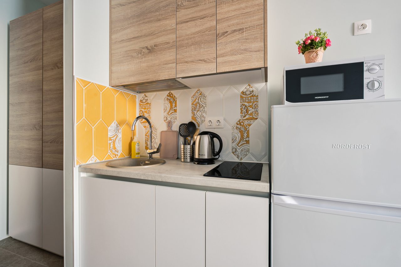 На кухне есть плита, микроволновая печь, холодильник и чайник — все для самостоятельной готовки.