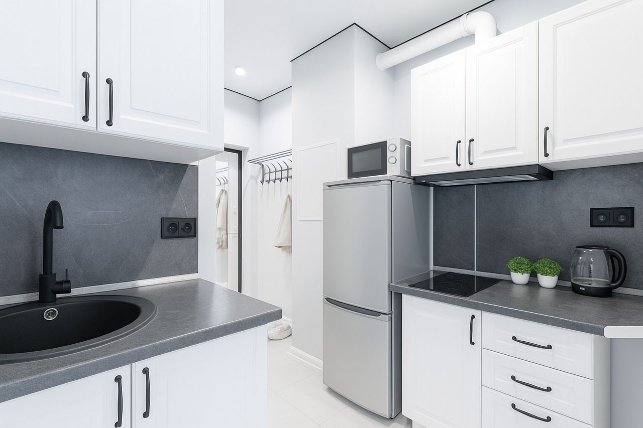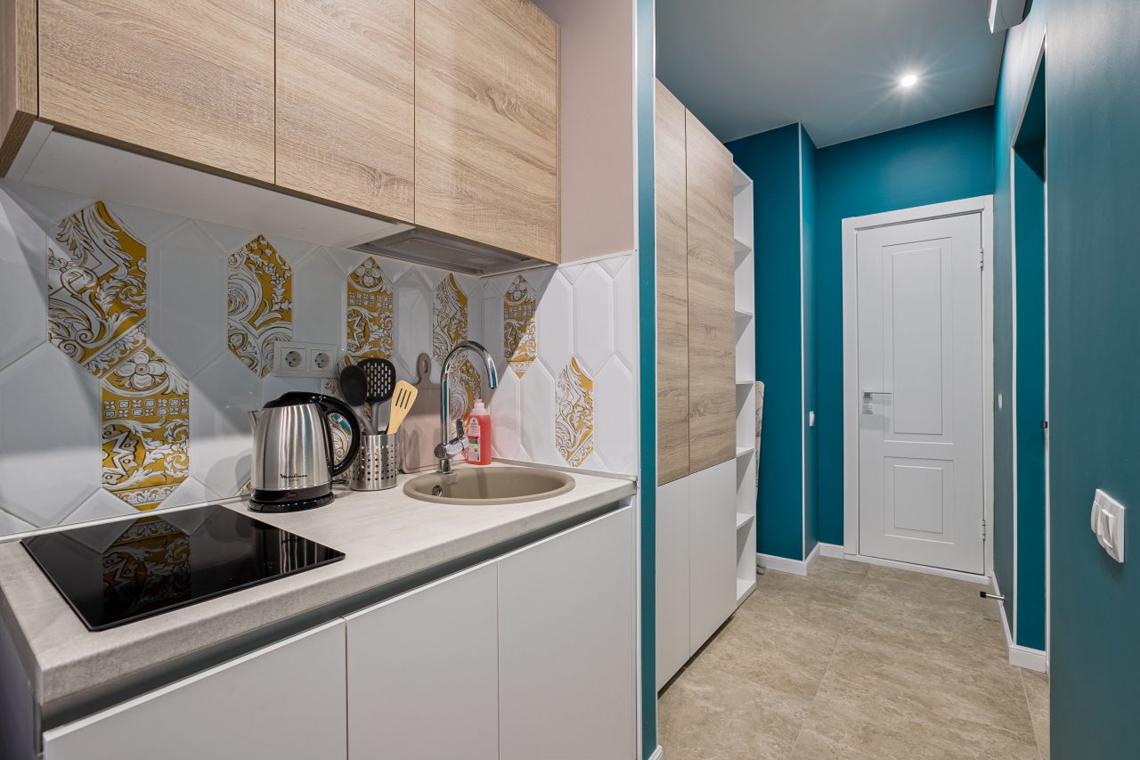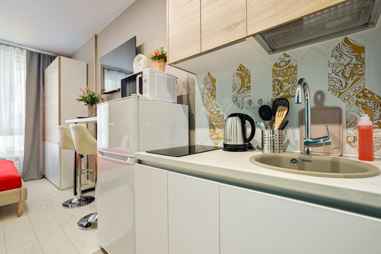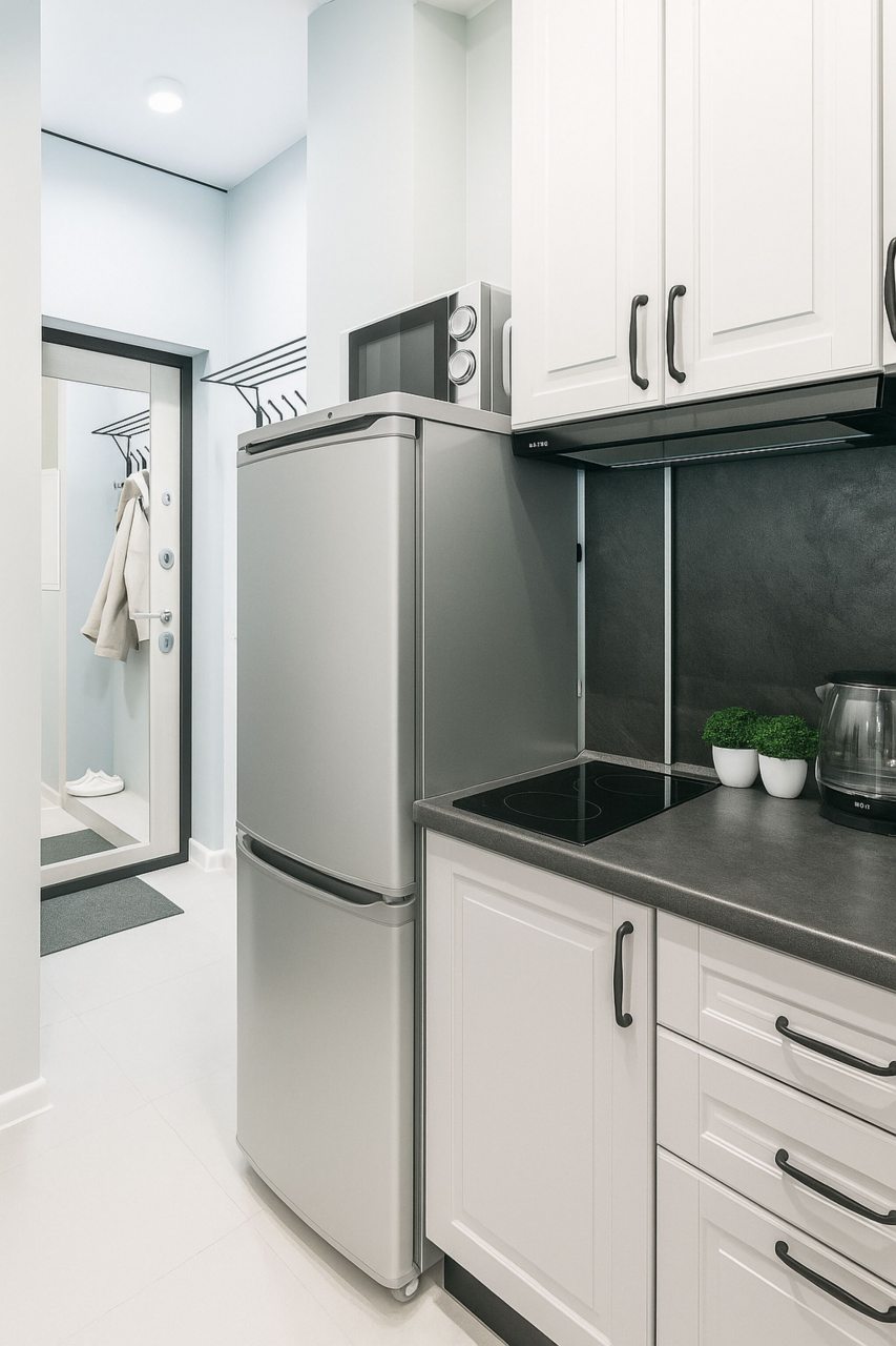 На кухне есть плита, микроволновая печь, холодильник и чайник — все для самостоятельной готовки.