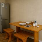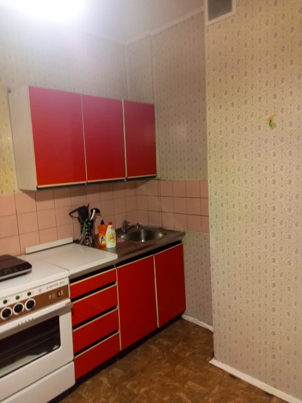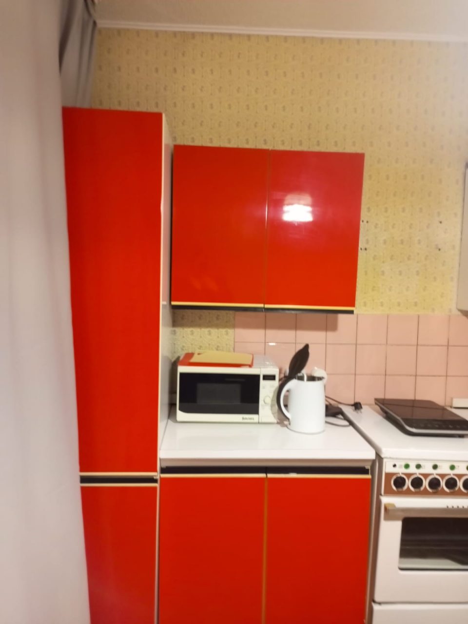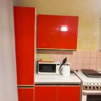 На кухне с ярким гарнитуром вы сможете готовить любимые блюда, так как в наличии плита, чайник, СВЧ-печь, духовой шкаф и обеденный стол со стульями.