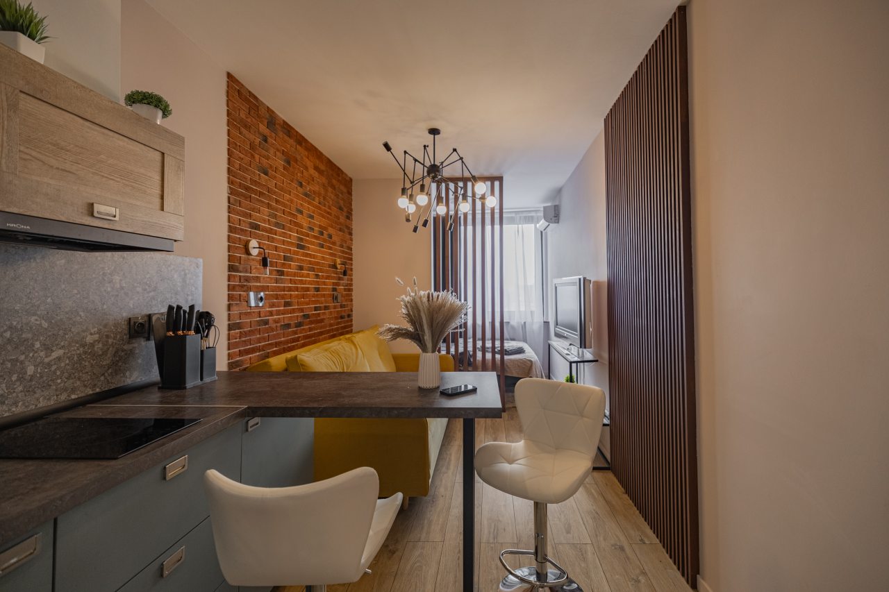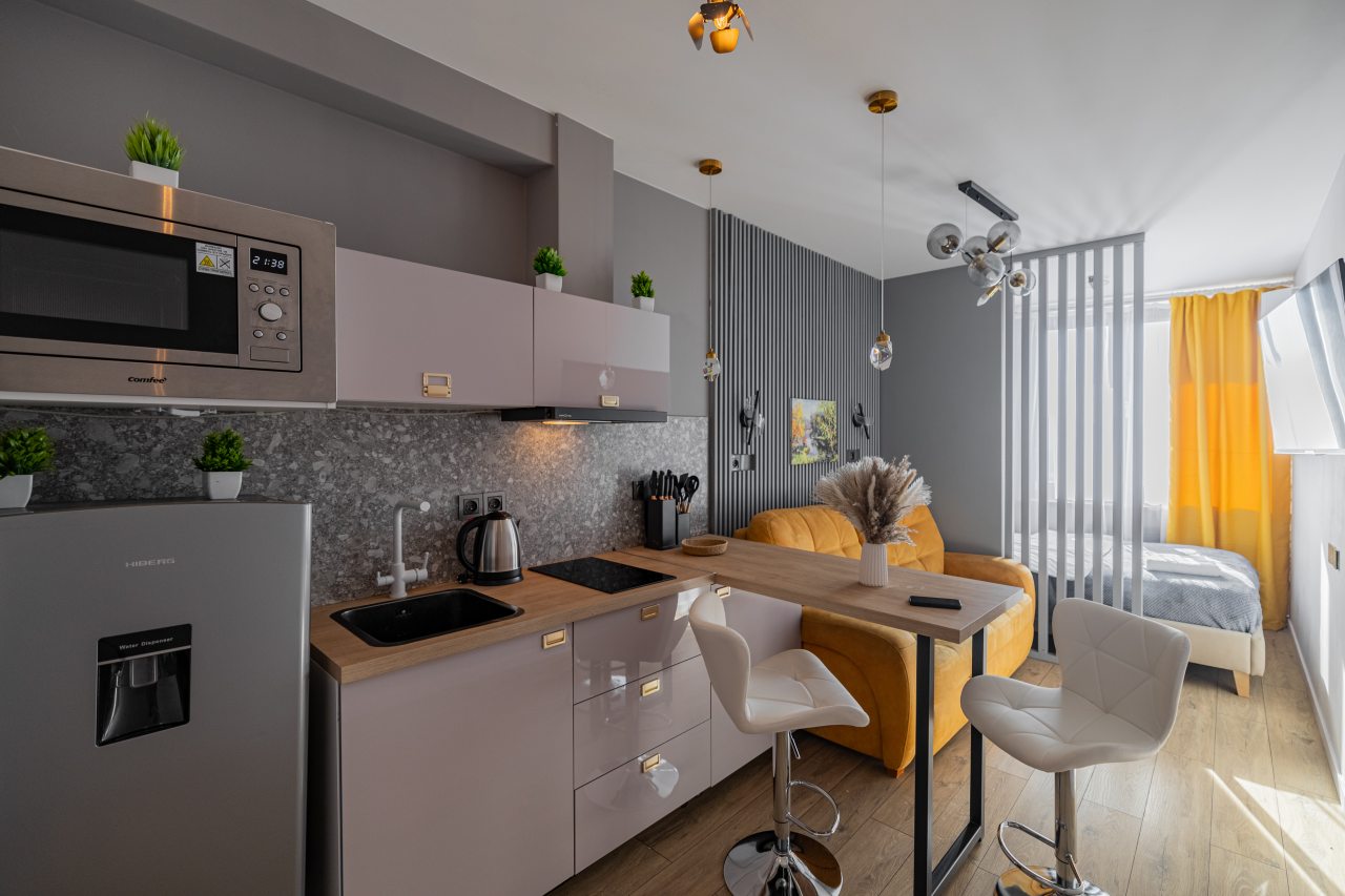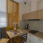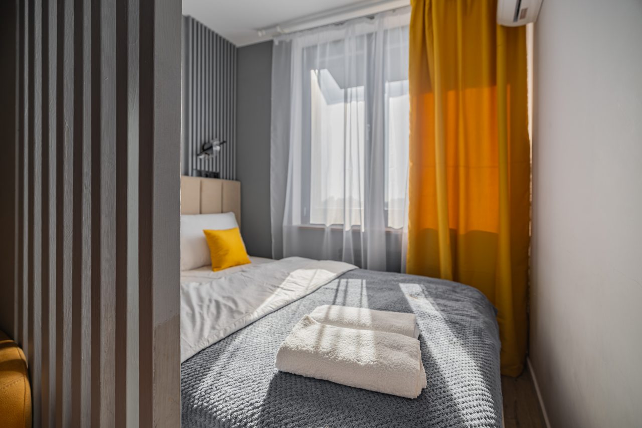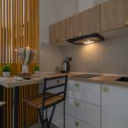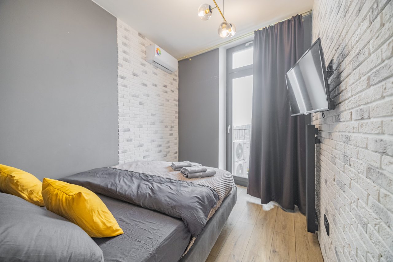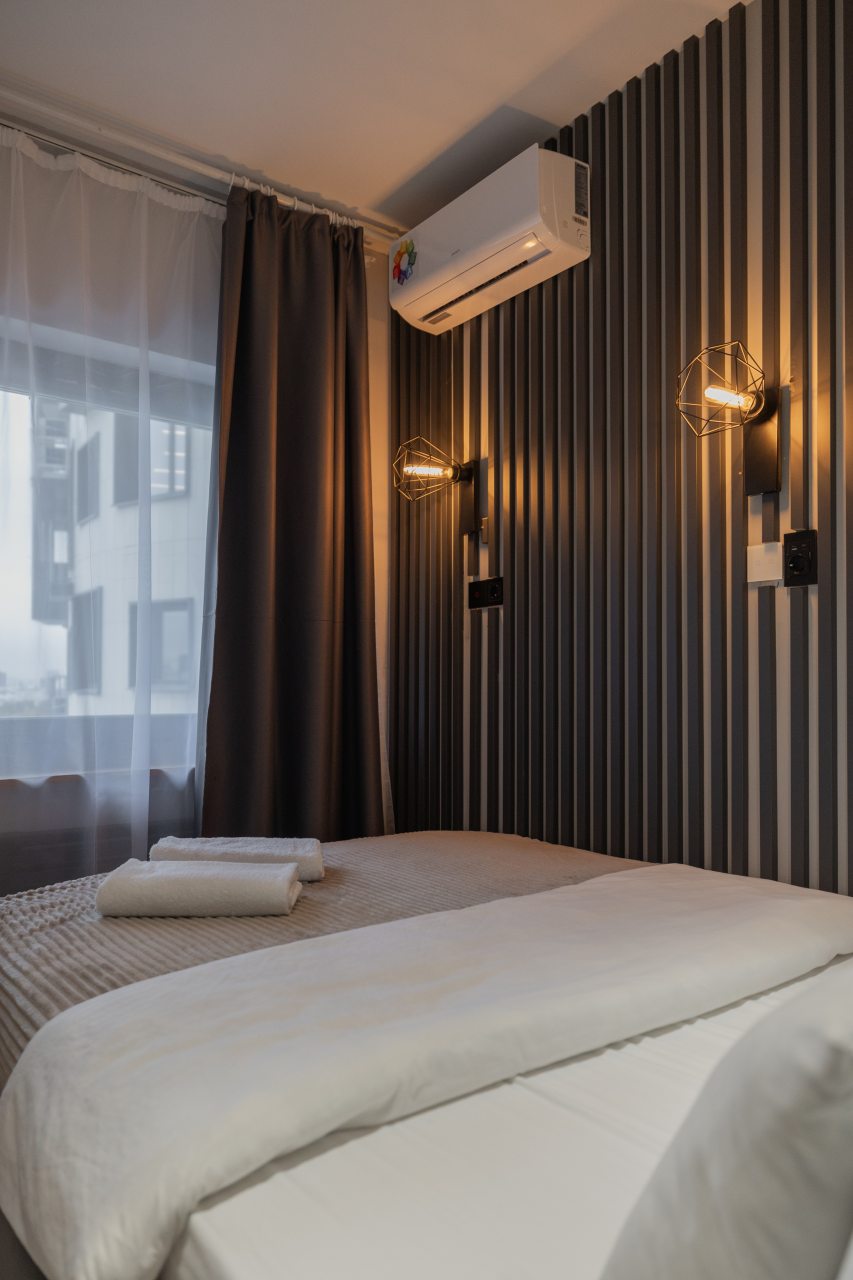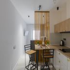 Апартаменты подойдут для 2-4 гостей. Они выполнены в современном стиле интерьера и оснащены мебелью и техникой для комфортного времяпровождения. В санузле установлен душ и имеются средства гигиены.
