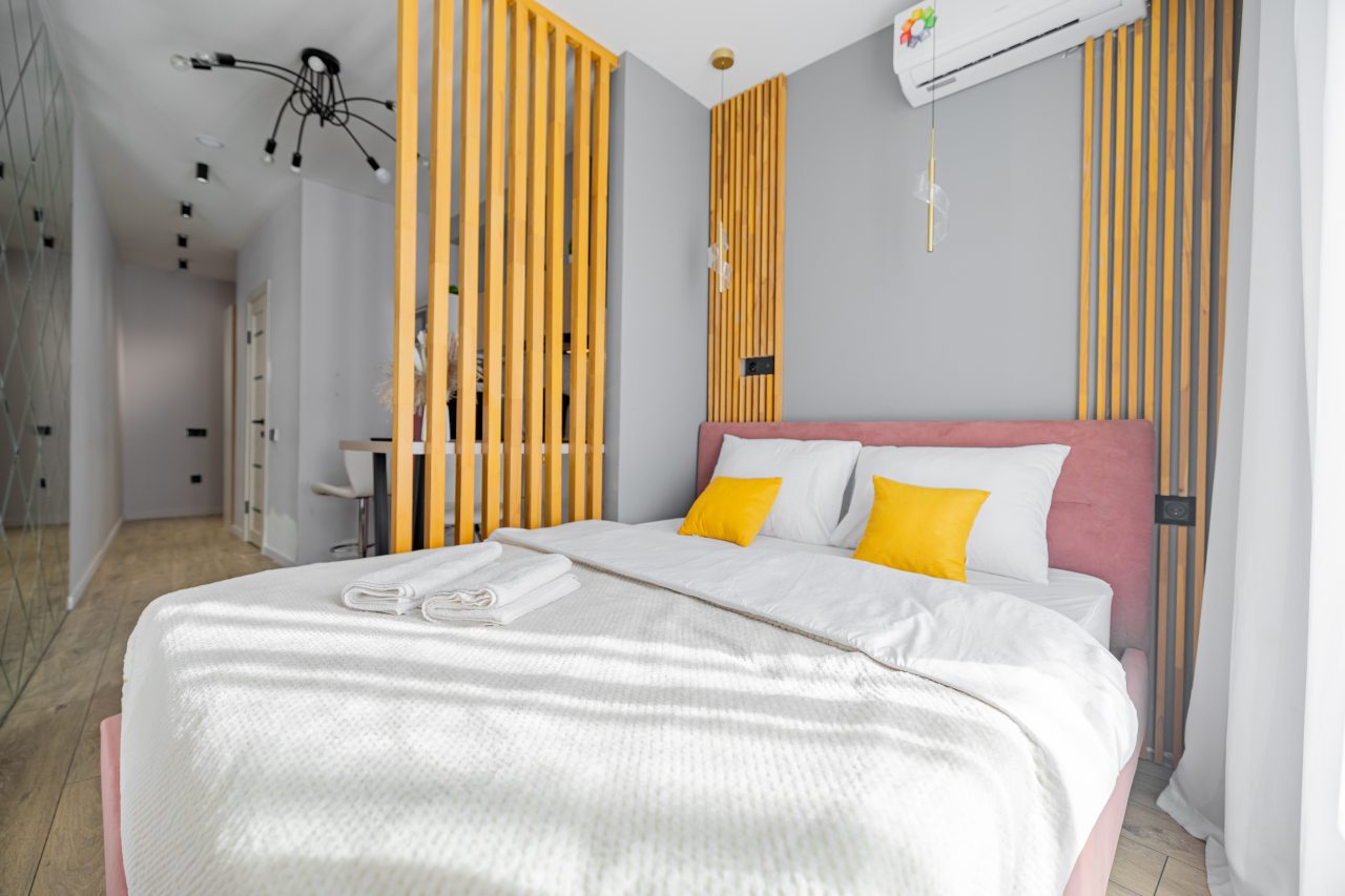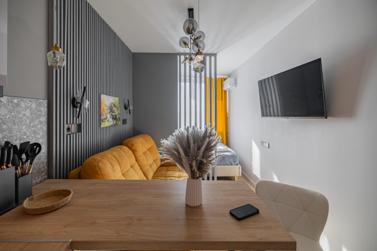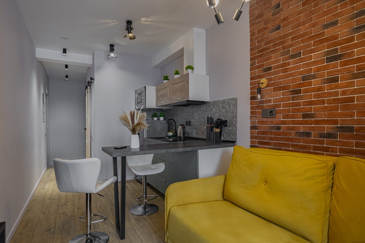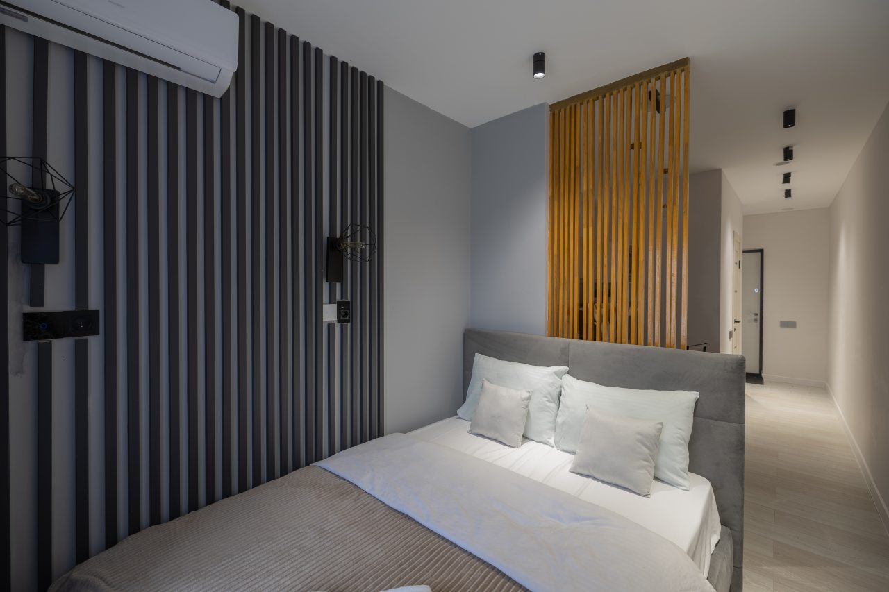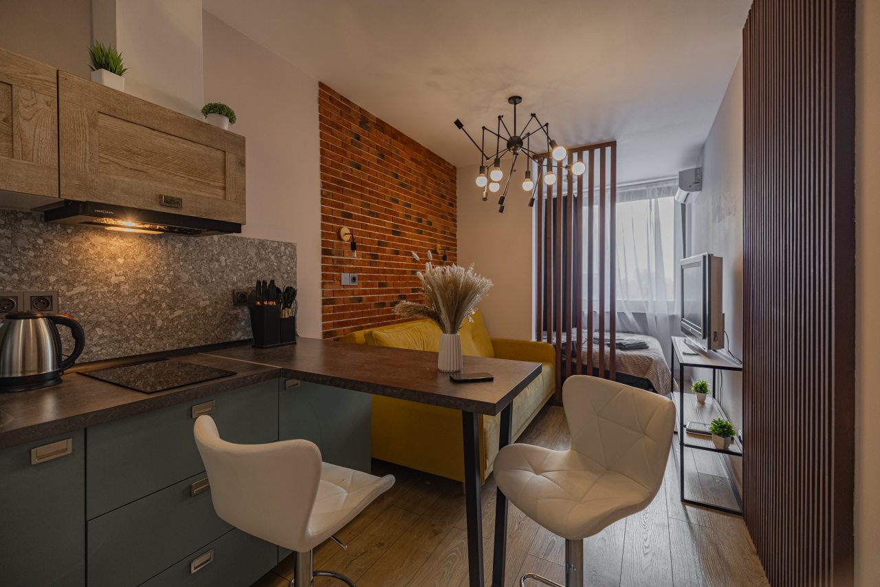 Апартаменты подойдут для 2-4 гостей. Они выполнены в современном стиле интерьера и оснащены мебелью и техникой для комфортного времяпровождения. В санузле установлен душ и имеются средства гигиены.