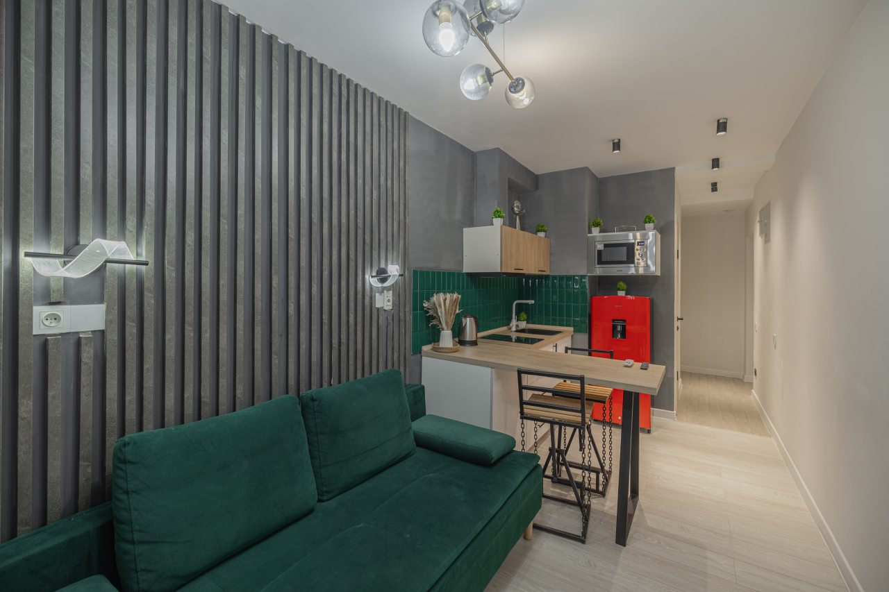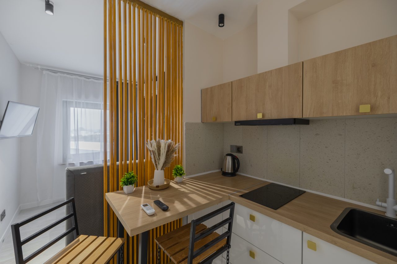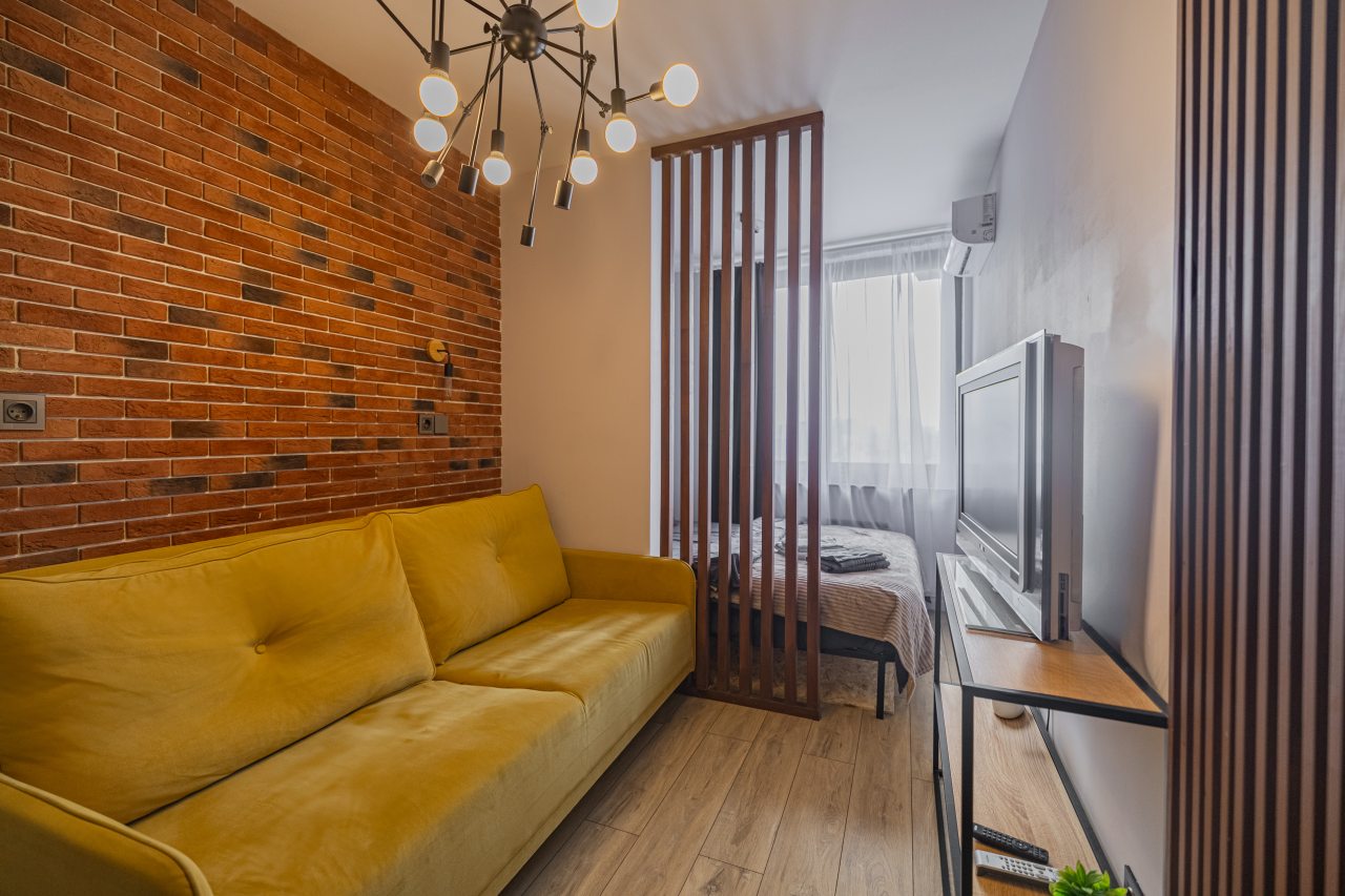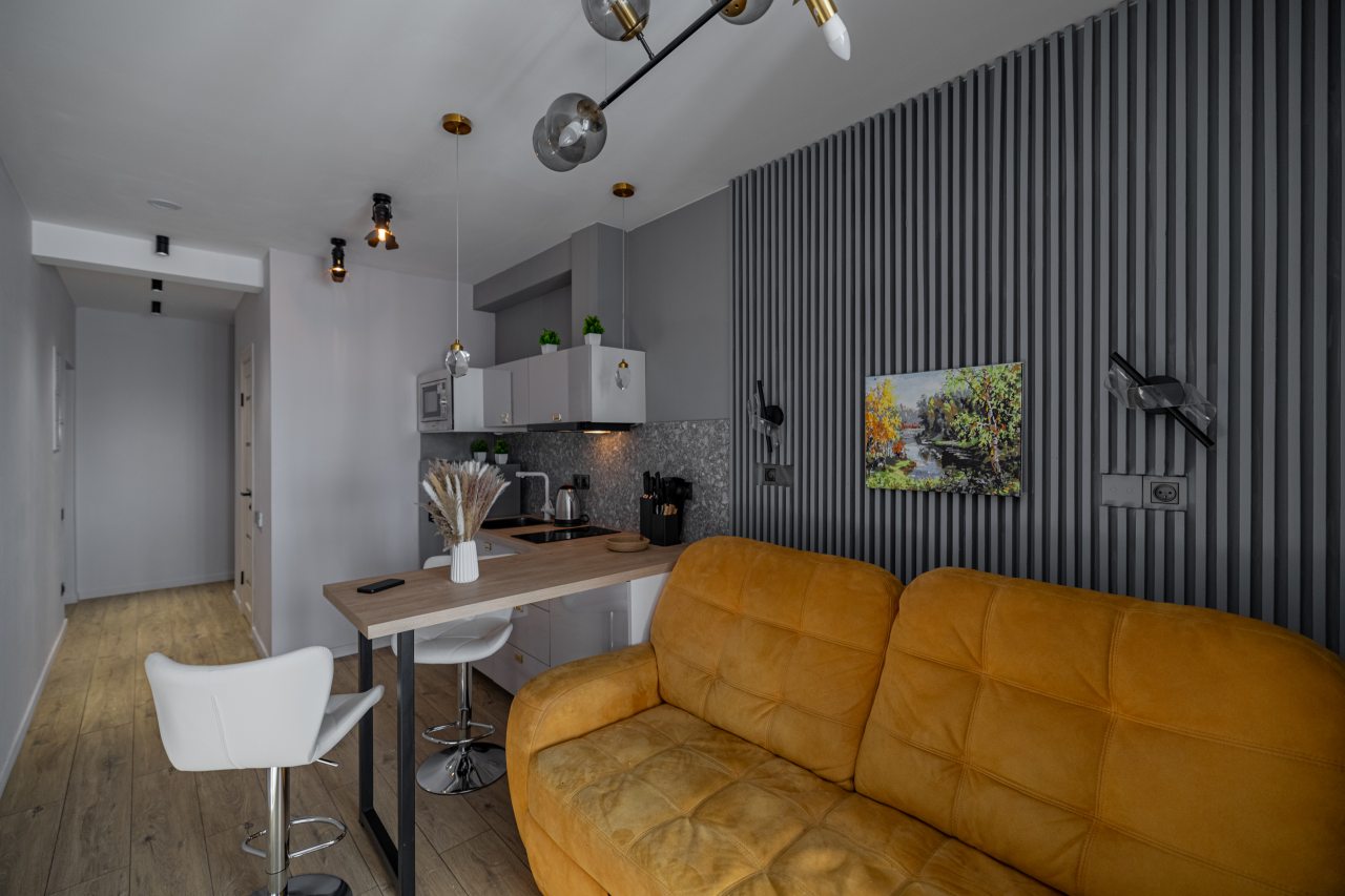 Апартаменты подойдут для 2-4 гостей. Они выполнены в современном стиле интерьера и оснащены мебелью и техникой для комфортного времяпровождения. В санузле установлен душ и имеются средства гигиены.
