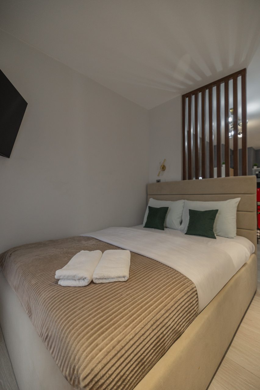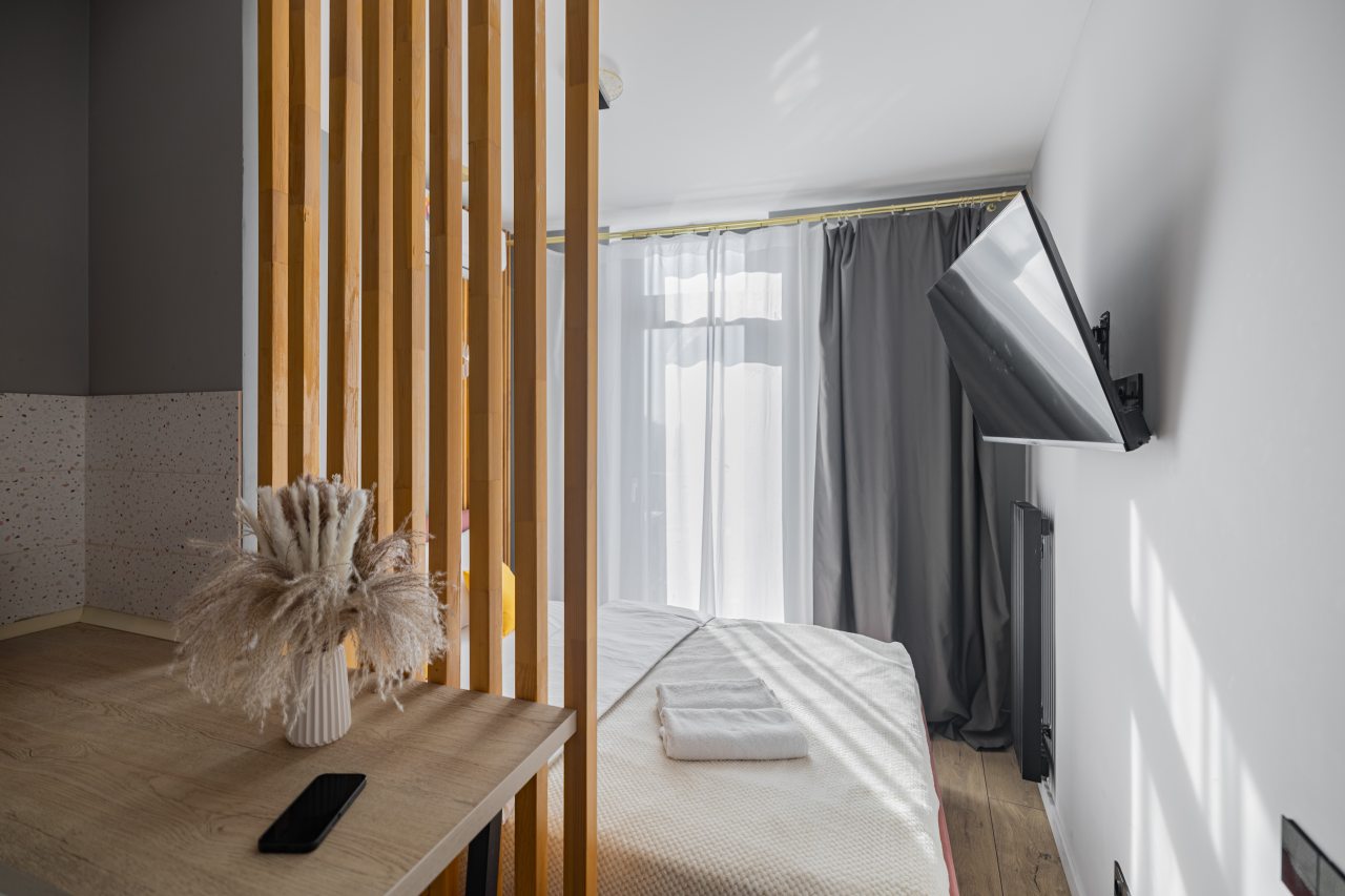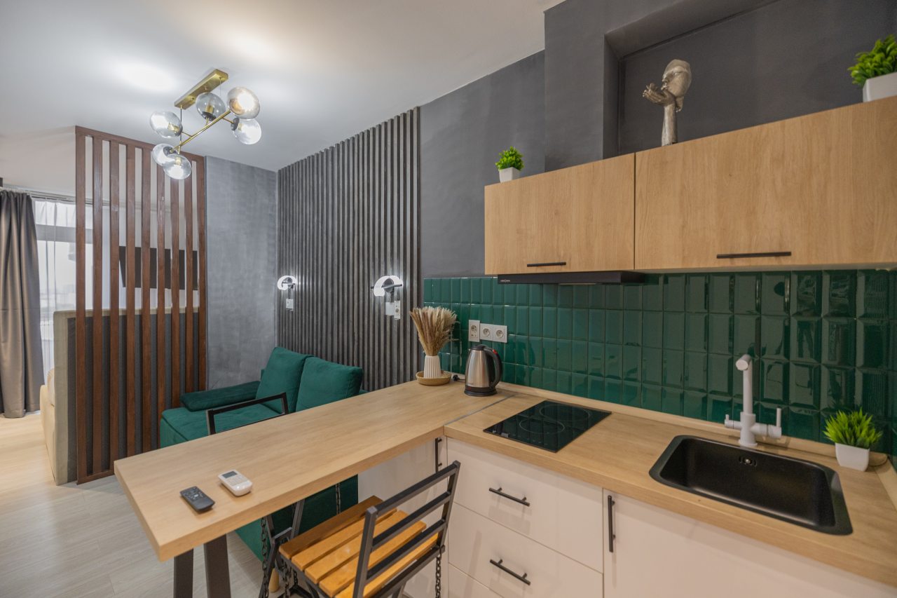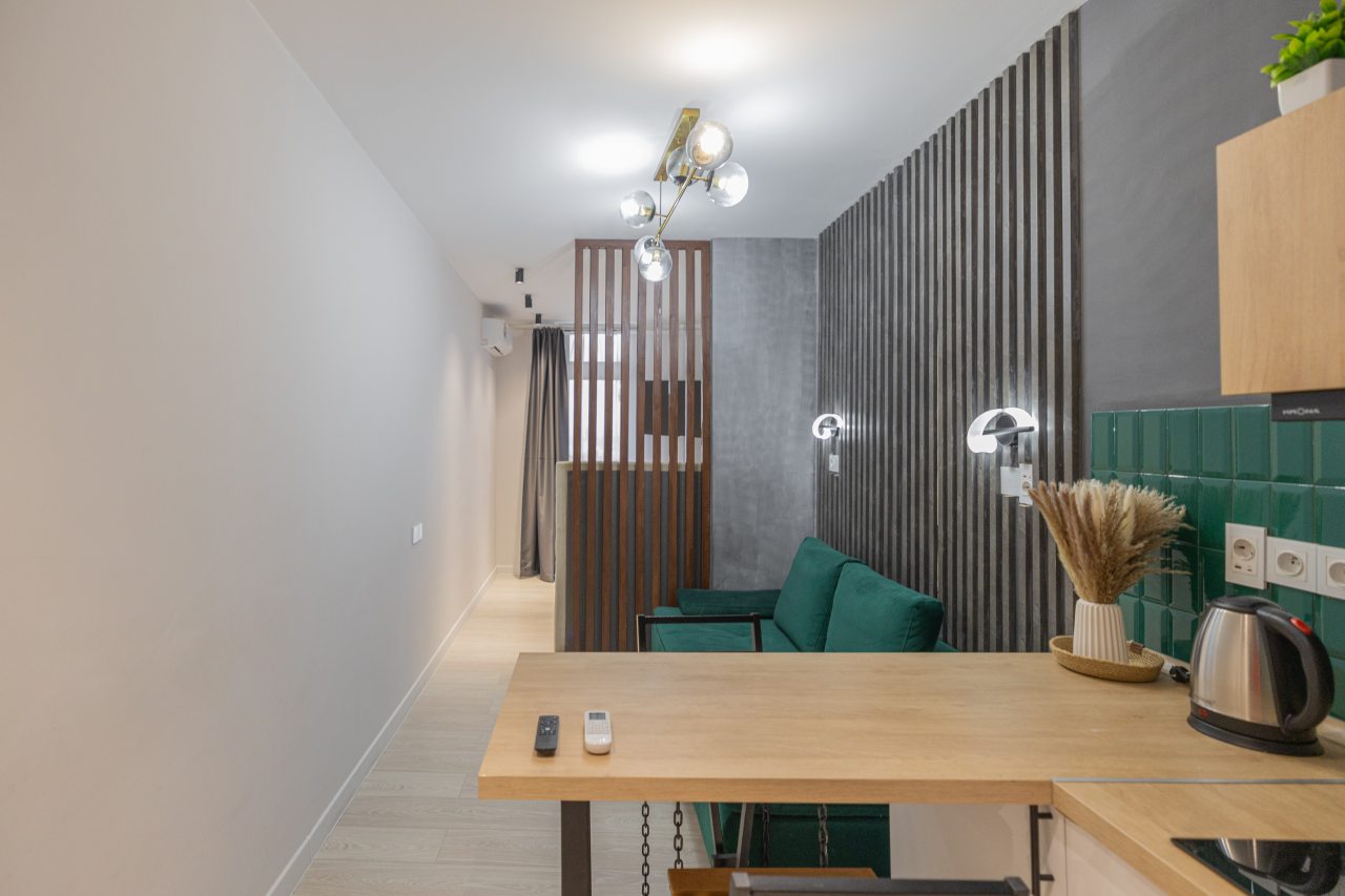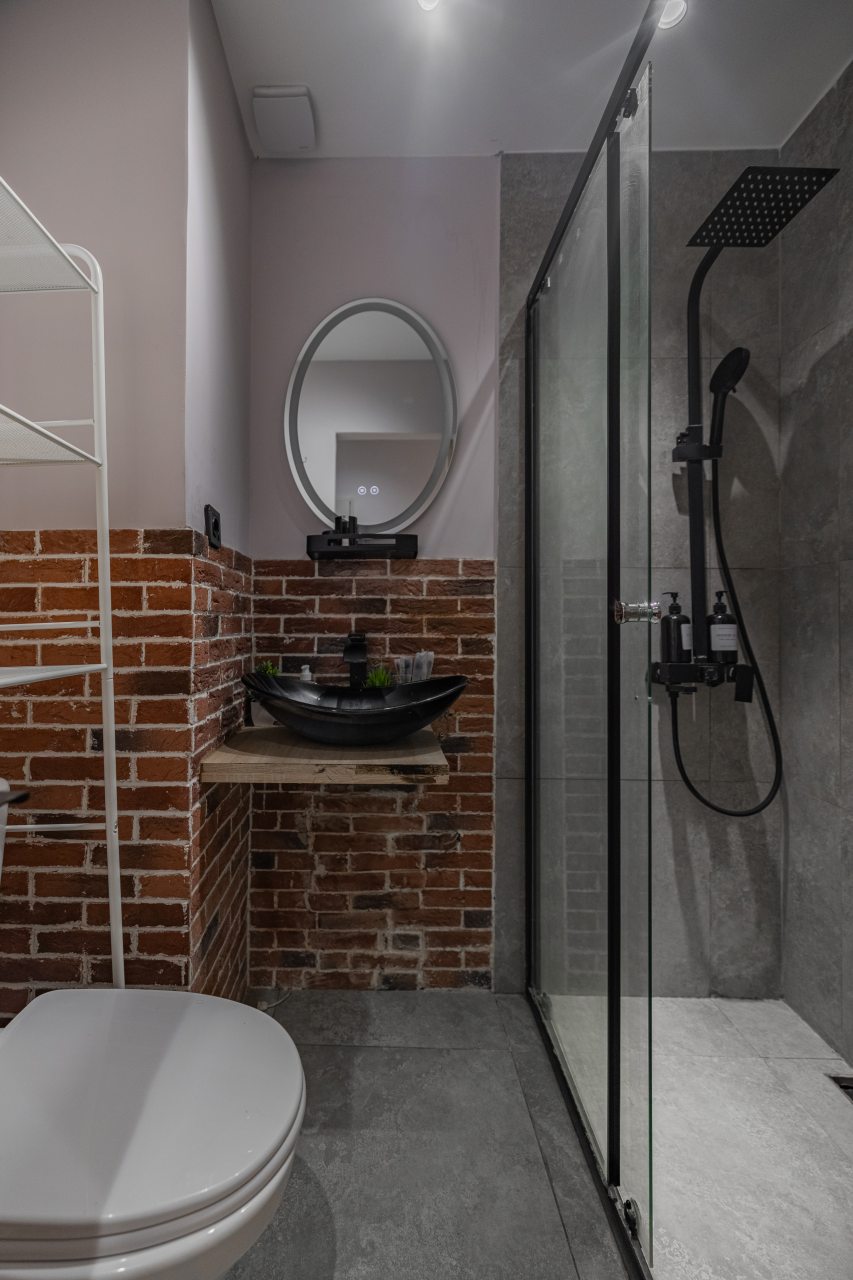 Апартаменты подойдут для 2-4 гостей. Они выполнены в современном стиле интерьера и оснащены мебелью и техникой для комфортного времяпровождения. В санузле установлен душ и имеются средства гигиены.