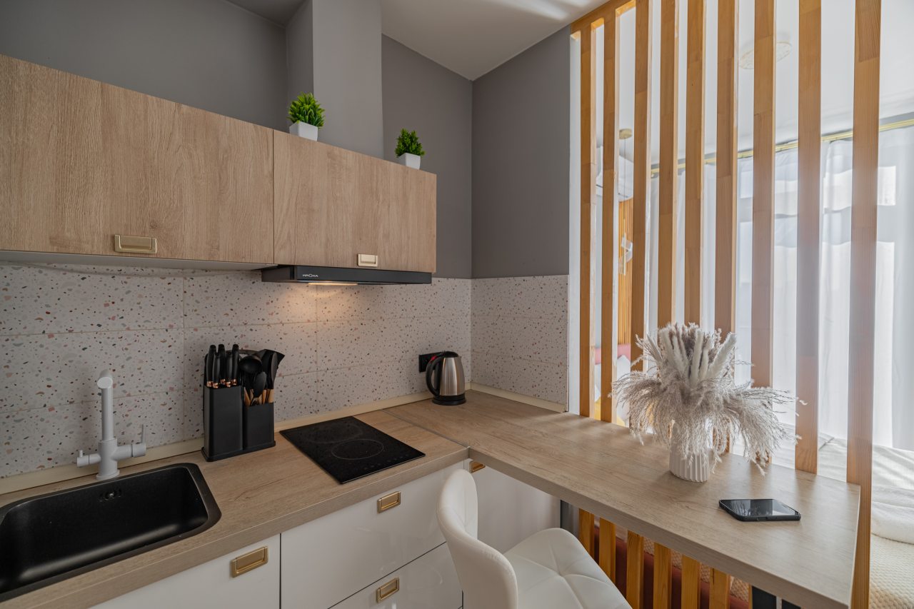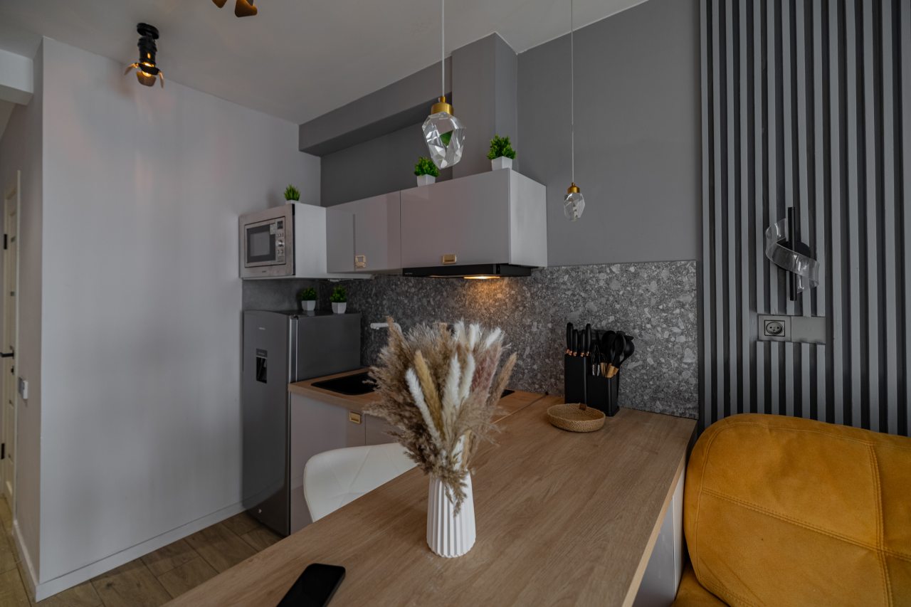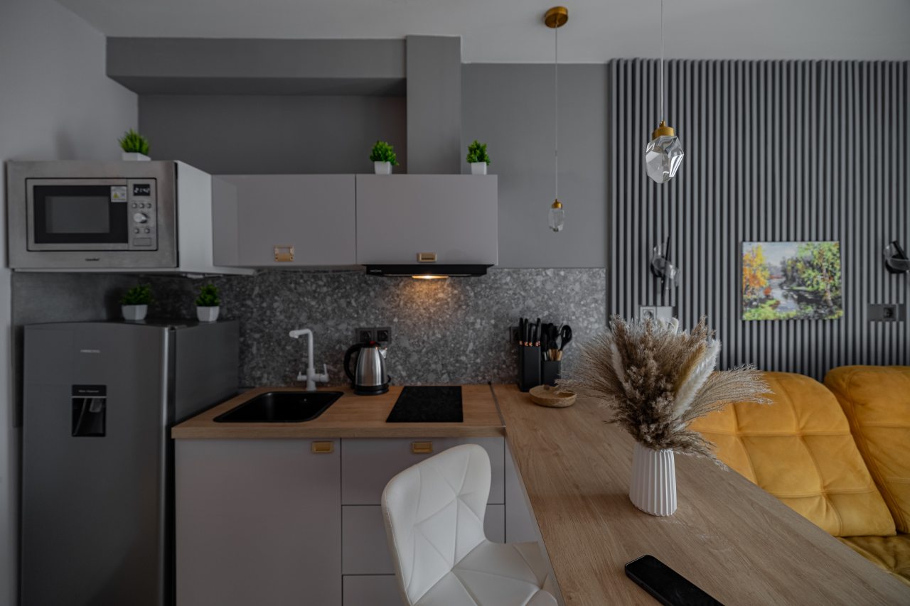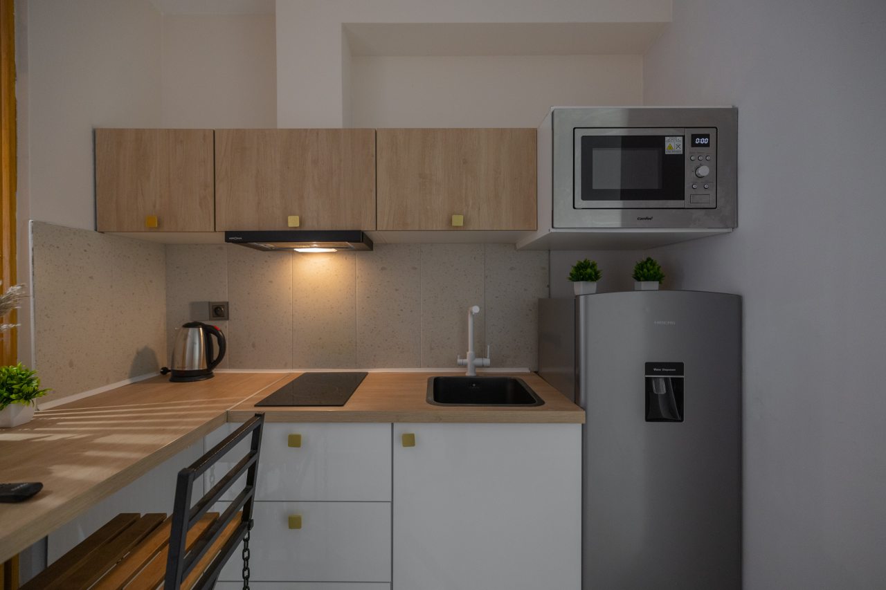 Светлая кухня идеально подходит для самостоятельной организации питания, благодаря бытовым приборам, обеденной зоне и необходимой посуде. В шаговой доступности есть пекарня и супермаркет.