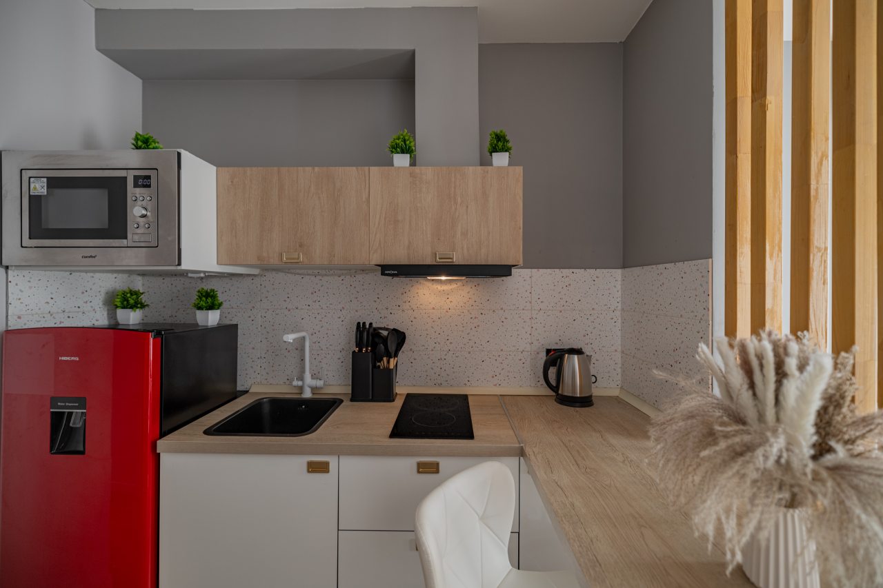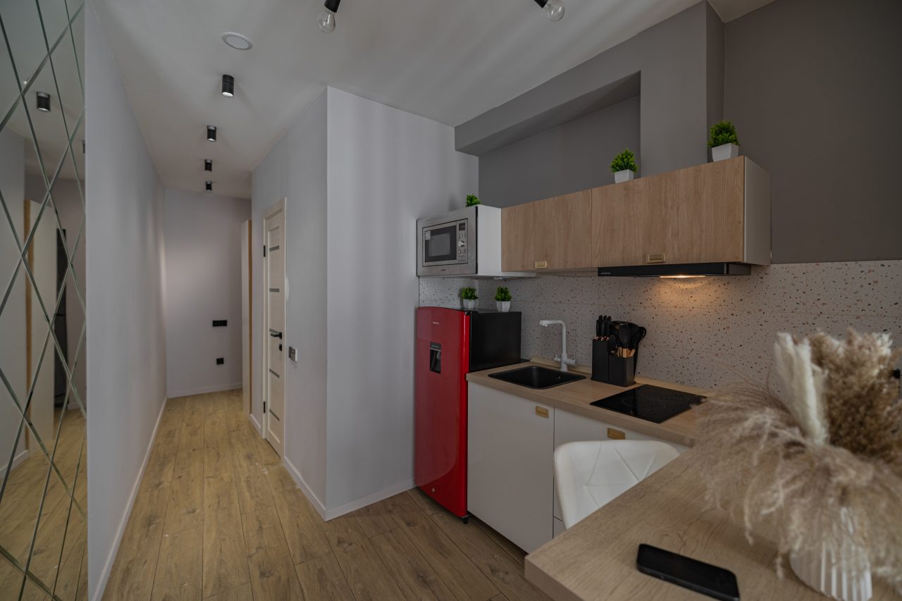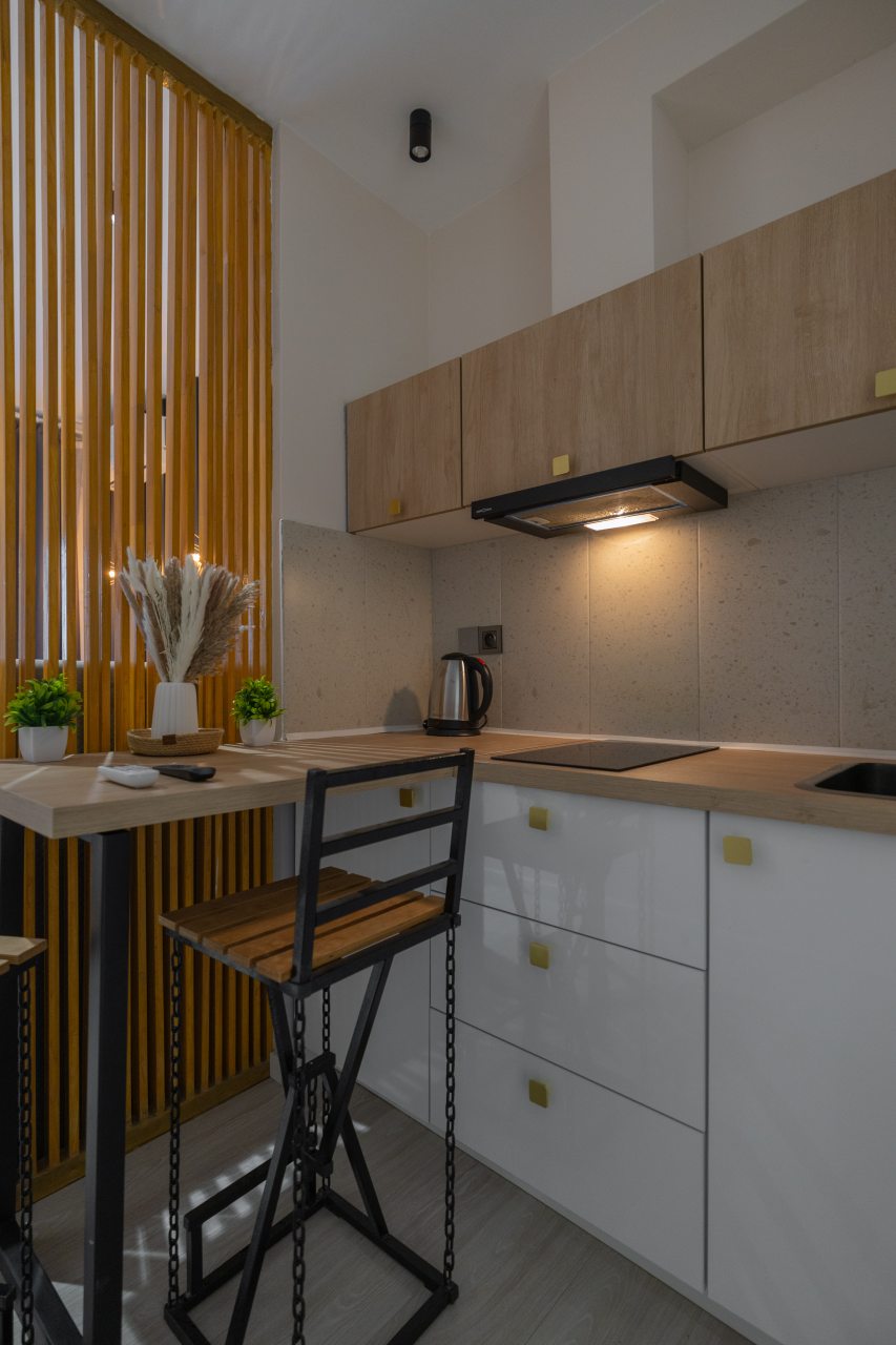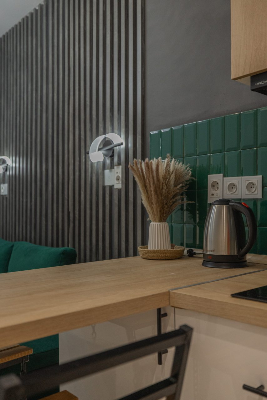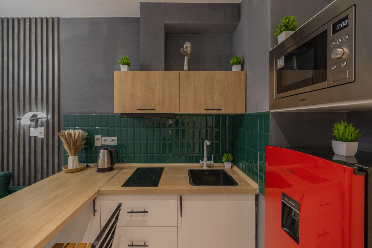 Светлая кухня идеально подходит для самостоятельной организации питания, благодаря бытовым приборам, обеденной зоне и необходимой посуде. В шаговой доступности есть пекарня и супермаркет.