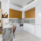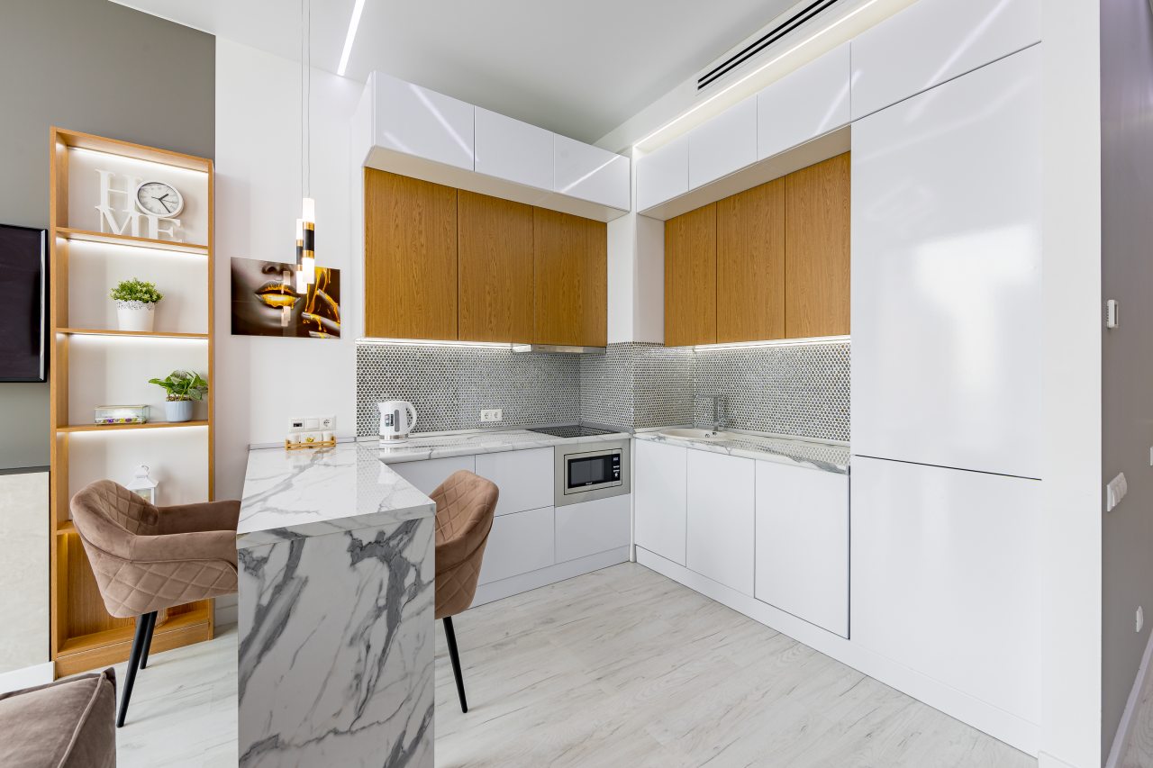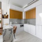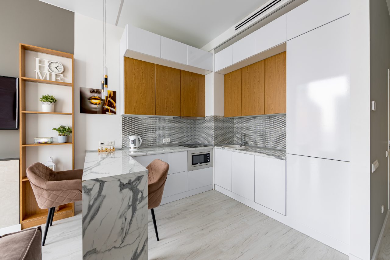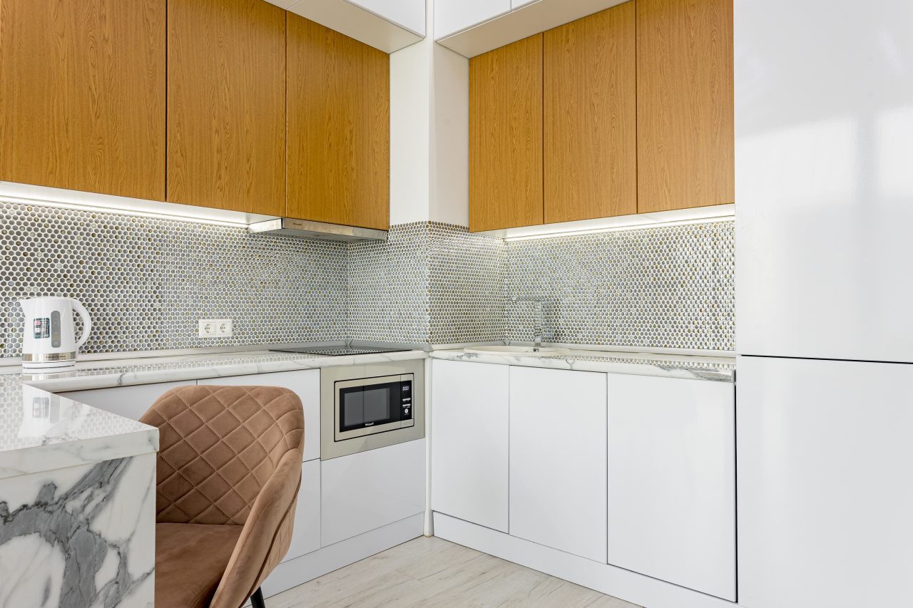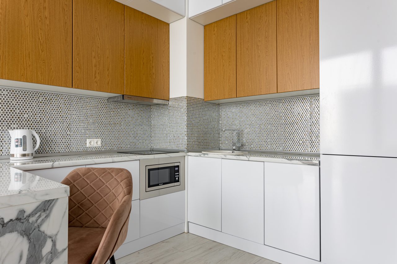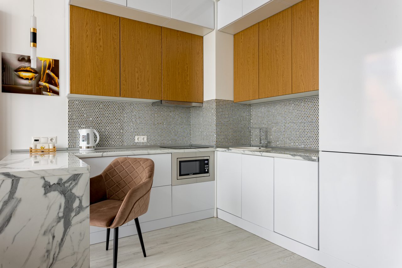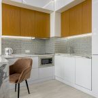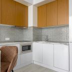 Уютная кухня оснащена обеденной зоной и техникой для самостоятельной организации питания: варочная панель, микроволновая печь, электрический чайник.