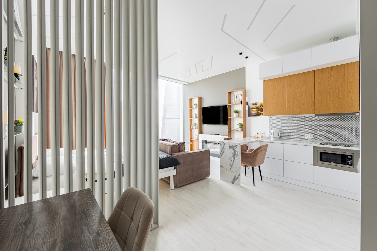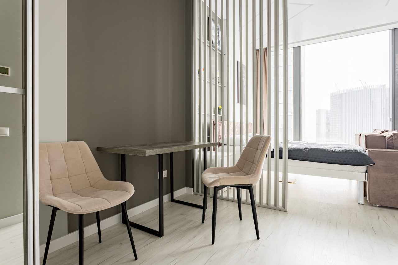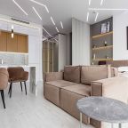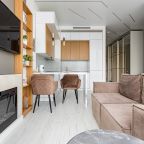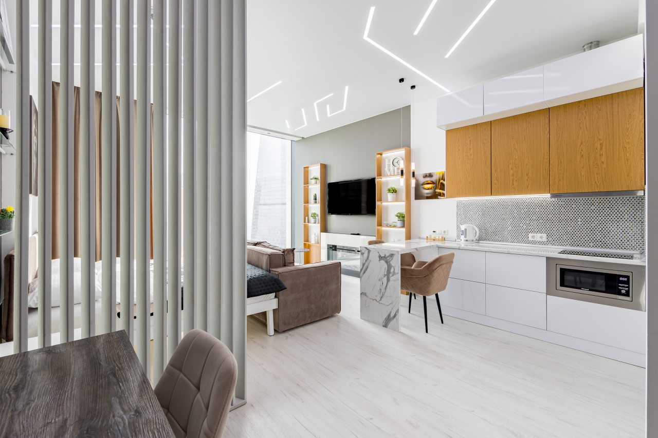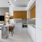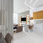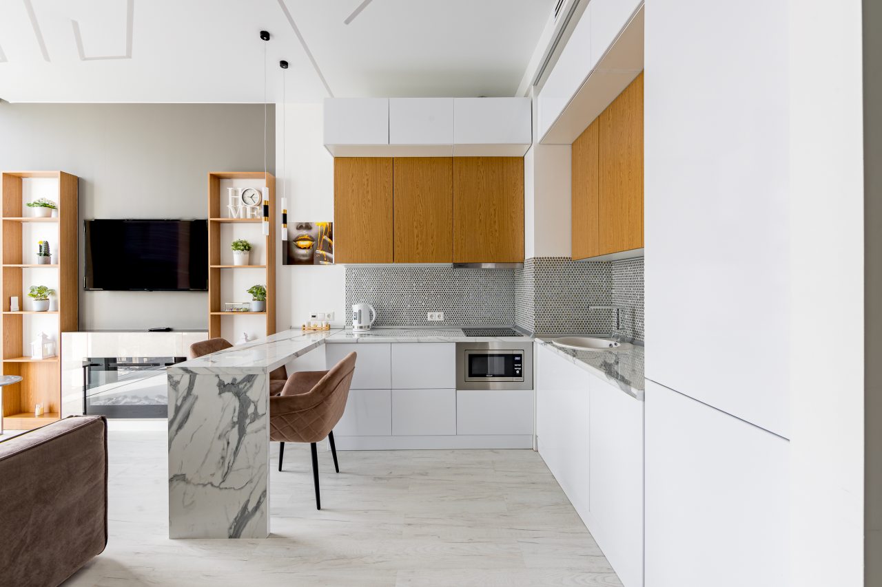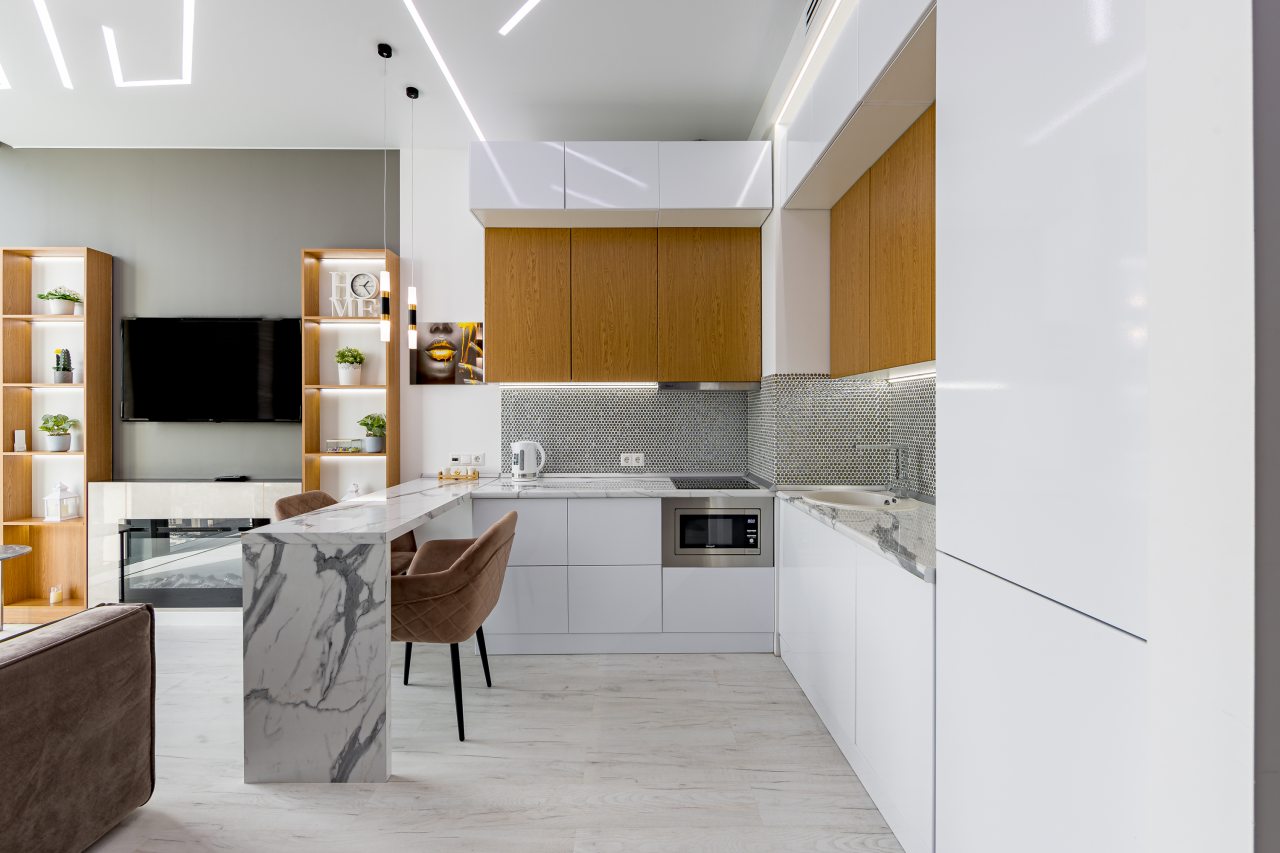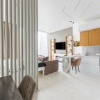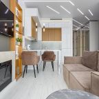 Уютная кухня оснащена обеденной зоной и техникой для самостоятельной организации питания: варочная панель, микроволновая печь, электрический чайник.