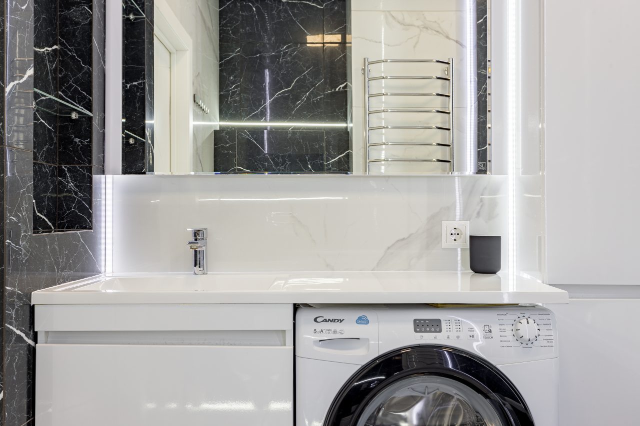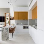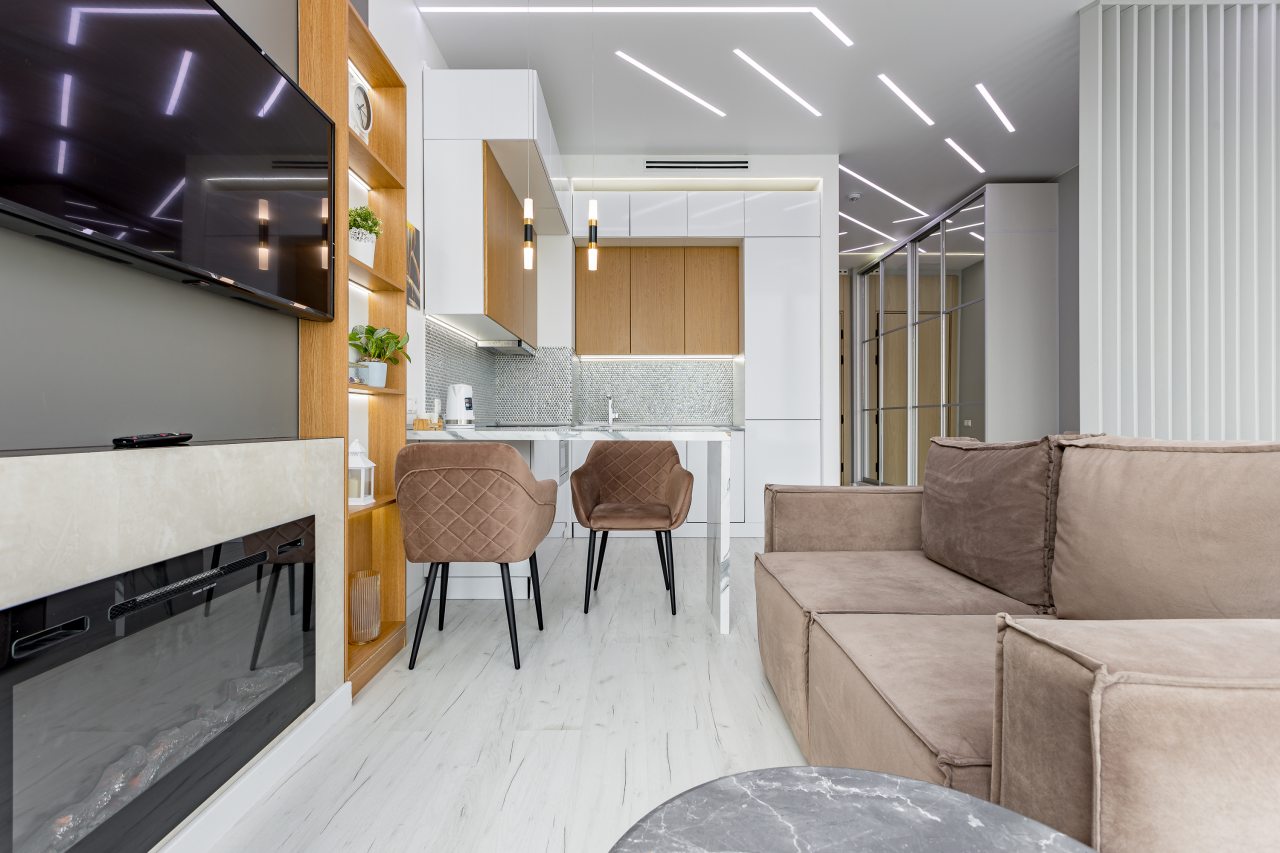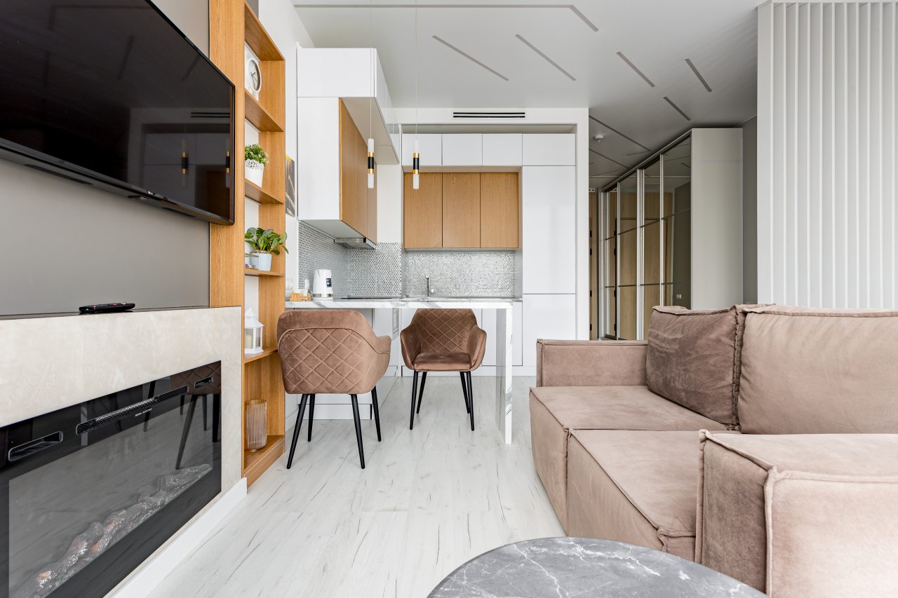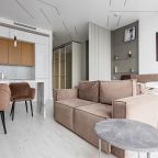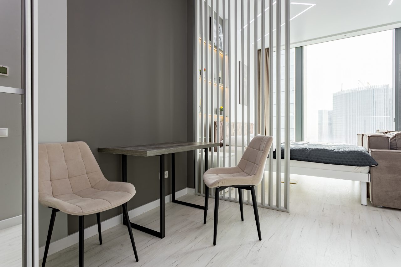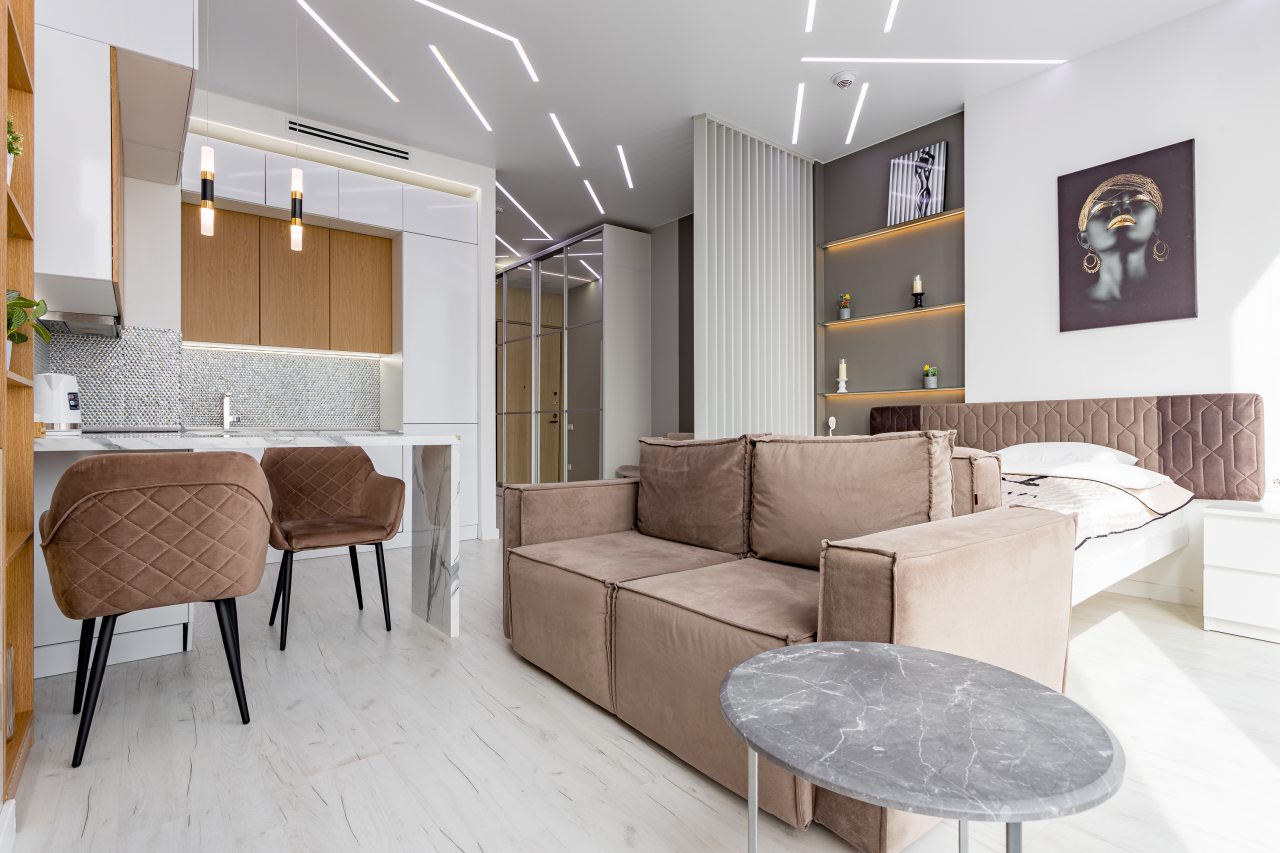 Уютная кухня оснащена обеденной зоной и техникой для самостоятельной организации питания: варочная панель, микроволновая печь, электрический чайник.