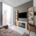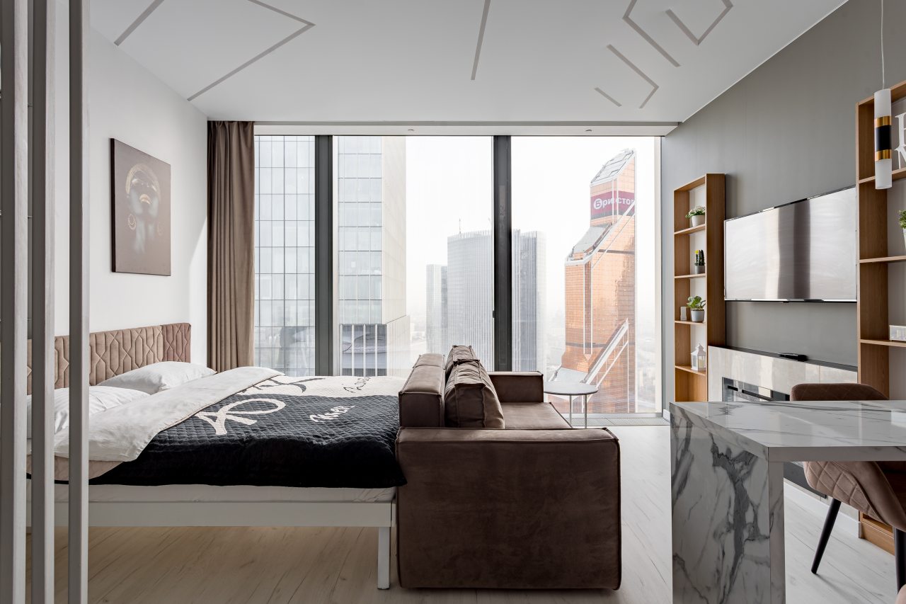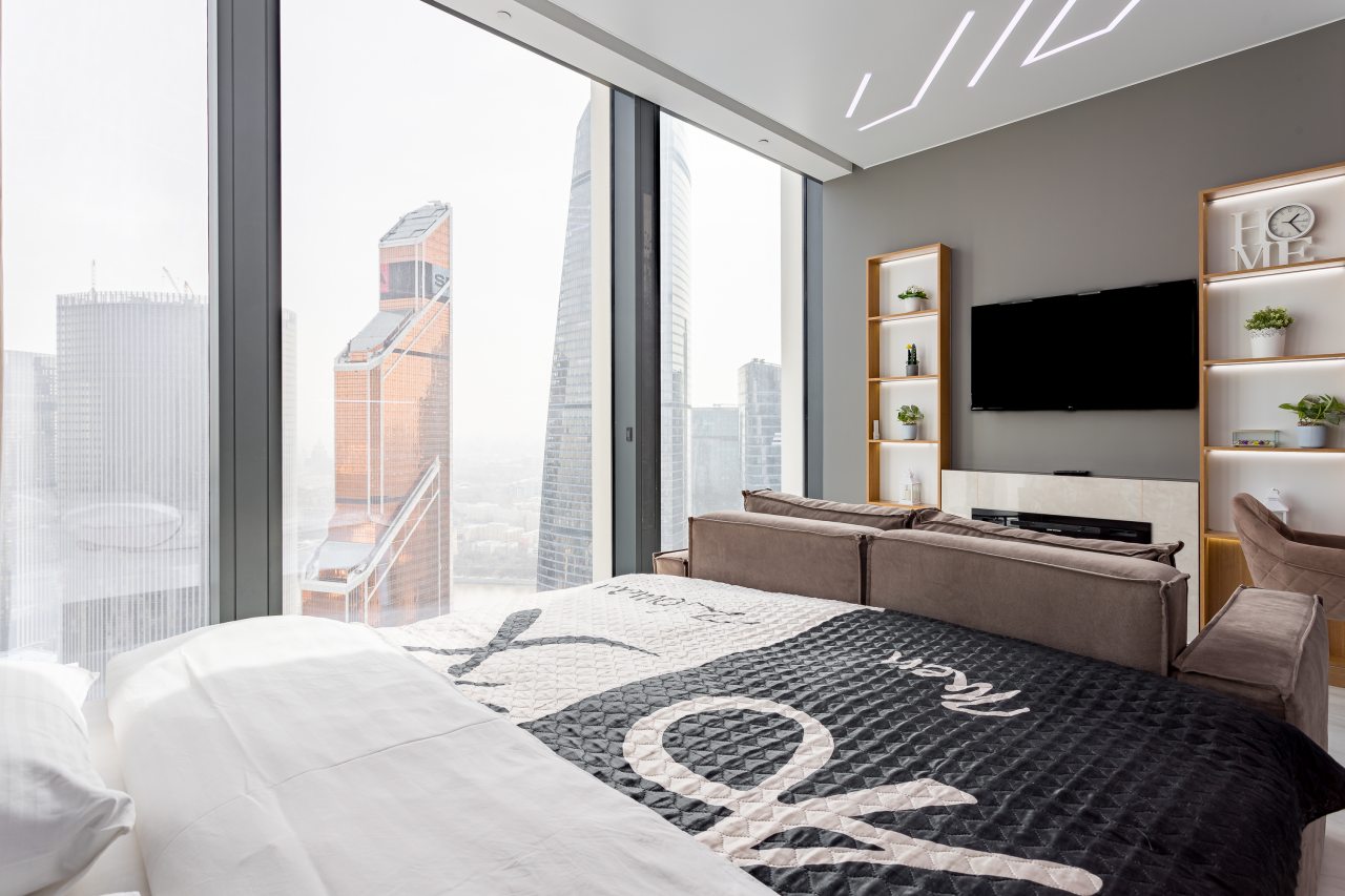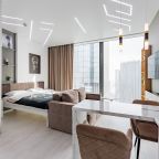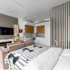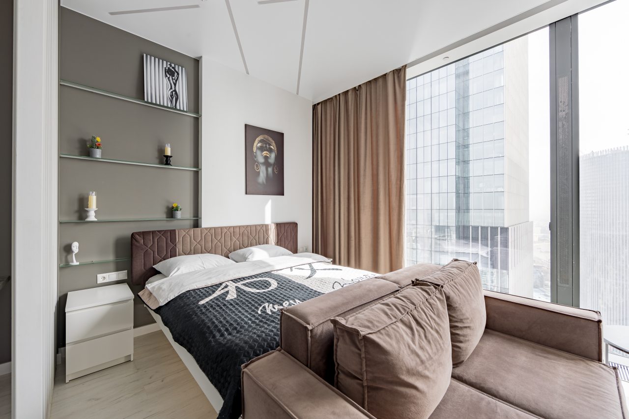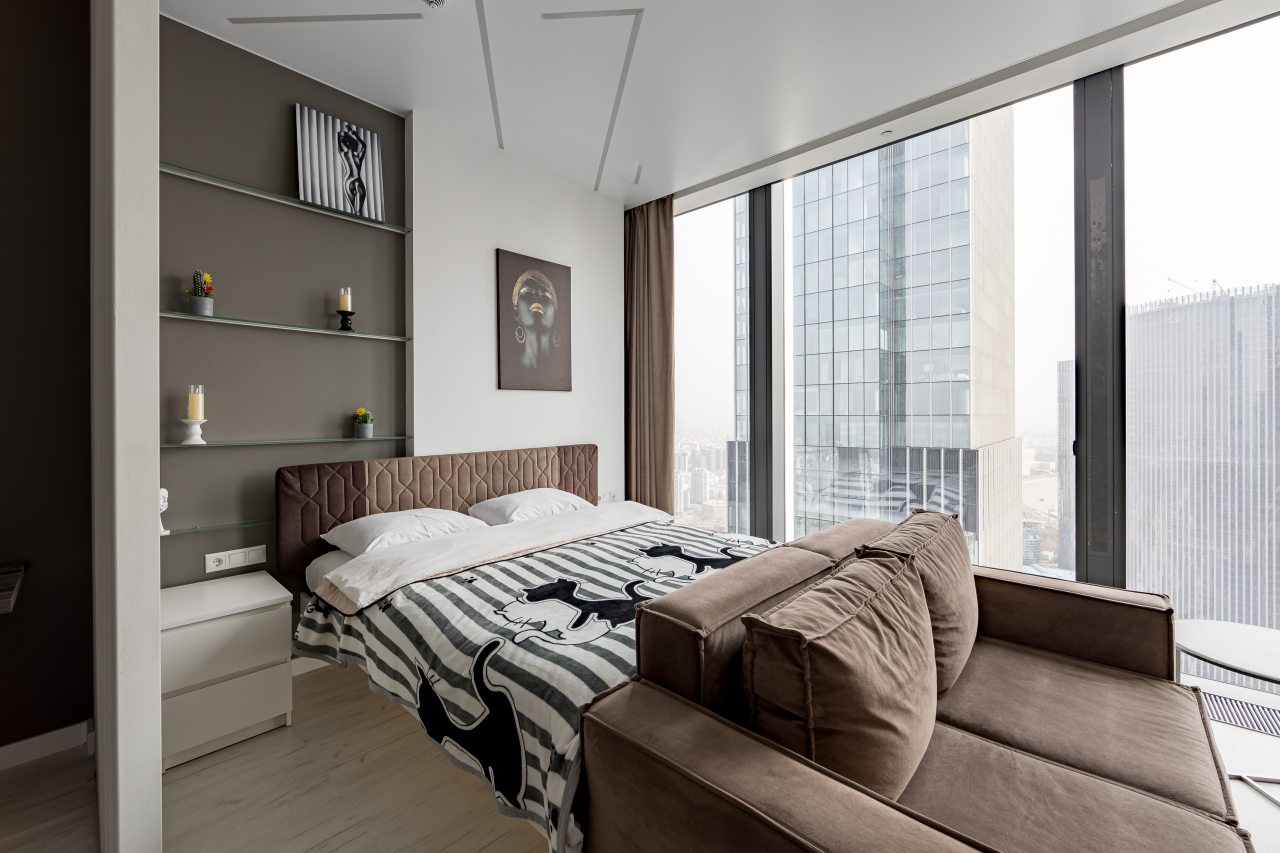 Для размещения подготовлены современные двухместные апартаменты с интерьером в приятных цветовых решениях. Они укомплектованы набором качественной мебели и техники для приятного времяпровождения и отдыха: удобная двуспальная кровать, мягкий диван, телевизор, вместительный шкаф для хранения личных вещей. В ванной комнате имеются индивидуальные средства гигиены. Из панорамных окон открывается потрясающий вид на город.