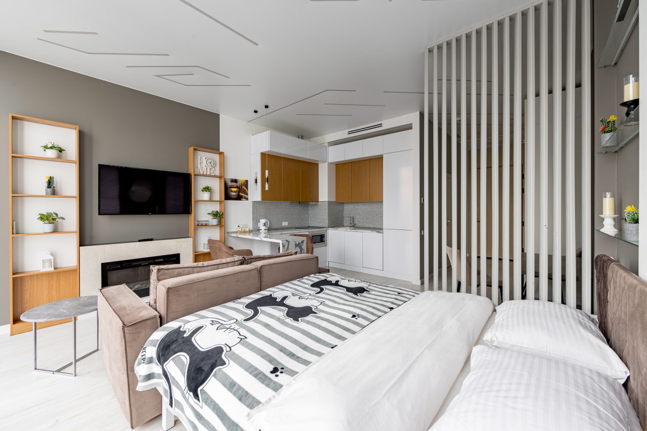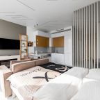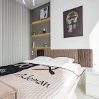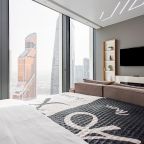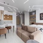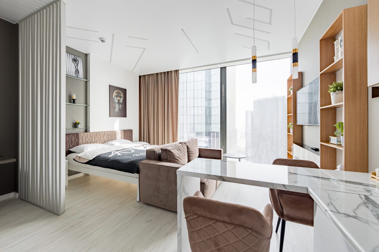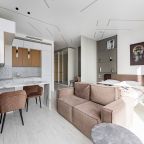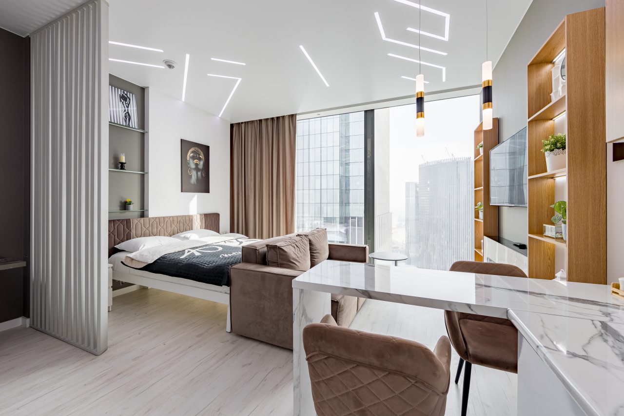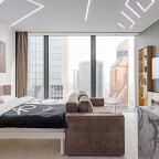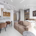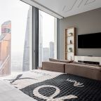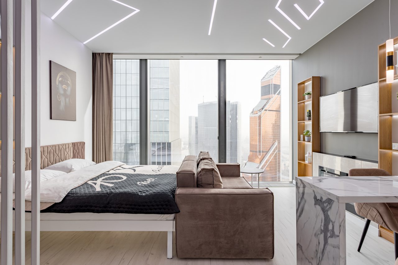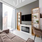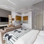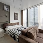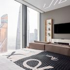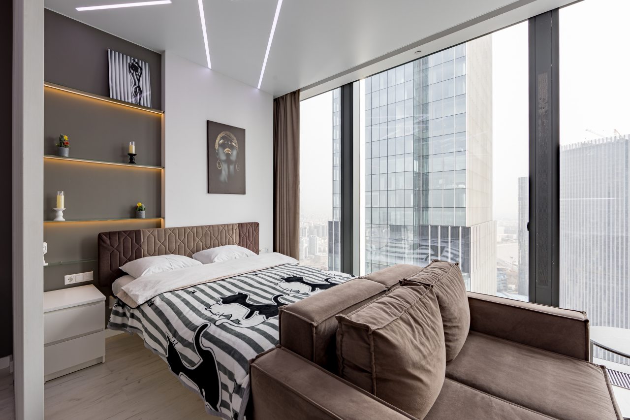 Для размещения подготовлены современные двухместные апартаменты с интерьером в приятных цветовых решениях. Они укомплектованы набором качественной мебели и техники для приятного времяпровождения и отдыха: удобная двуспальная кровать, мягкий диван, телевизор, вместительный шкаф для хранения личных вещей. В ванной комнате имеются индивидуальные средства гигиены. Из панорамных окон открывается потрясающий вид на город.