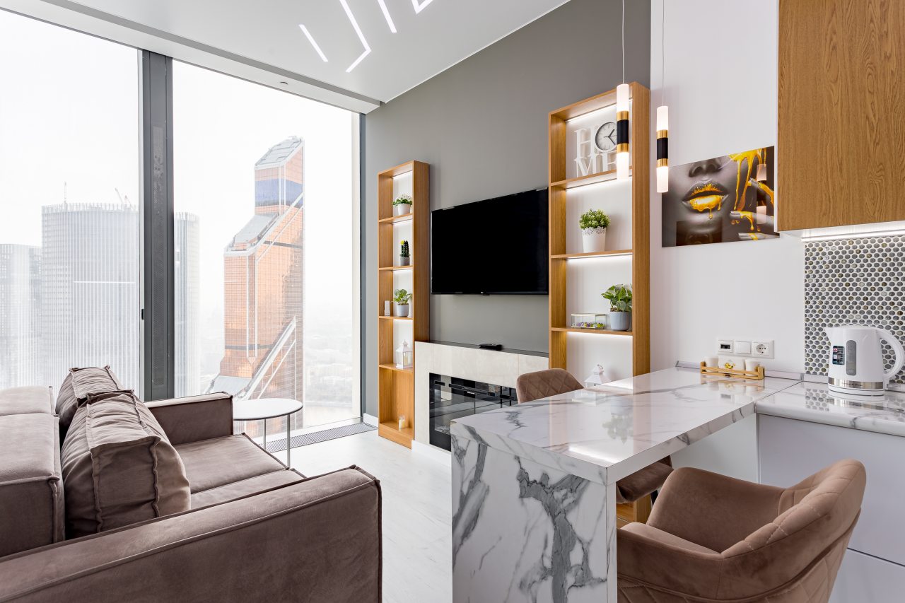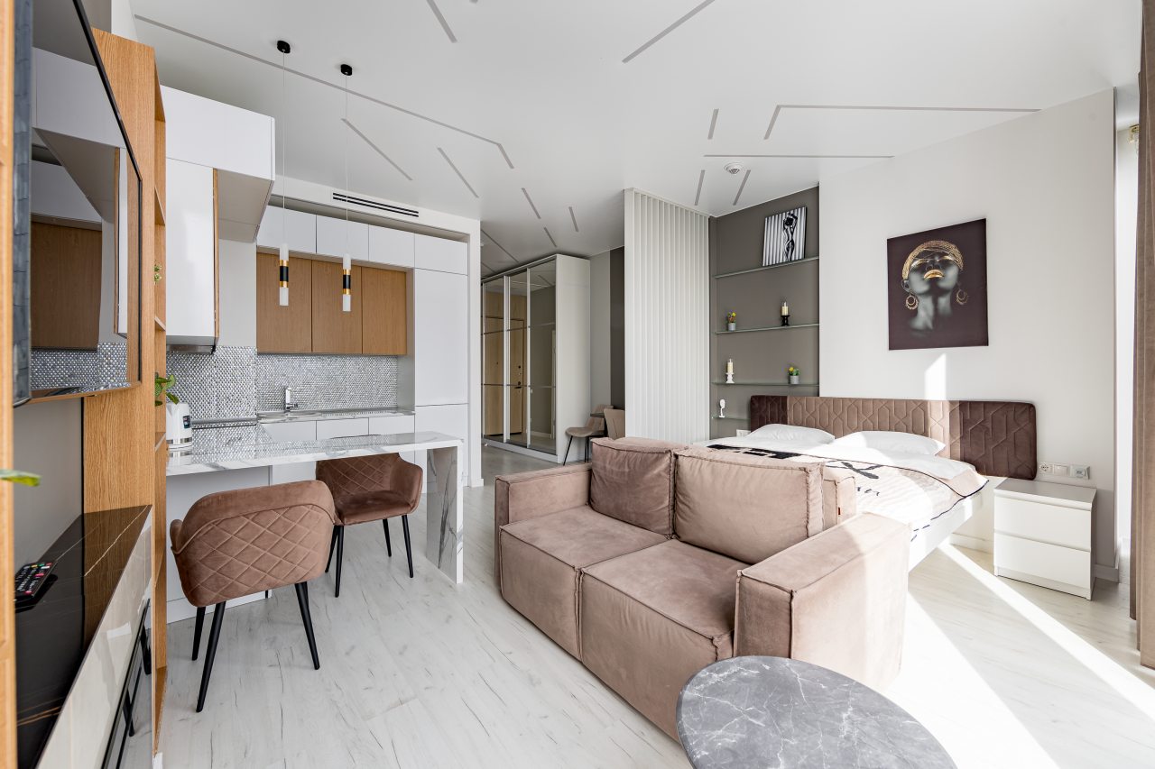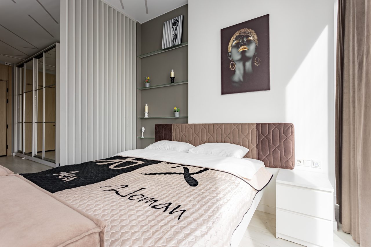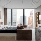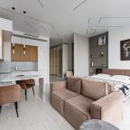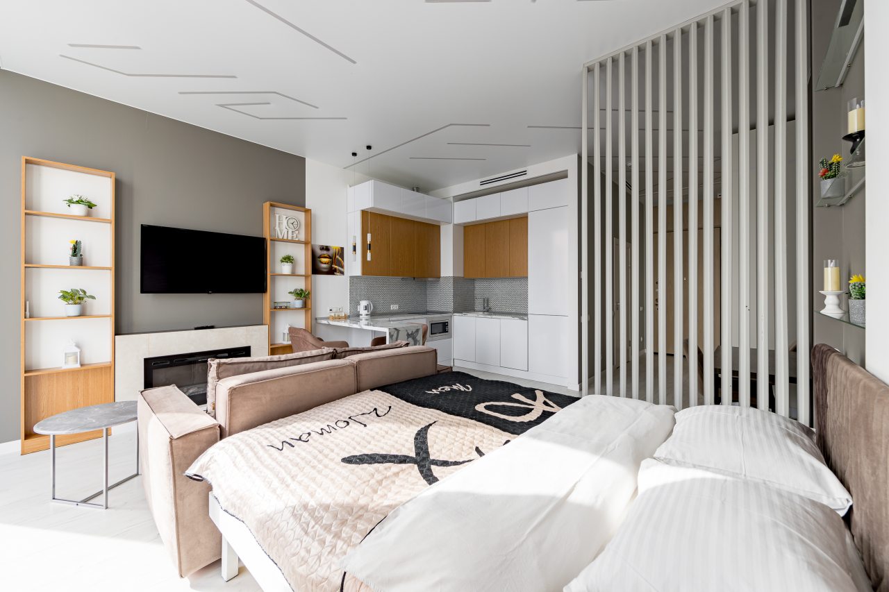 Для размещения подготовлены современные двухместные апартаменты с интерьером в приятных цветовых решениях. Они укомплектованы набором качественной мебели и техники для приятного времяпровождения и отдыха: удобная двуспальная кровать, мягкий диван, телевизор, вместительный шкаф для хранения личных вещей. В ванной комнате имеются индивидуальные средства гигиены. Из панорамных окон открывается потрясающий вид на город.
