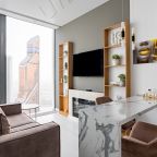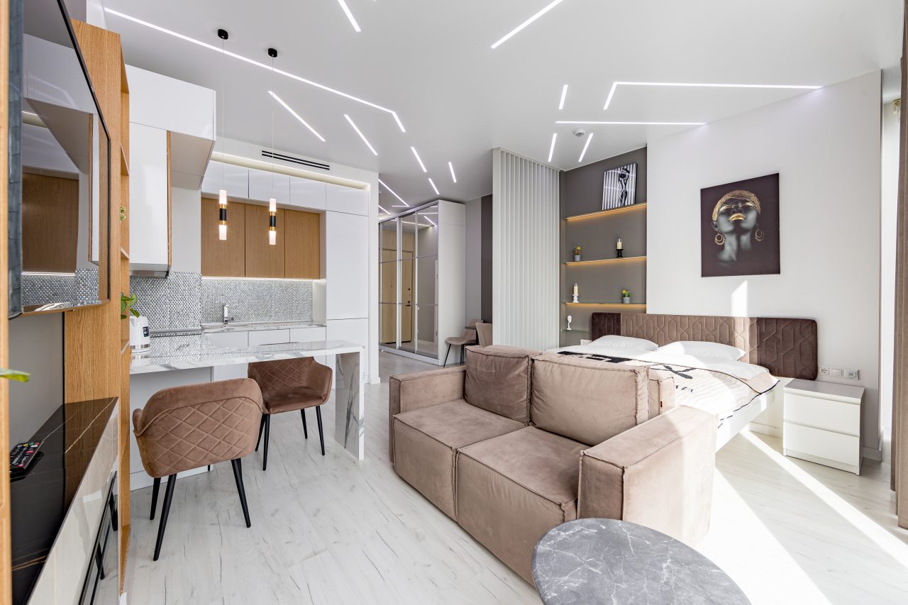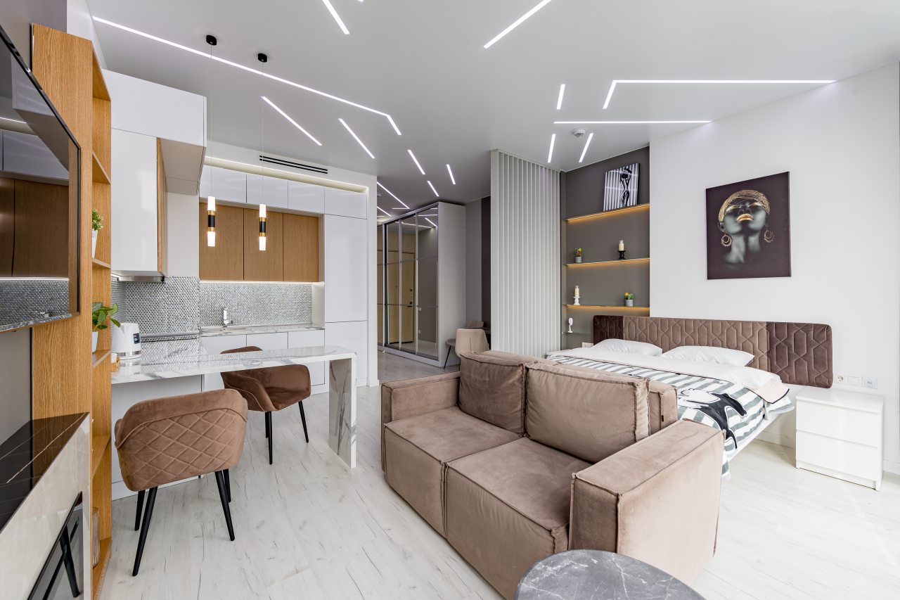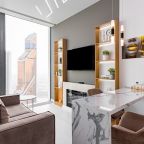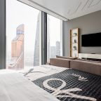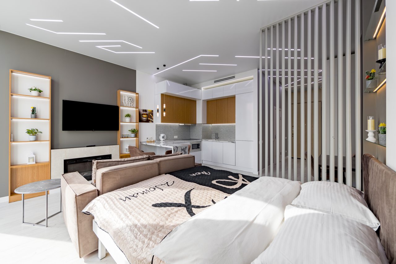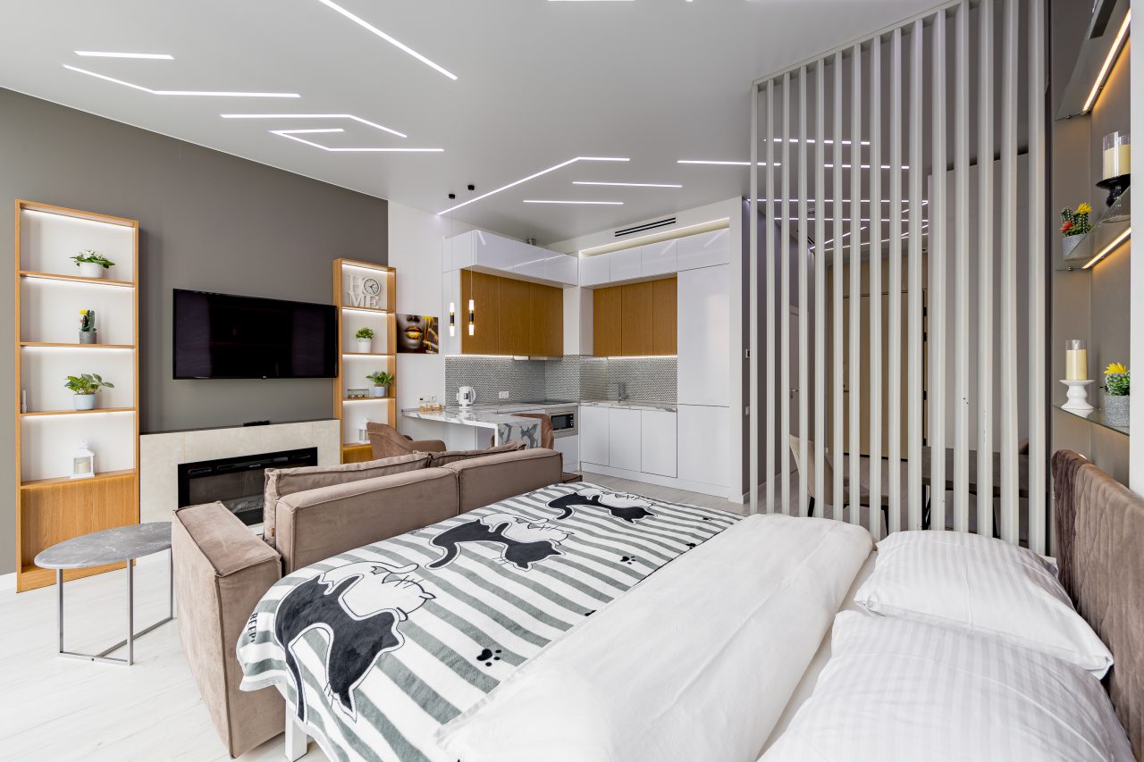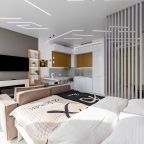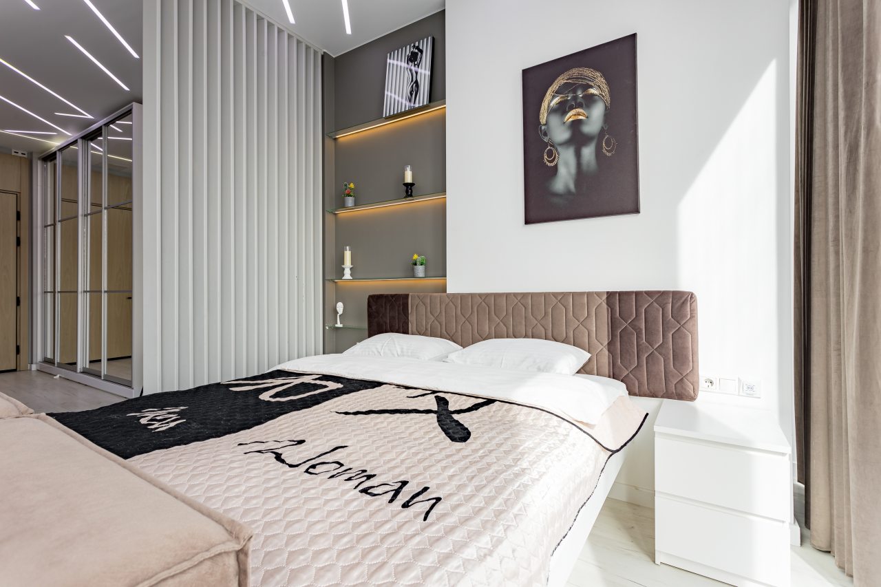 Для размещения подготовлены современные двухместные апартаменты с интерьером в приятных цветовых решениях. Они укомплектованы набором качественной мебели и техники для приятного времяпровождения и отдыха: удобная двуспальная кровать, мягкий диван, телевизор, вместительный шкаф для хранения личных вещей. В ванной комнате имеются индивидуальные средства гигиены. Из панорамных окон открывается потрясающий вид на город.