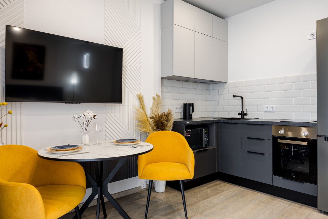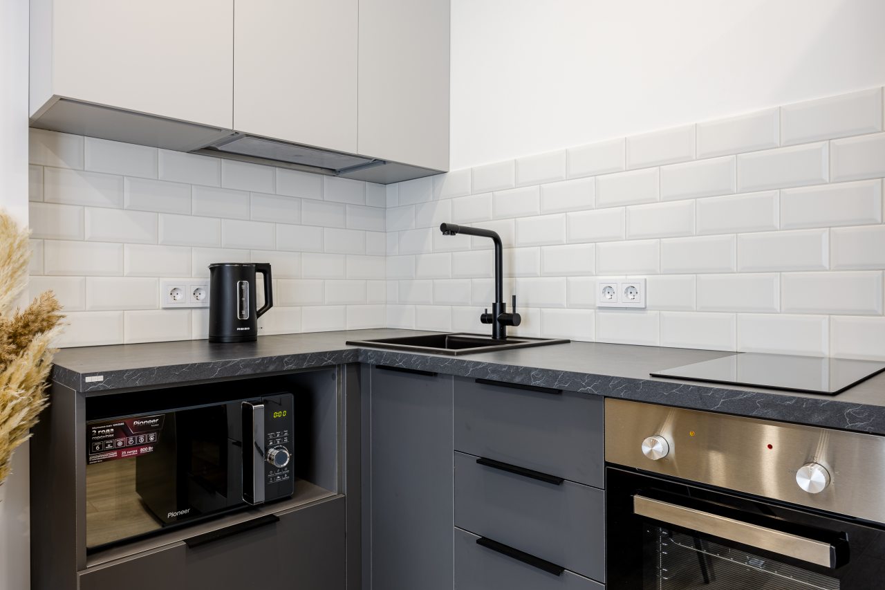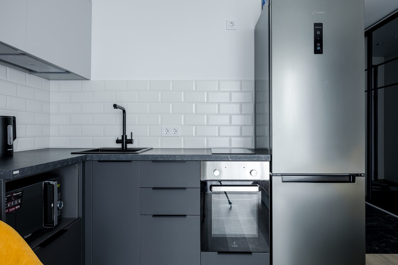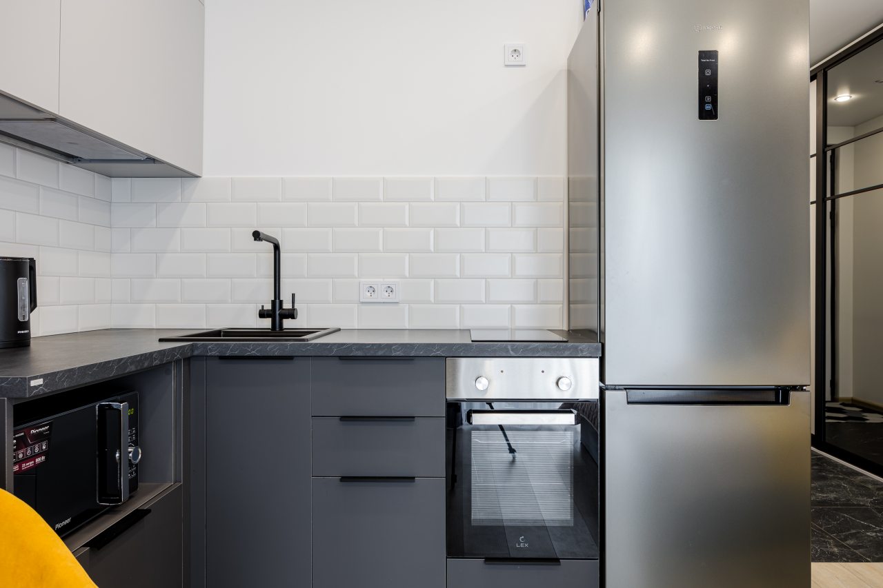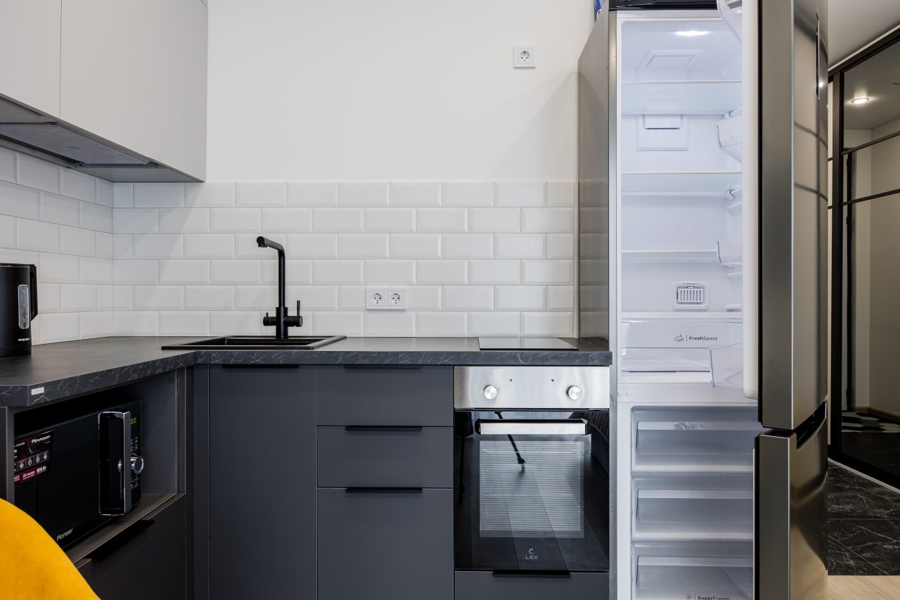 Кухня оснащены бытовыми приборами: двухкамерный холодильник, варочная панель, духовой шкаф, микроволновая печь, чайник. Рядом работает ресторан и пекарня.