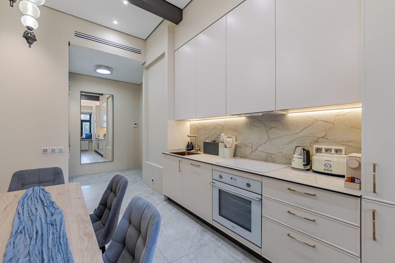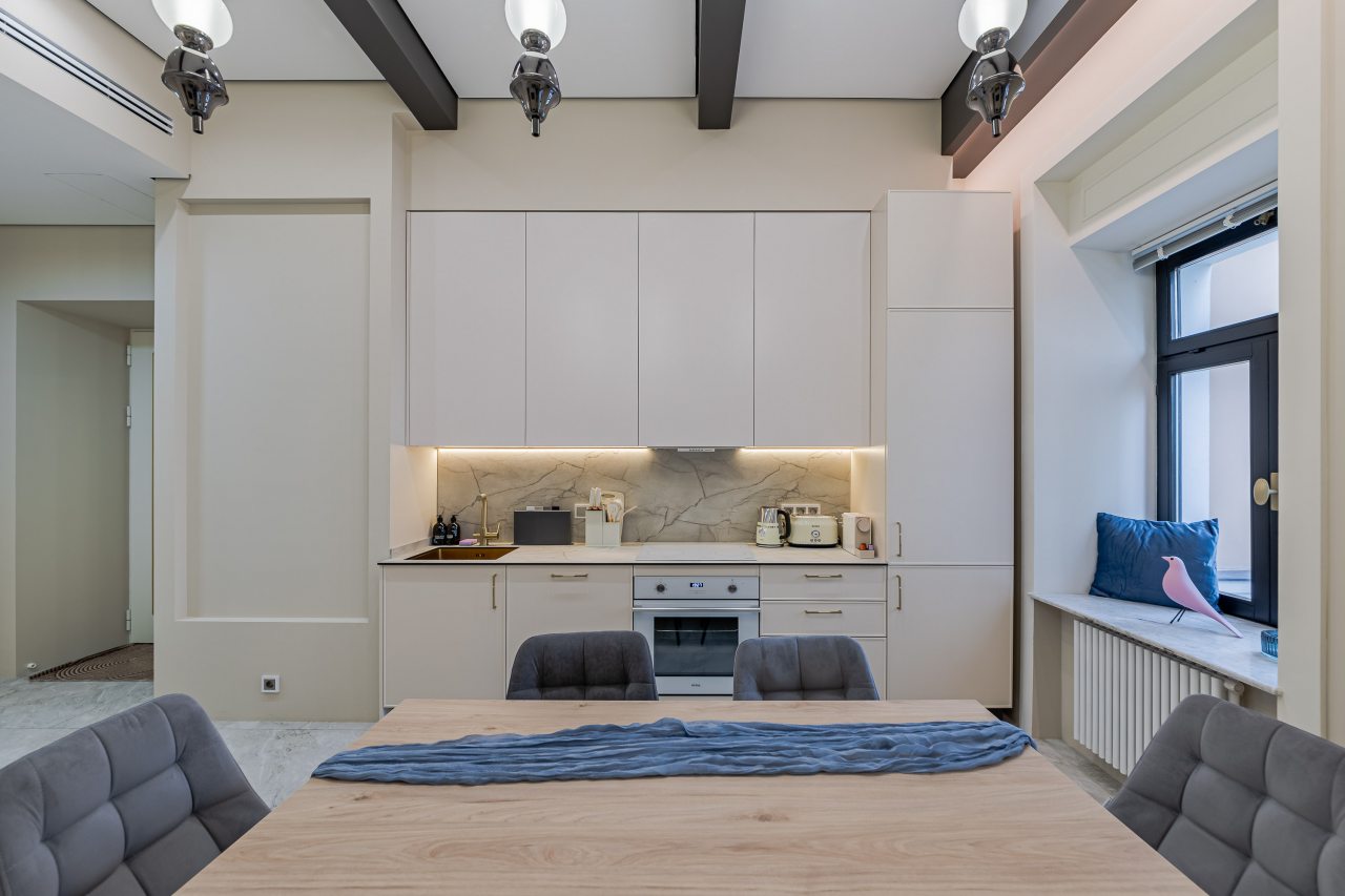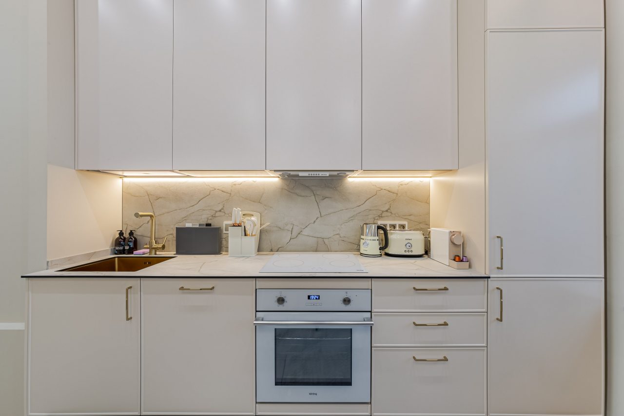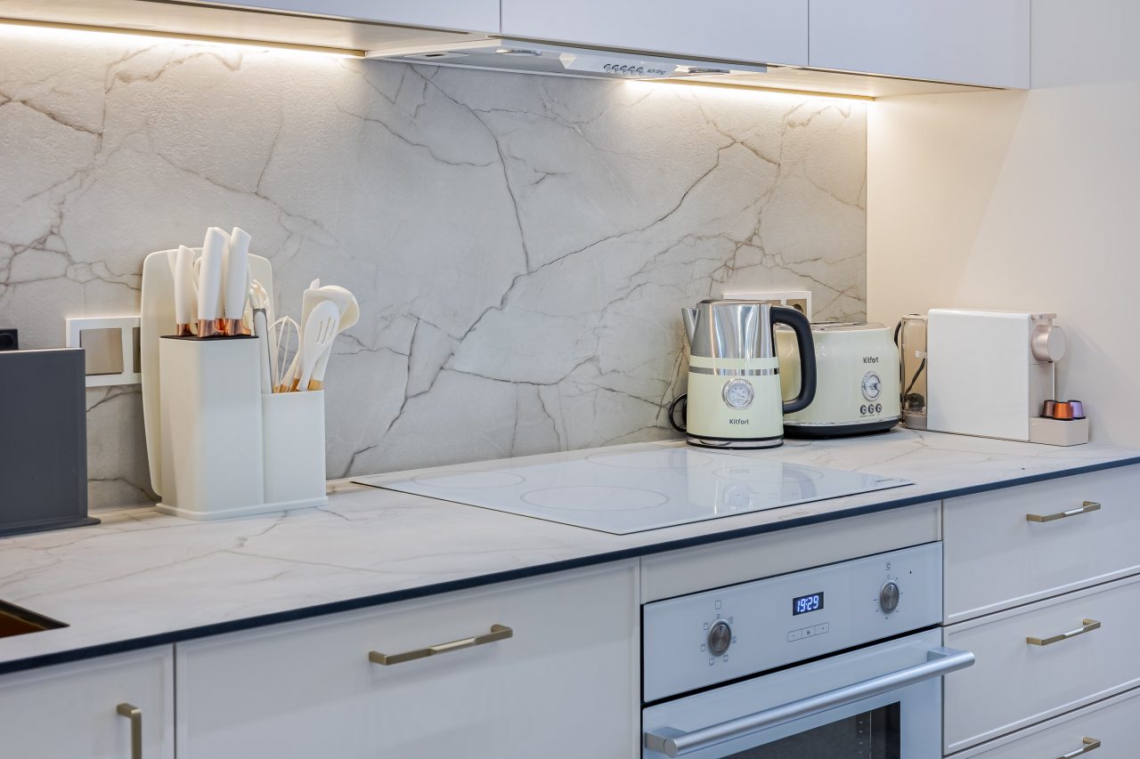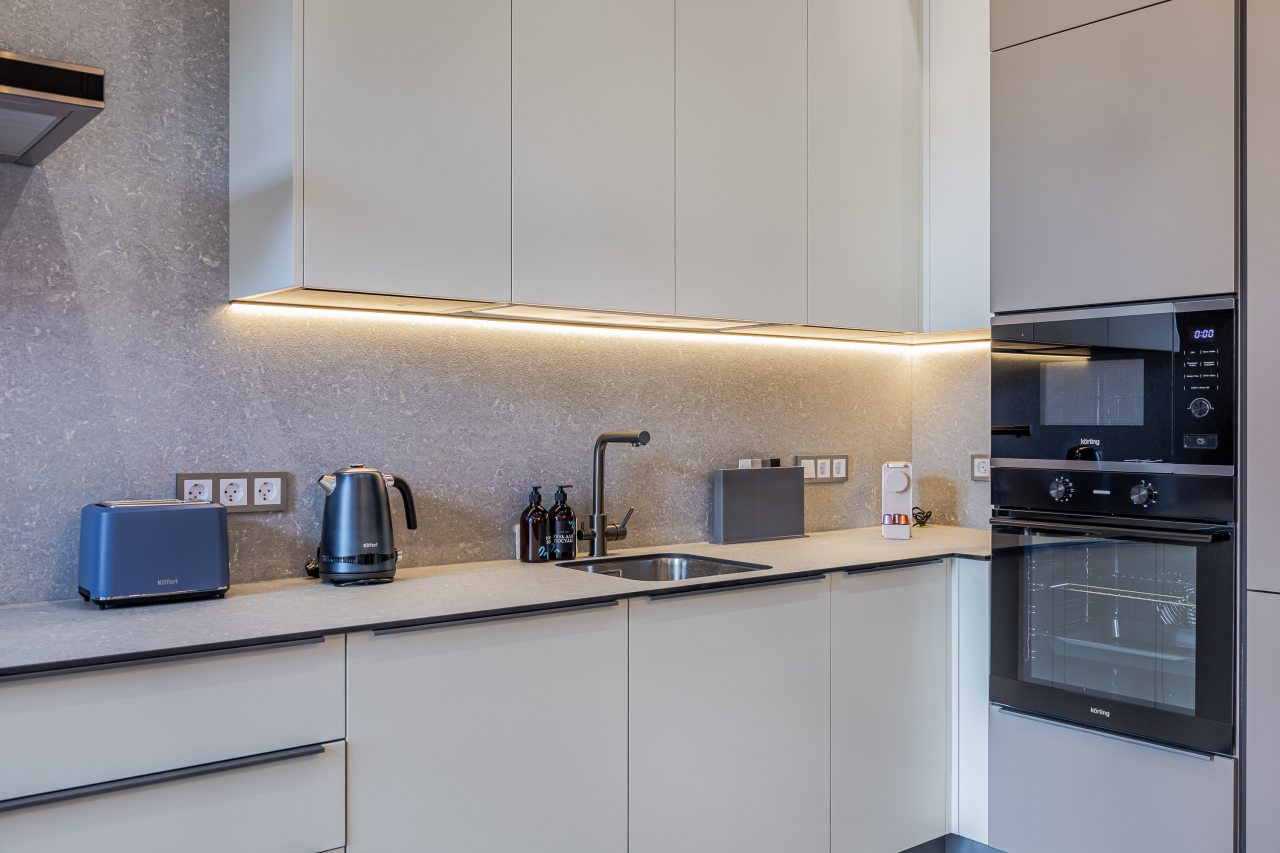 Кухонная зона порадует вас наличием необходимой бытовой техники для приготовления любимых блюд и напитков, включая варочную панель, чайник и духовой шкаф.