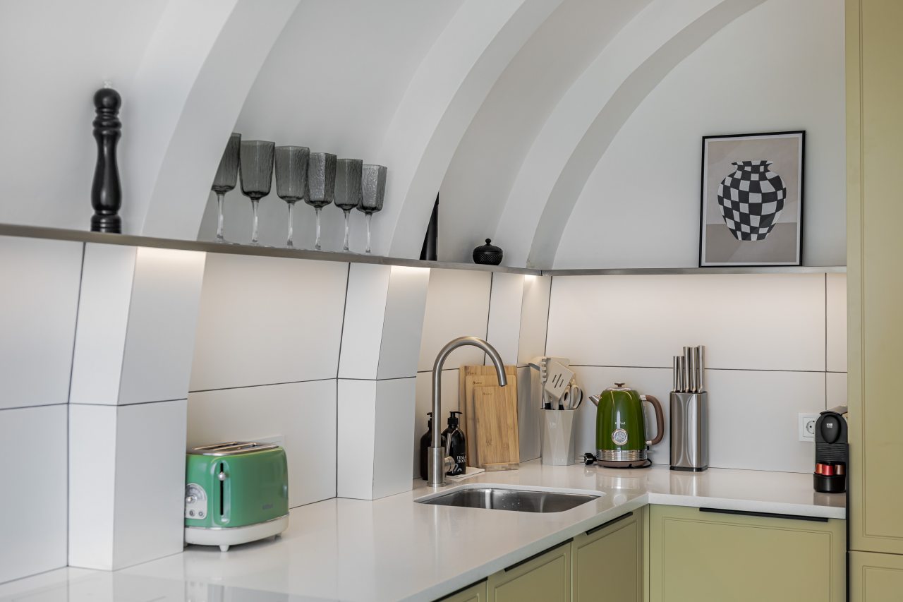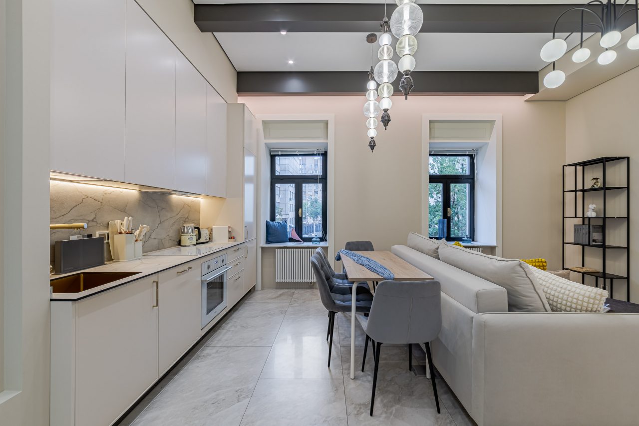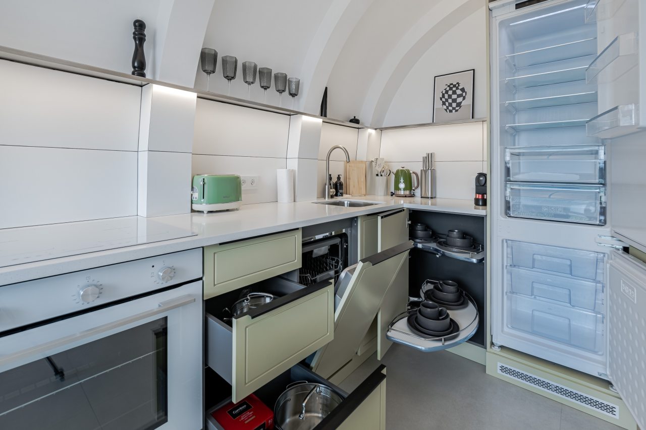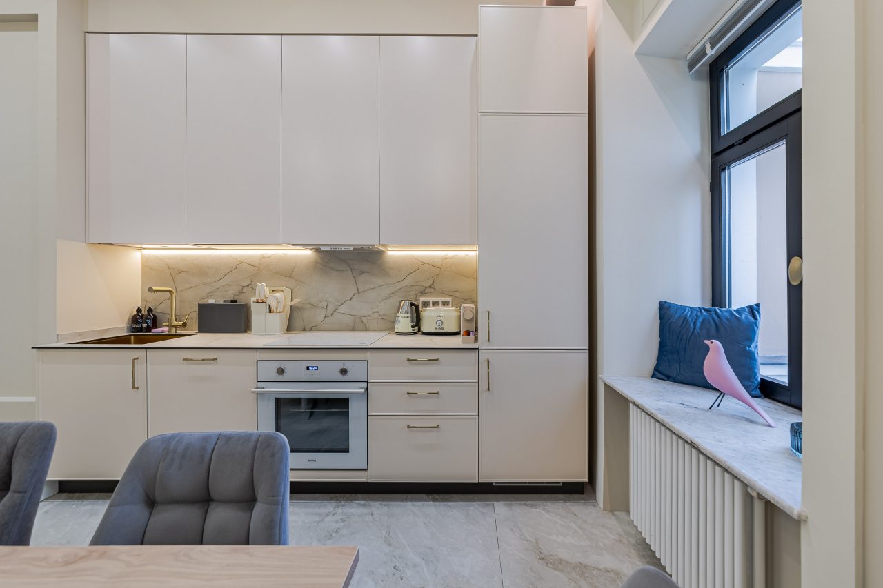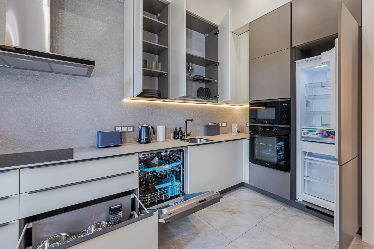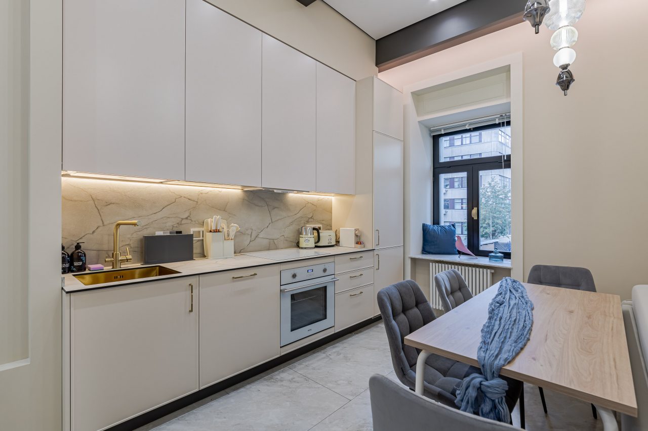 Кухонная зона порадует вас наличием необходимой бытовой техники для приготовления любимых блюд и напитков, включая варочную панель, чайник и духовой шкаф.