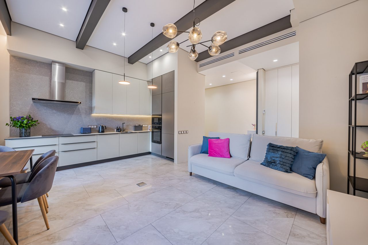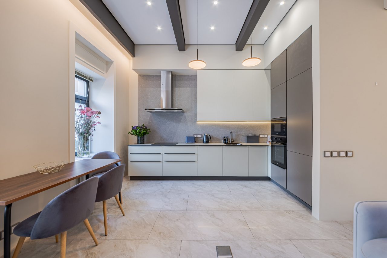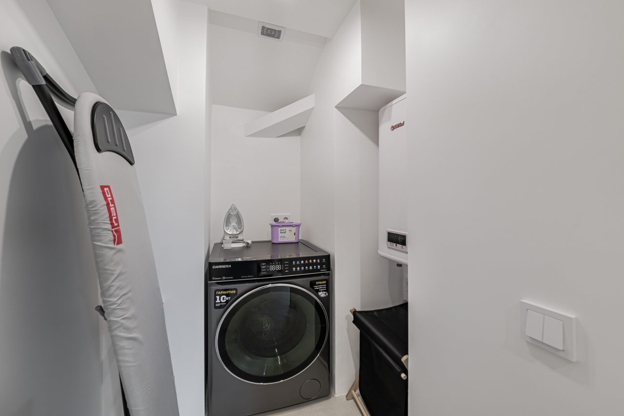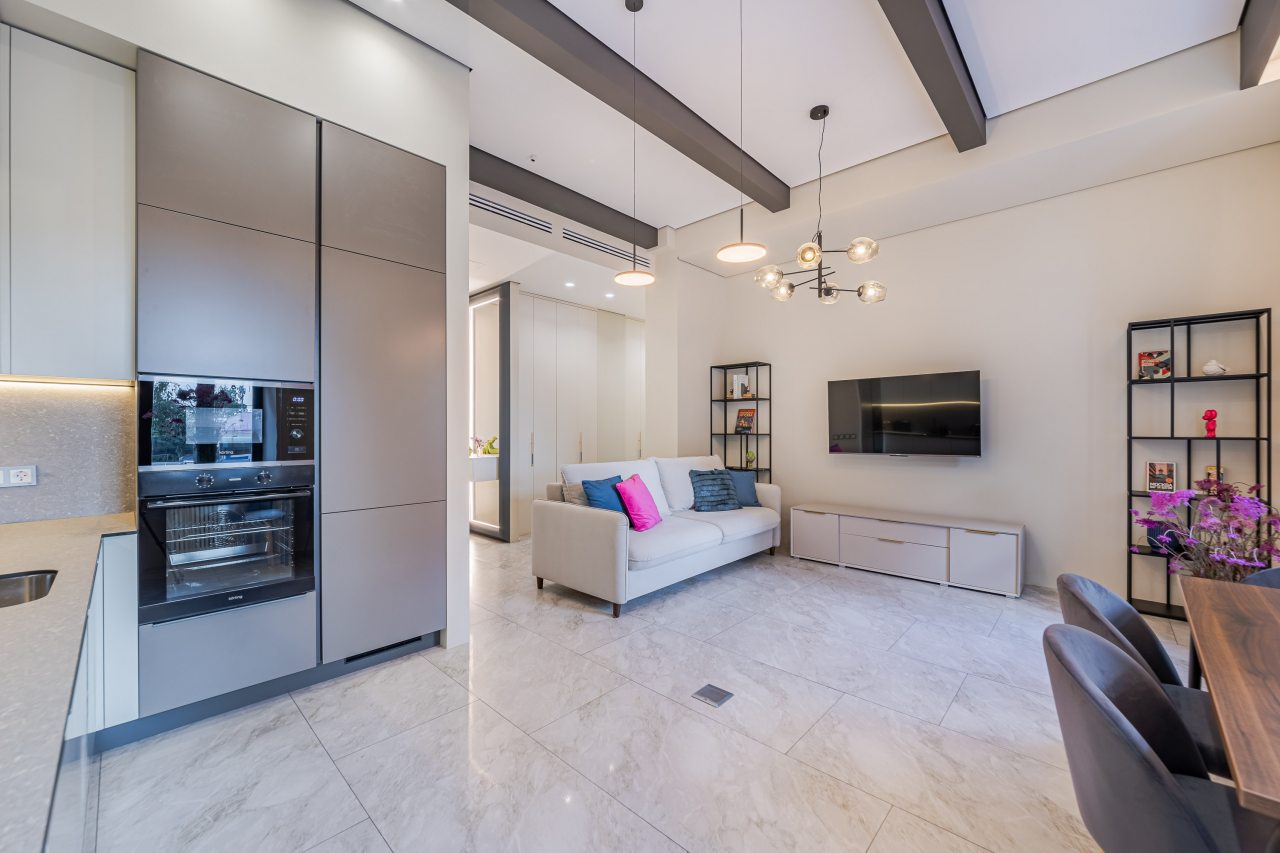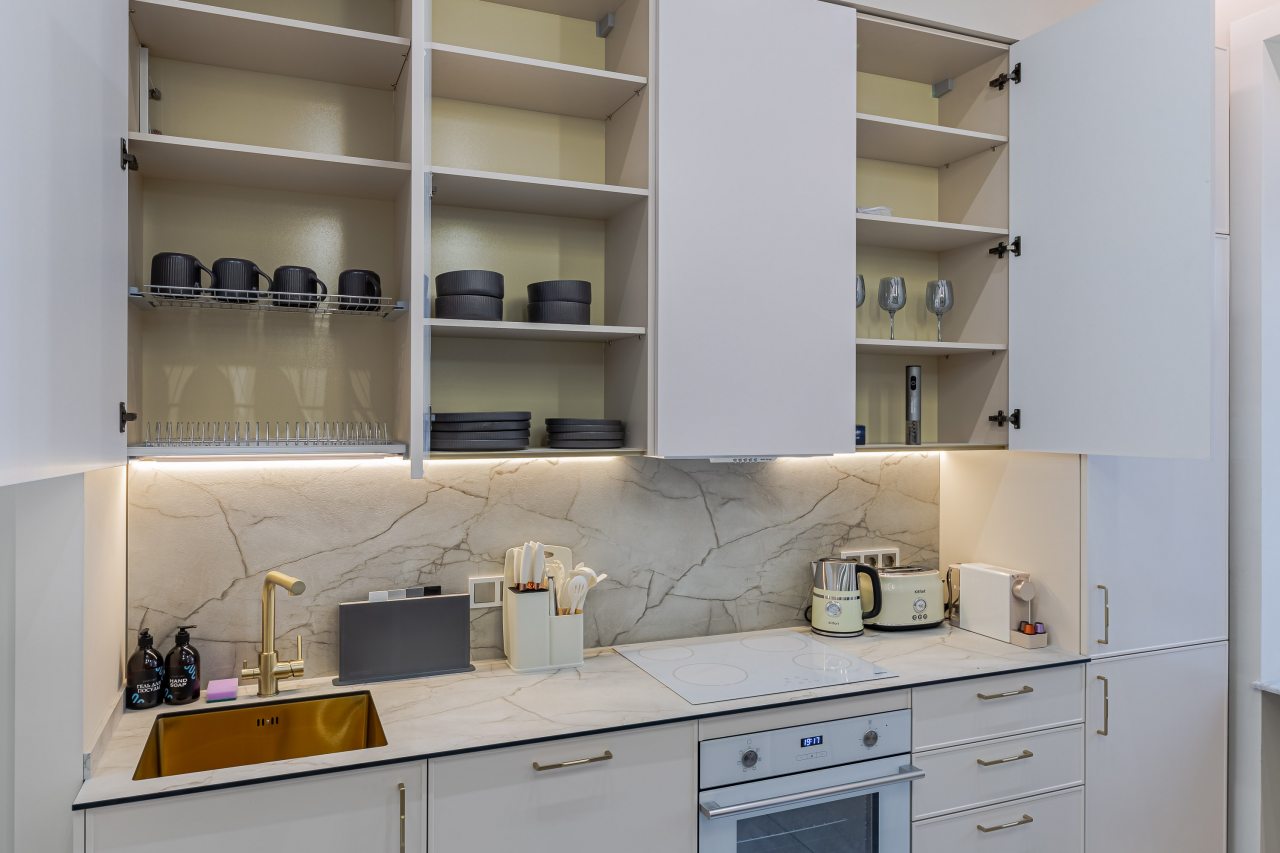 Кухонная зона порадует вас наличием необходимой бытовой техники для приготовления любимых блюд и напитков, включая варочную панель, чайник и духовой шкаф.
