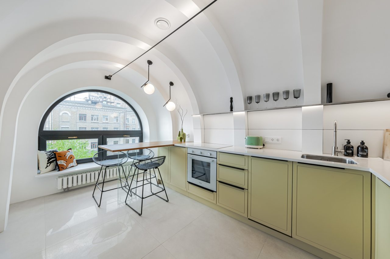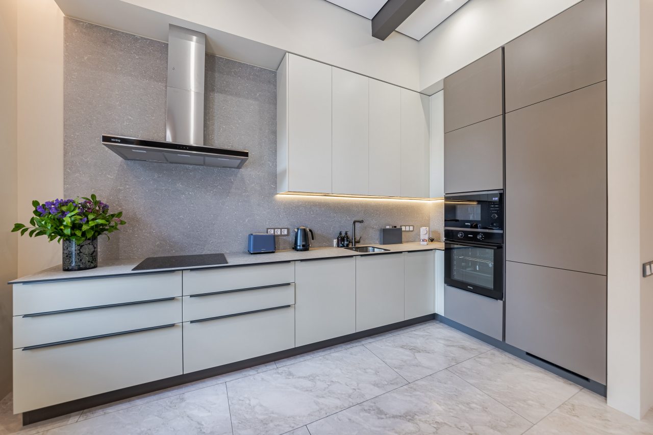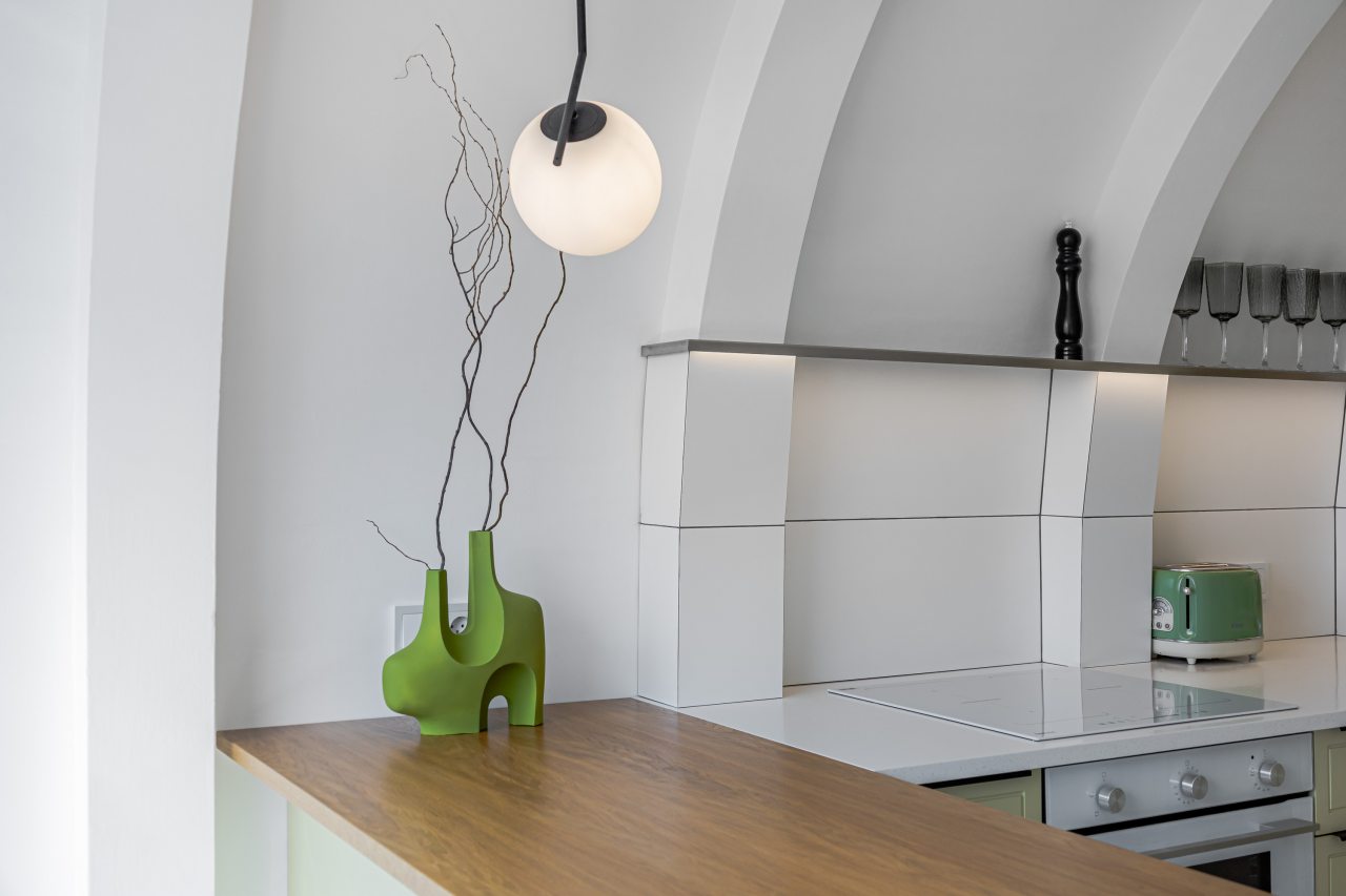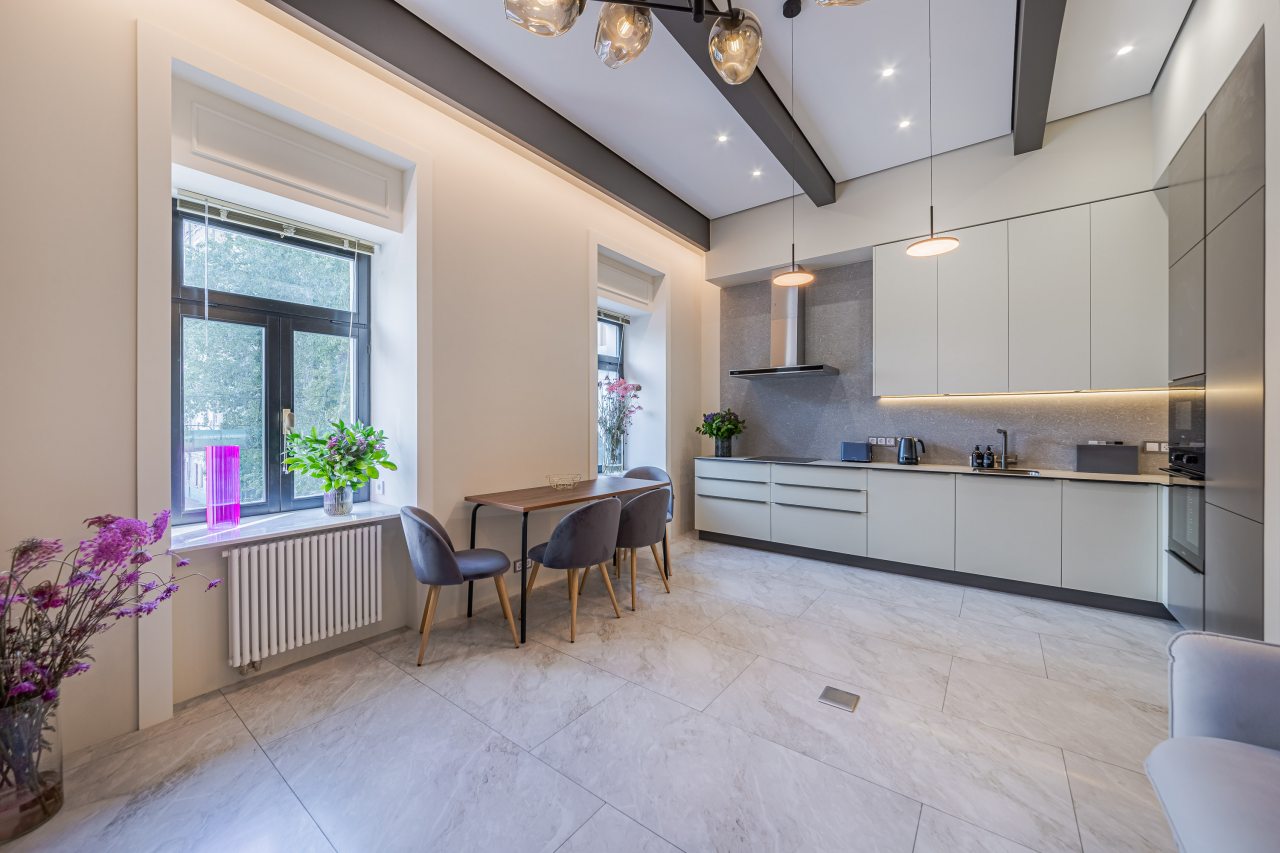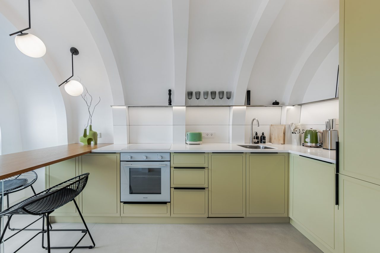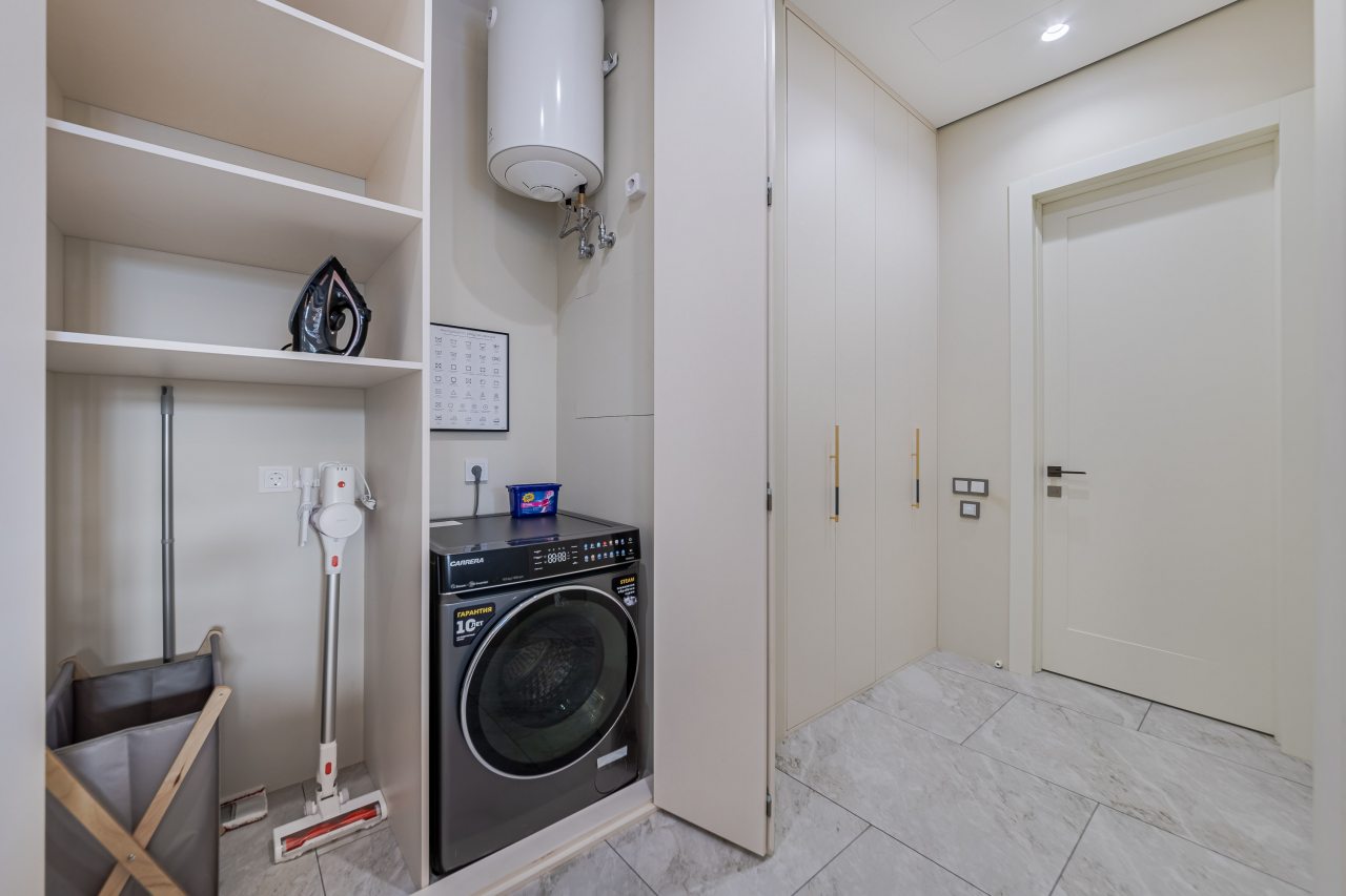 Кухонная зона порадует вас наличием необходимой бытовой техники для приготовления любимых блюд и напитков, включая варочную панель, чайник и духовой шкаф.