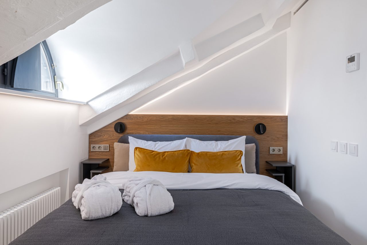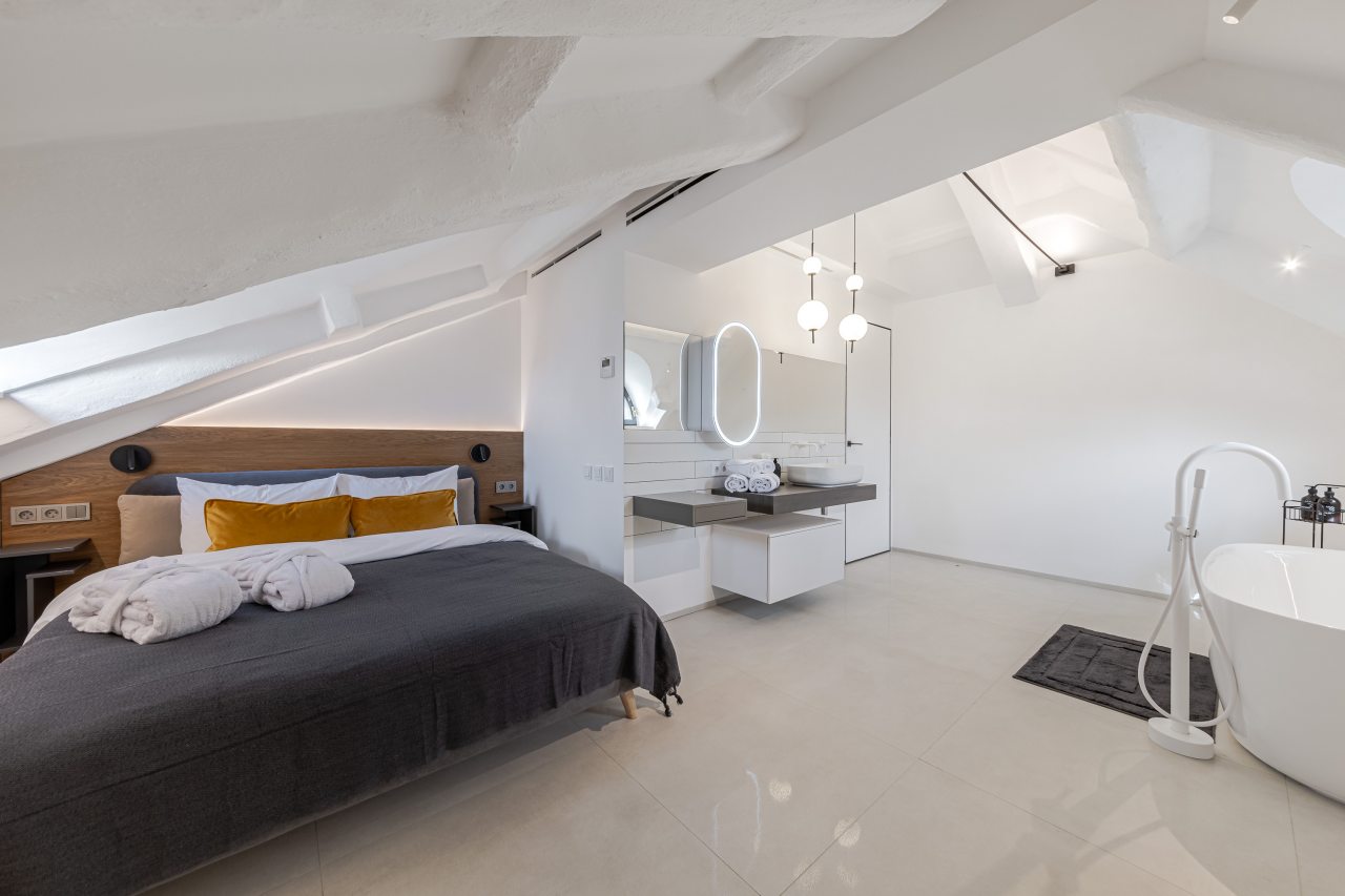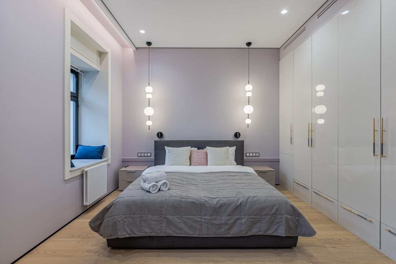 Для выбора доступно несколько вариантов, в каждом из которых имеется удобная кровать, вместительный шкаф, комфортная зона для отдыха, полноценная ванна.
