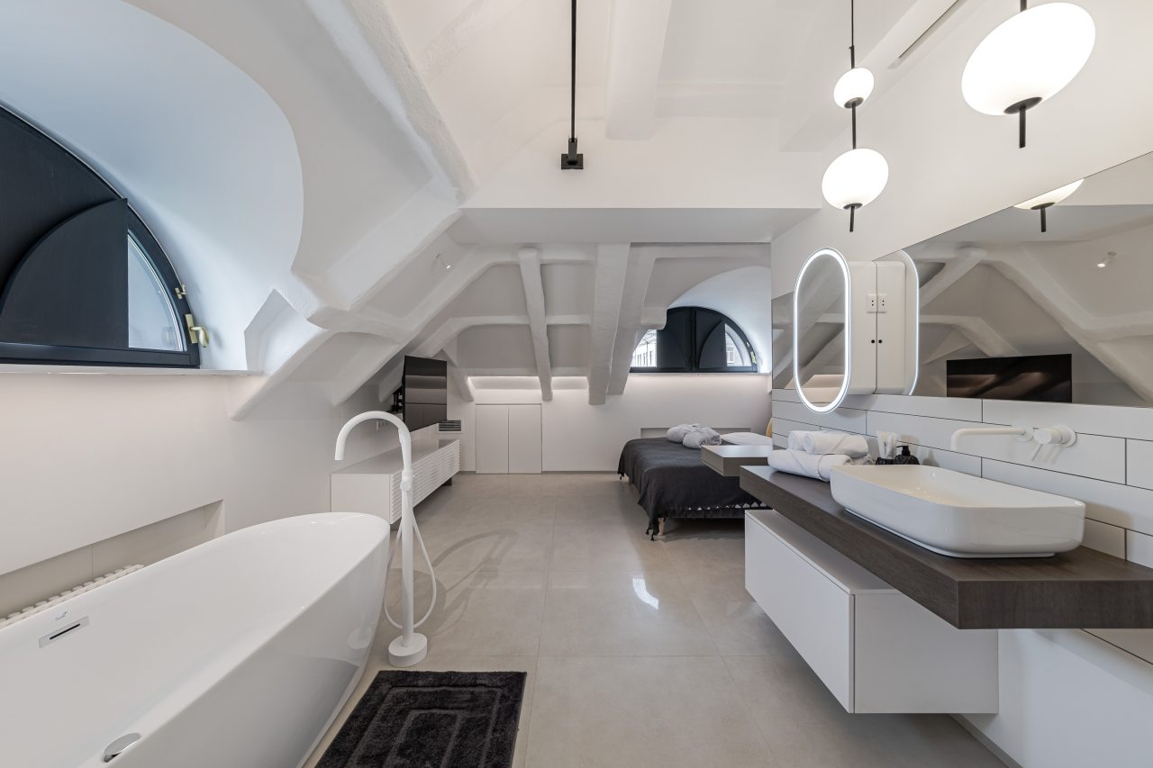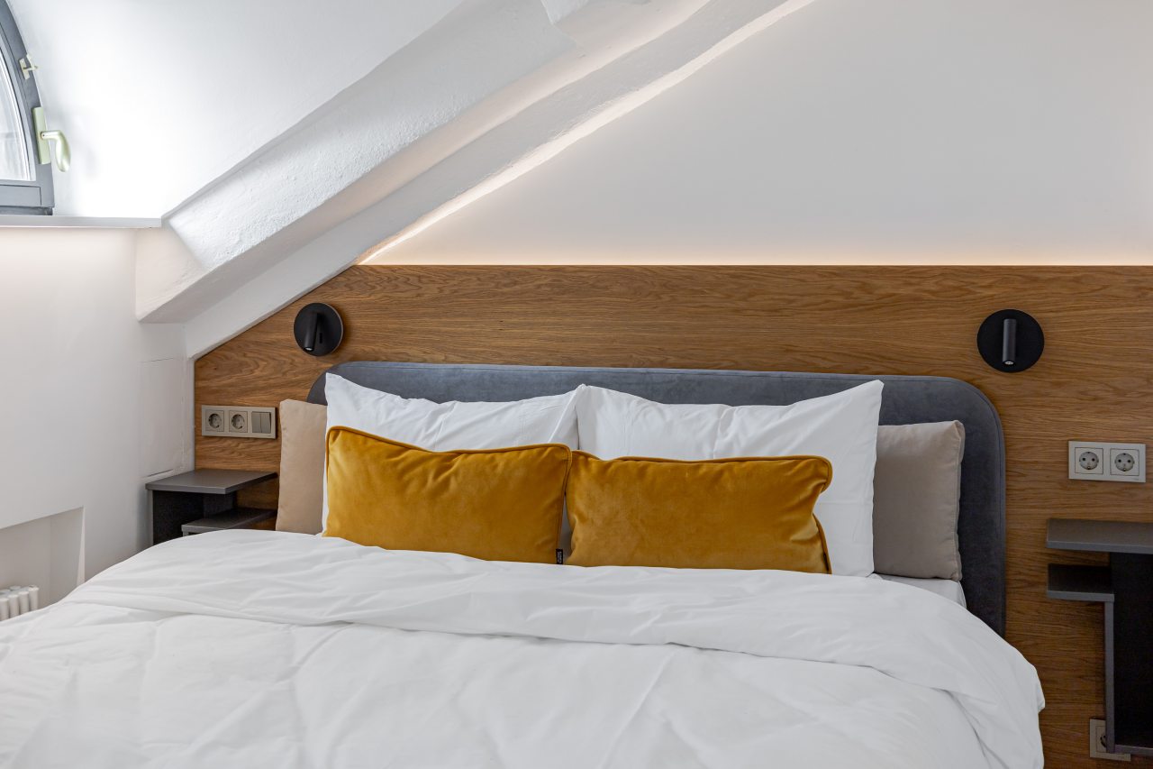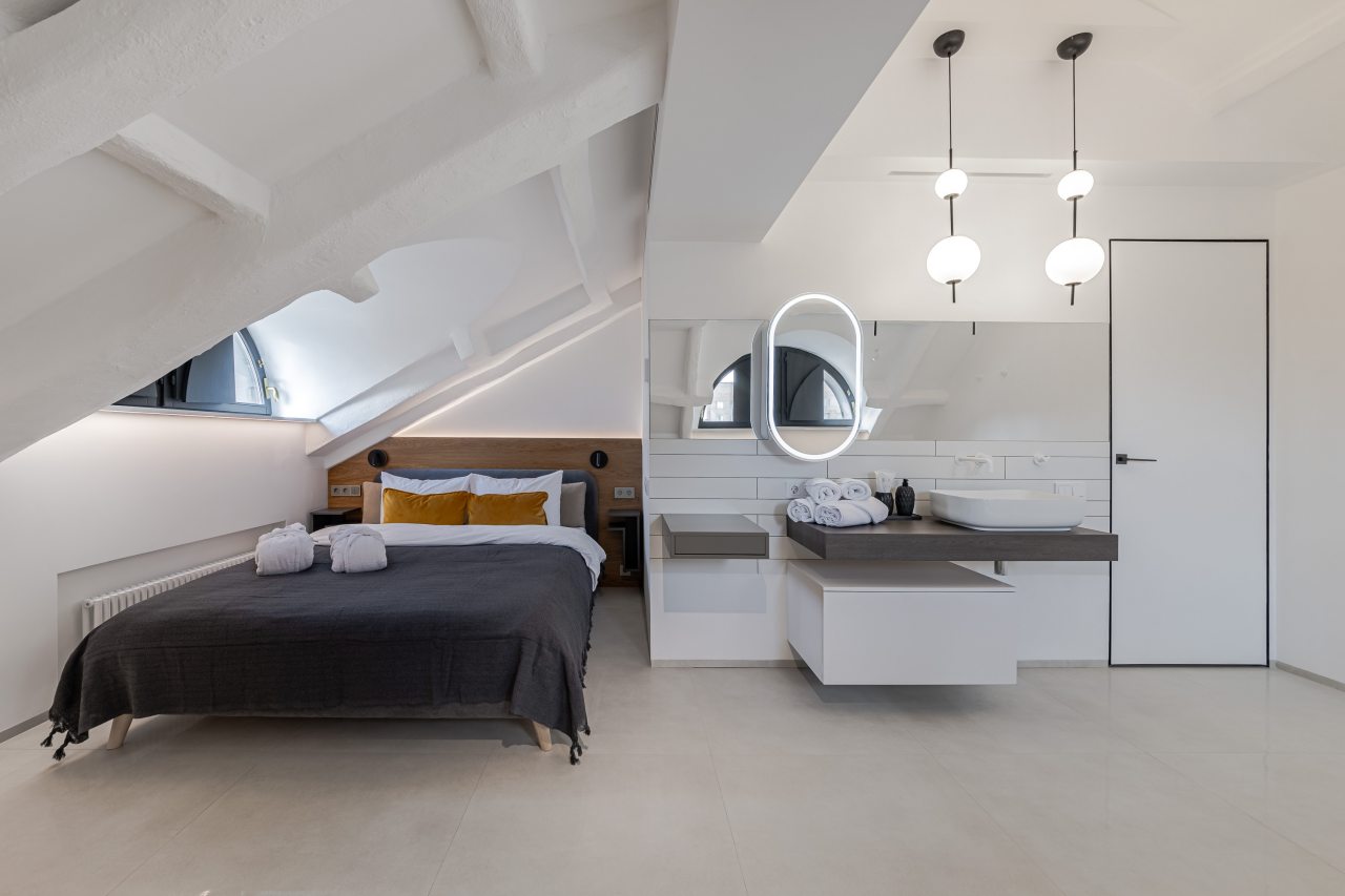 Для выбора доступно несколько вариантов, в каждом из которых имеется удобная кровать, вместительный шкаф, комфортная зона для отдыха, полноценная ванна.