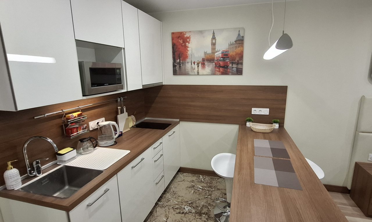 Кухонная зона укомплектована стильным гарнитуром, варочной панелью, вытяжкой, микроволновой печью, чайником, чайным набором. В доступности пекарня, ресторан, кафе, продуктовый магазин.