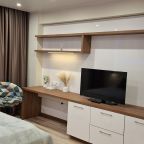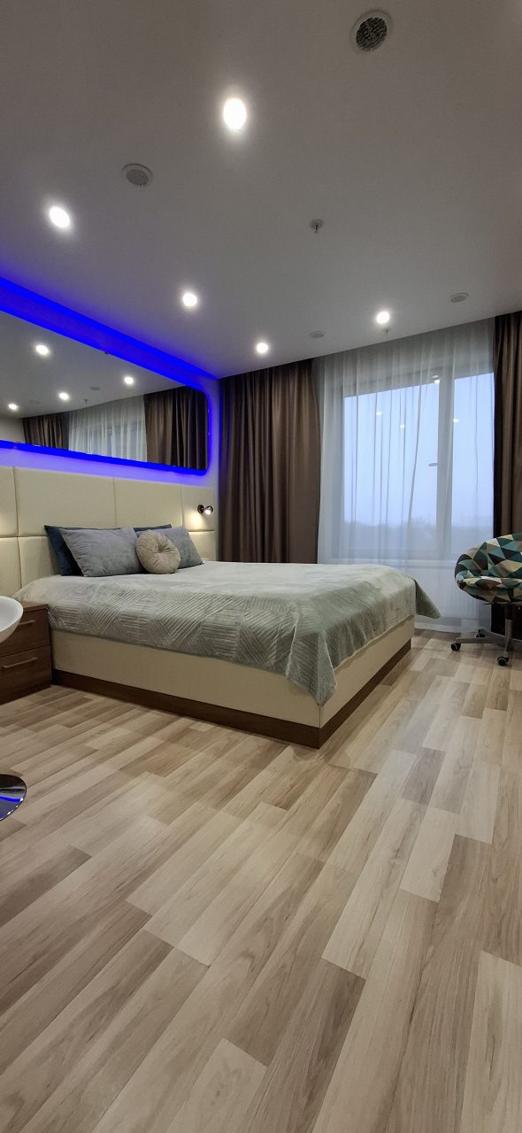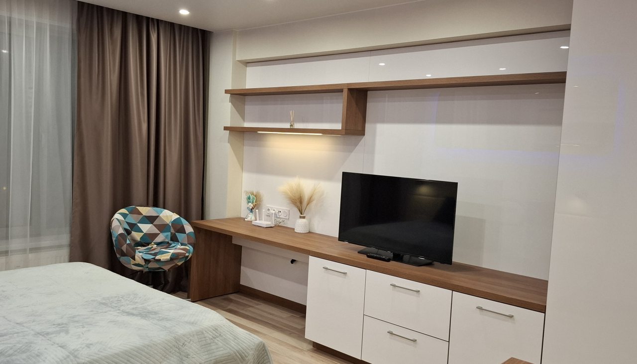Современная студия оборудована удобной двуспальной кроватью, прикроватной мебелью, письменным столом, большими окнами, шкафом, высокоскоростным интернетом и др. Санузел оснащен необходимой качественной сантехникой и феном.