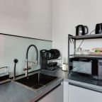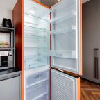 Зона кухни оснащена варочной панелью с вытяжкой, СВЧ, чайником, тостером, посудой, ярким холодильником, красивым обеденным столом и стульями.