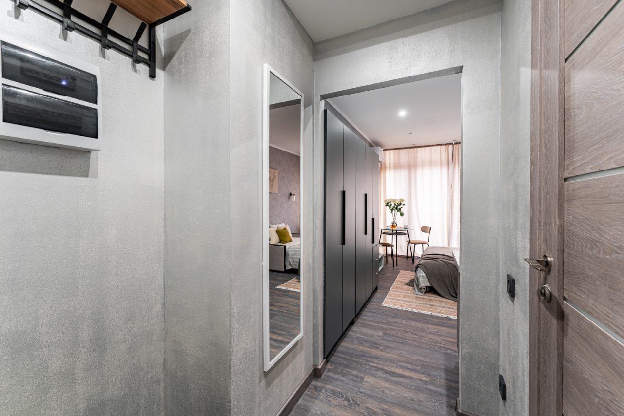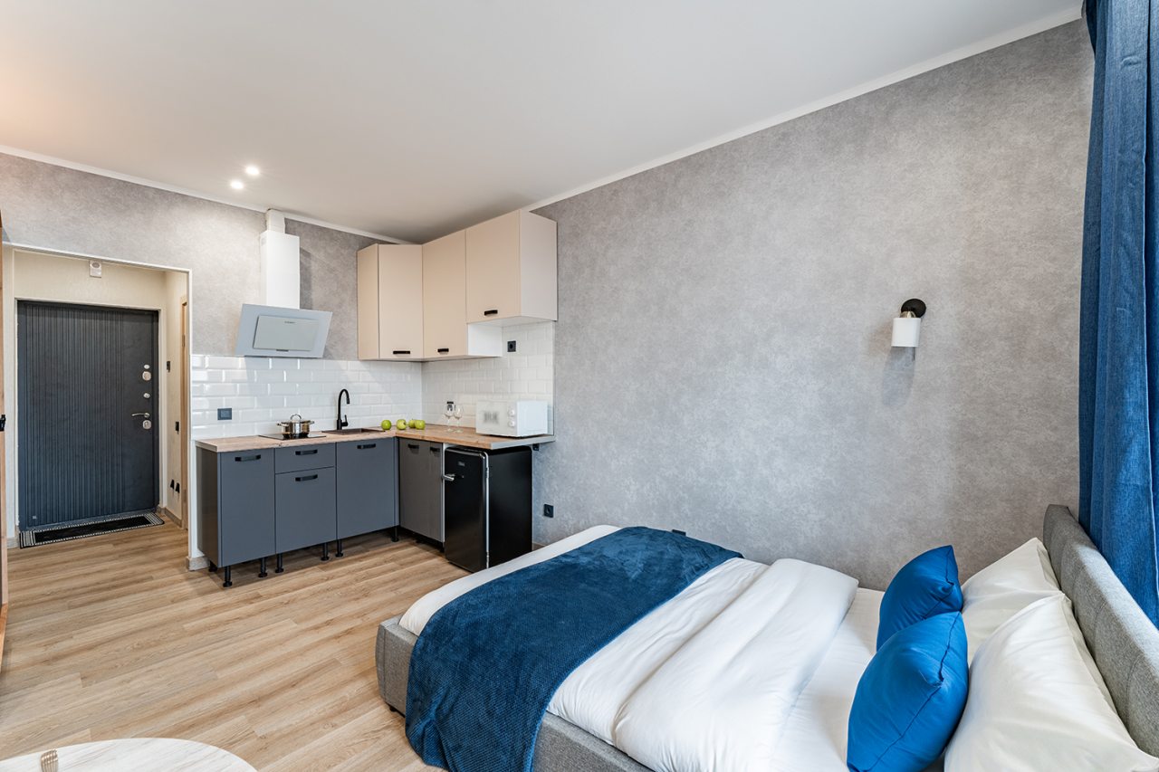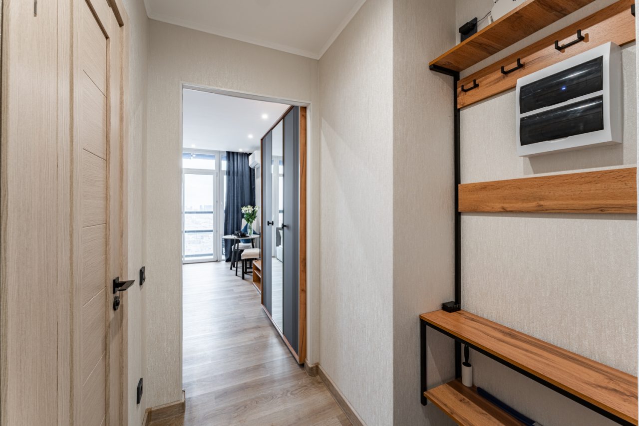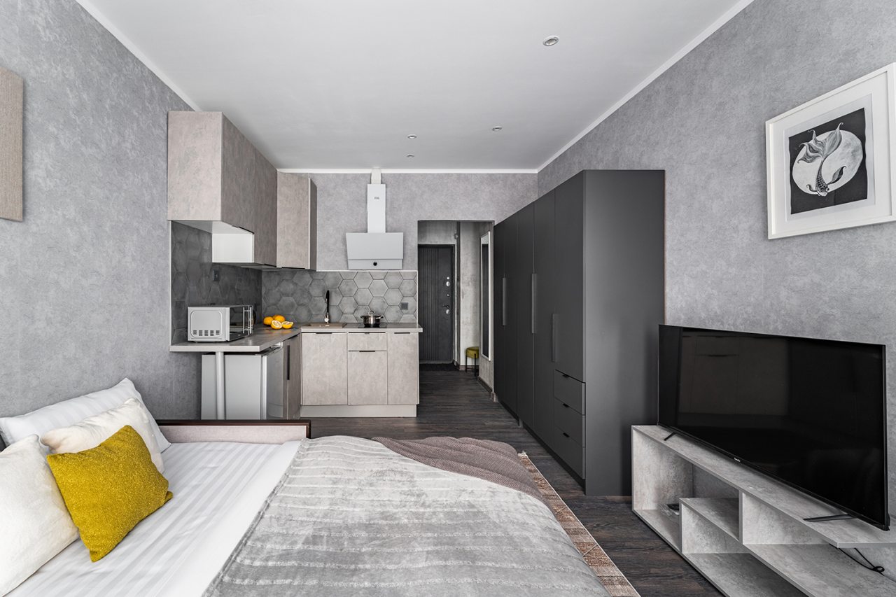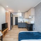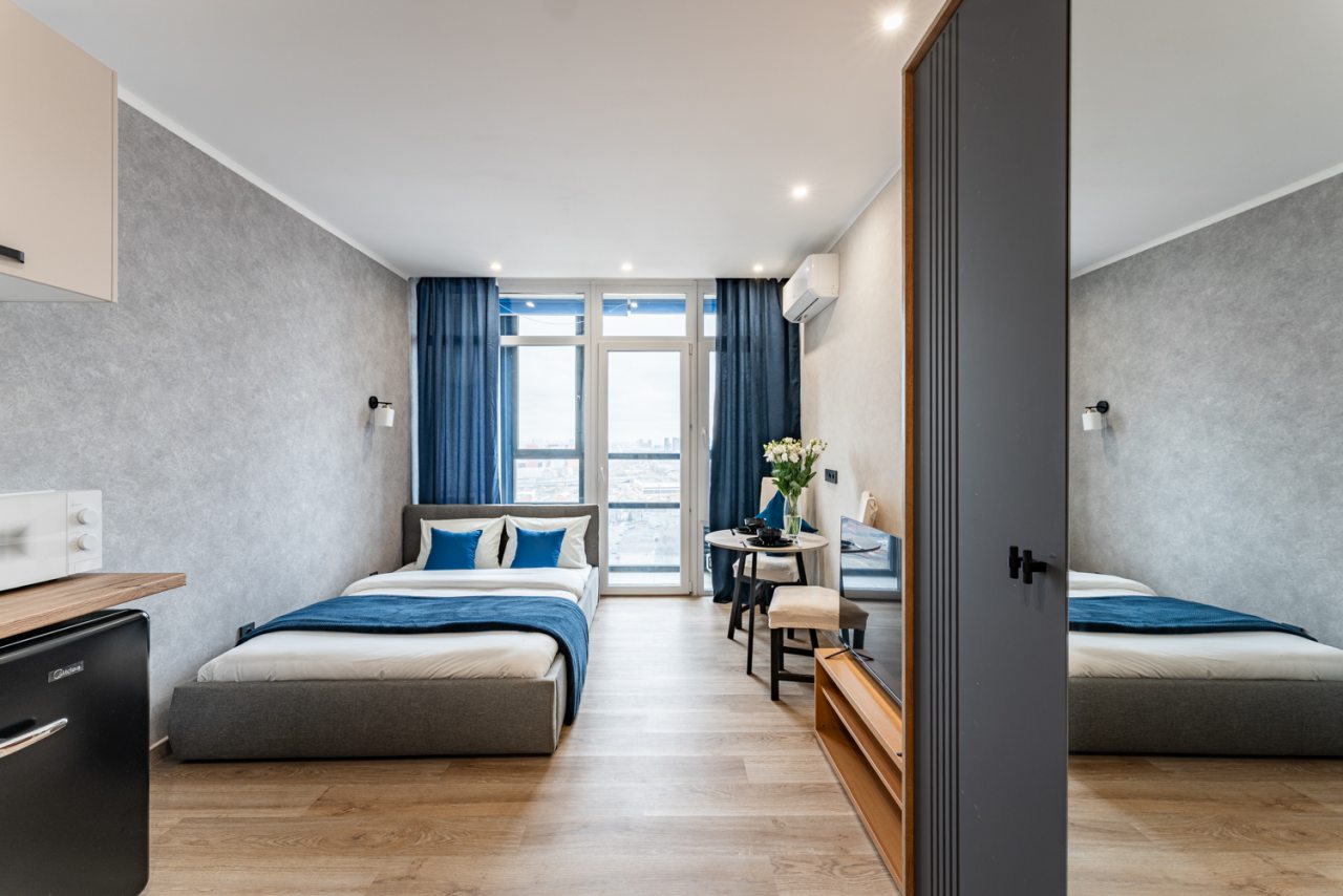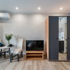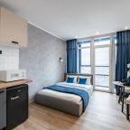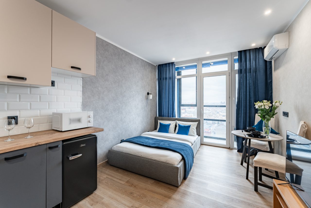 Апартаменты с современным ремонтом оснащены двуспальной кроватью, кондиционером для регулирования температуры, шкафом для хранения вещей, кухонной зоной и лоджией с видом на город. Доступна точка высокоскоростного интернета и ЖК-телевизор с онлайн-кинотеатрами. Санузел оборудован качественной сантехникой.